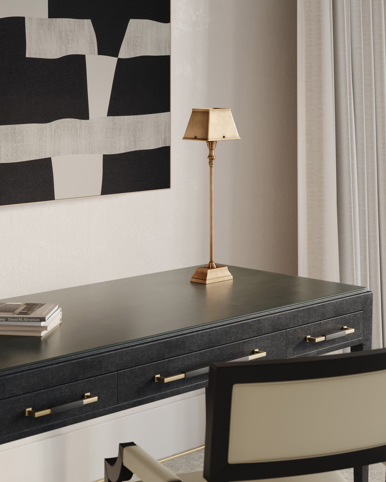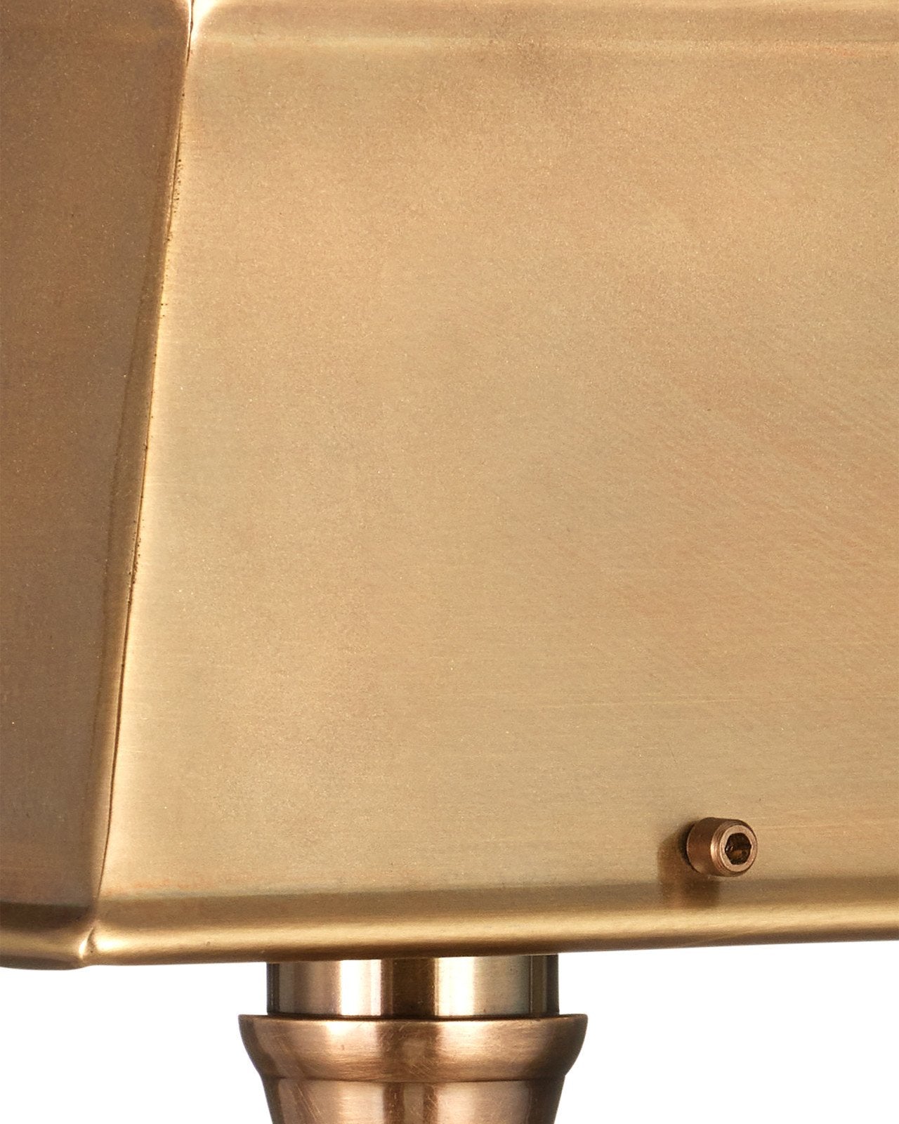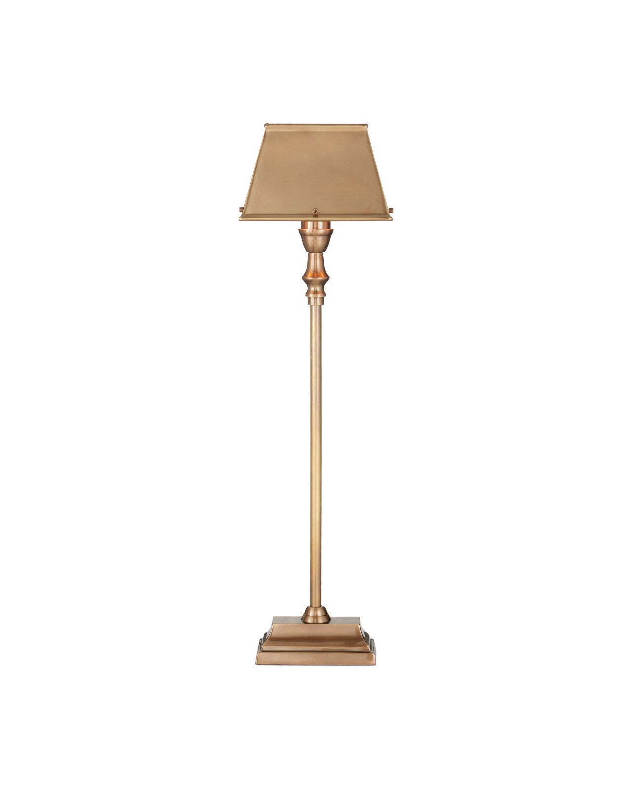 The Geddy Table Lamp has a slim, understated profile made of solid brass in an antique brass finish. A thin stem rises from a stepped rectangular base to support a matching rectangular brass shade. Petite in scale, the lamp is fitted with candelabra bulbs and operated by a line switch, offering a minimalist presence.