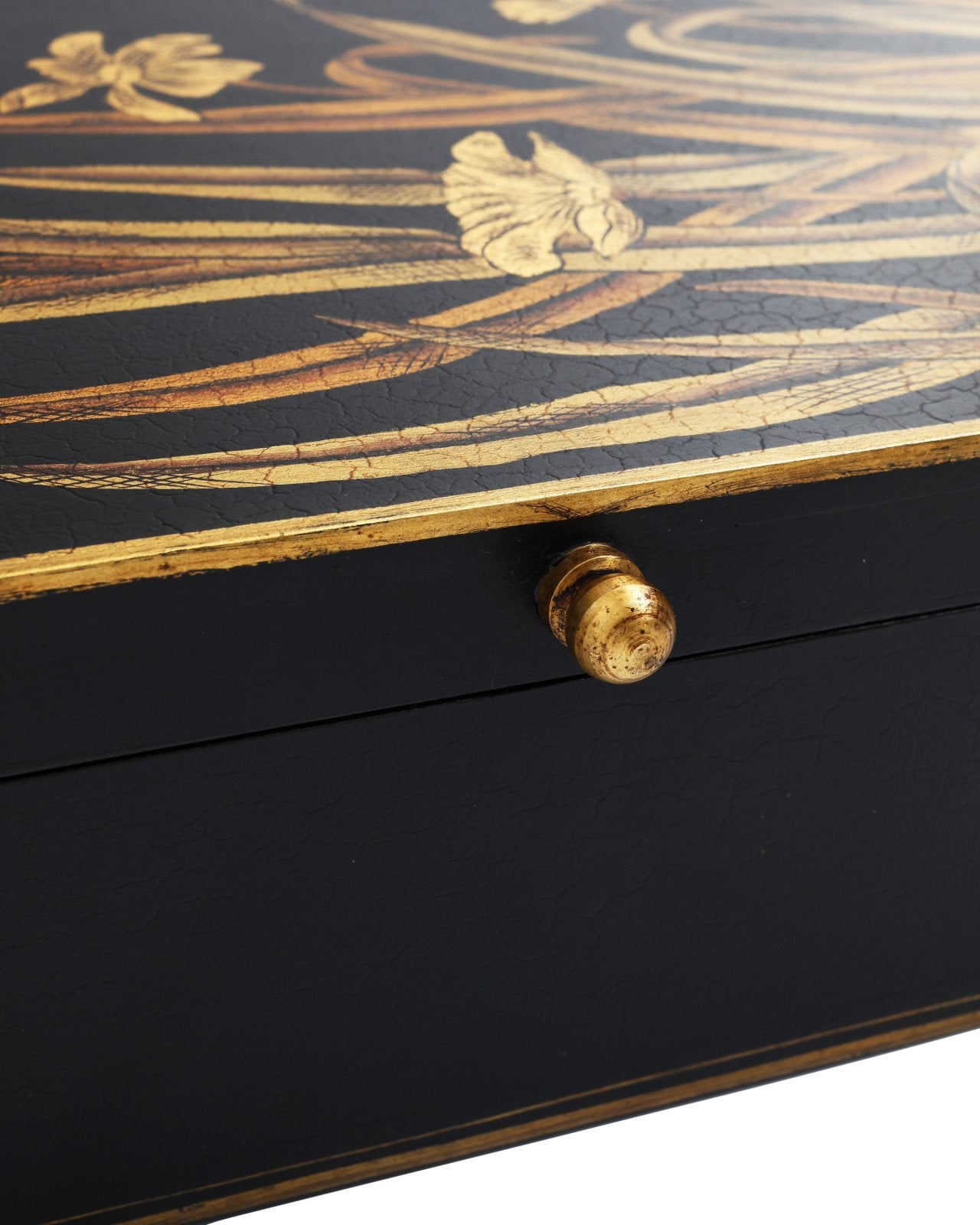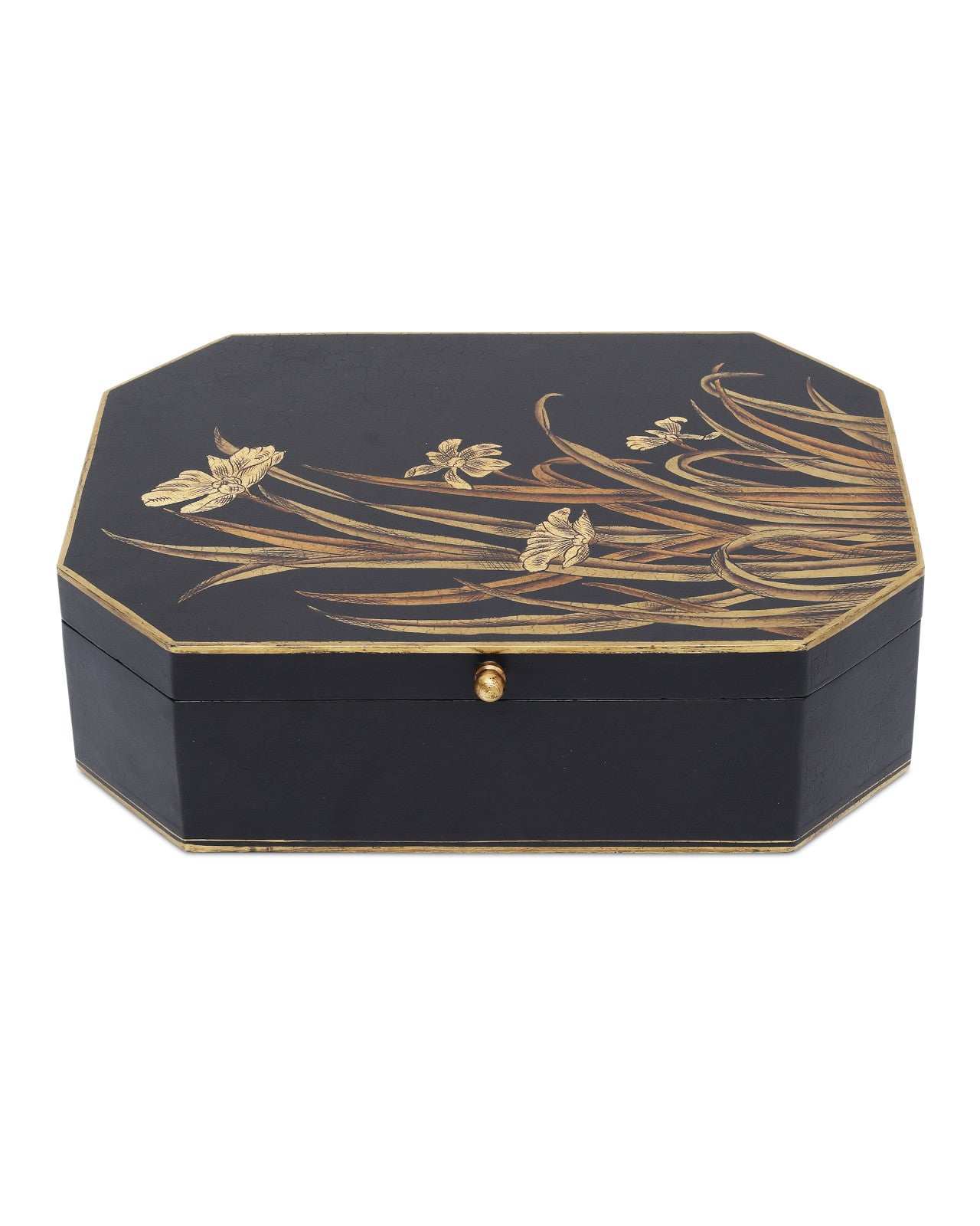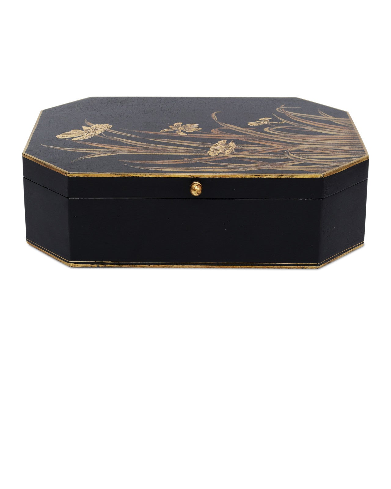 The Glasshouse Tole Decorative Box is crafted from iron in an angular octagonal shape. Its surface has a black ground adorned with floral embellishments painted in layered shades of gold. A small button knob serves as a handle to lift the lid, adding both function and a refined finishing detail. This decorative accent will bring the stylistic feel of Americana into a space. Due to the artisanal finish, the surface of each accessory could differ slightly.