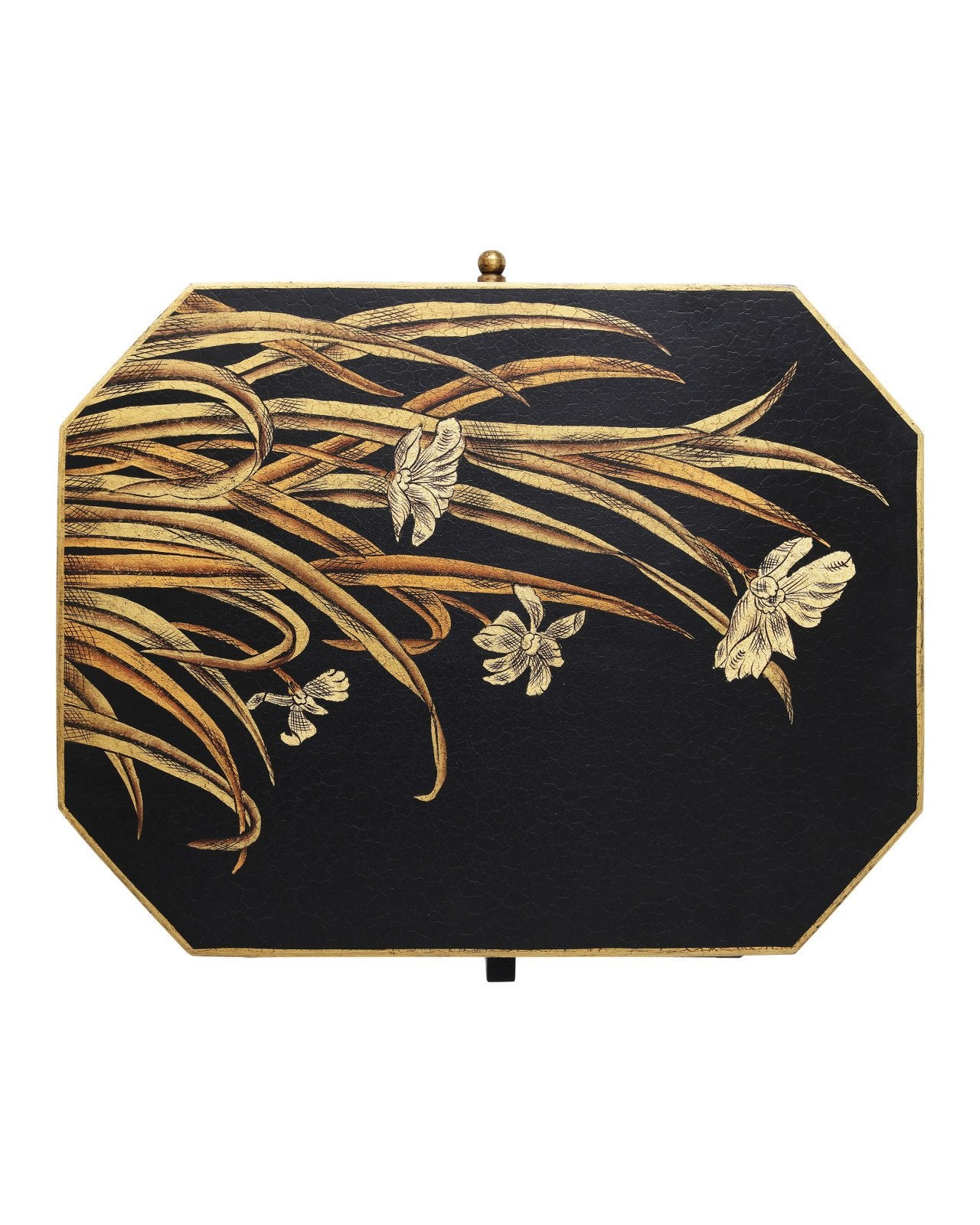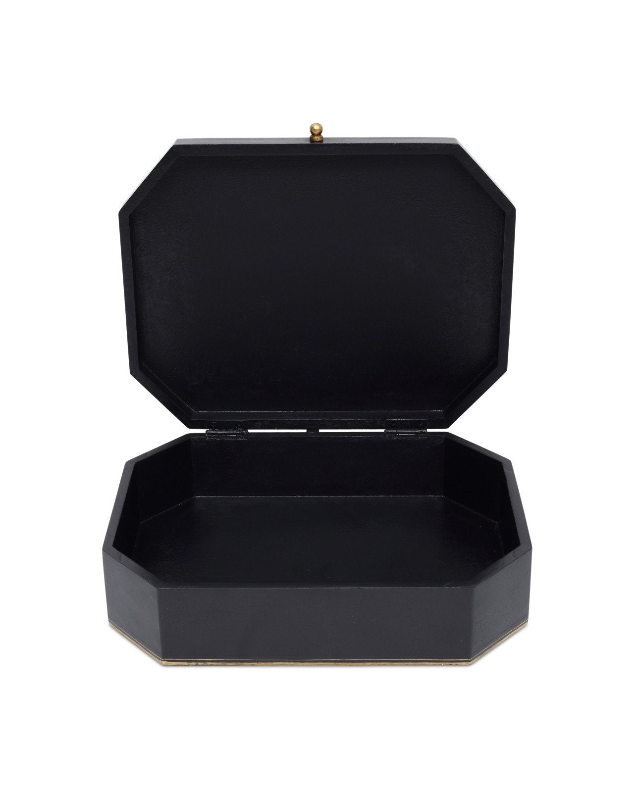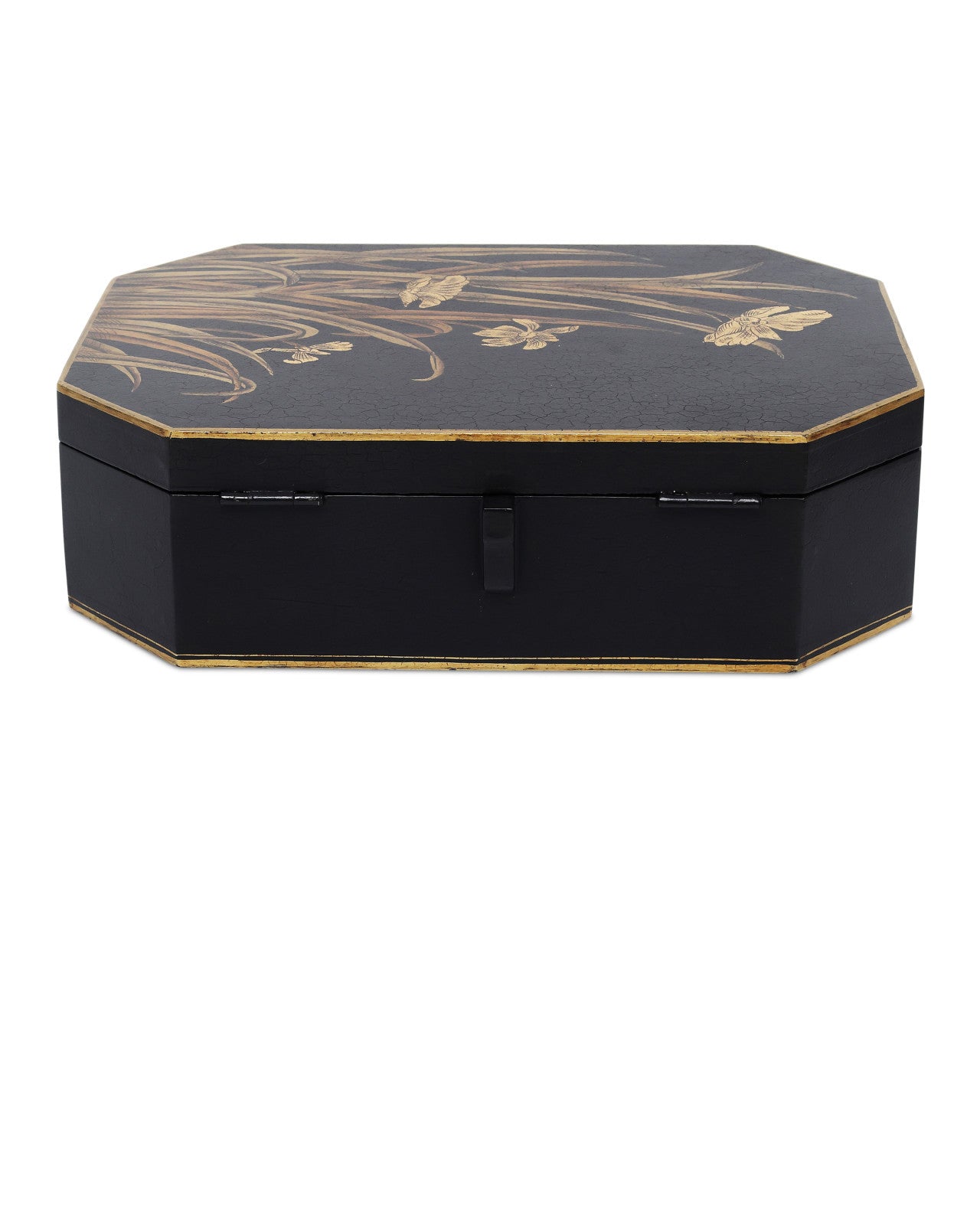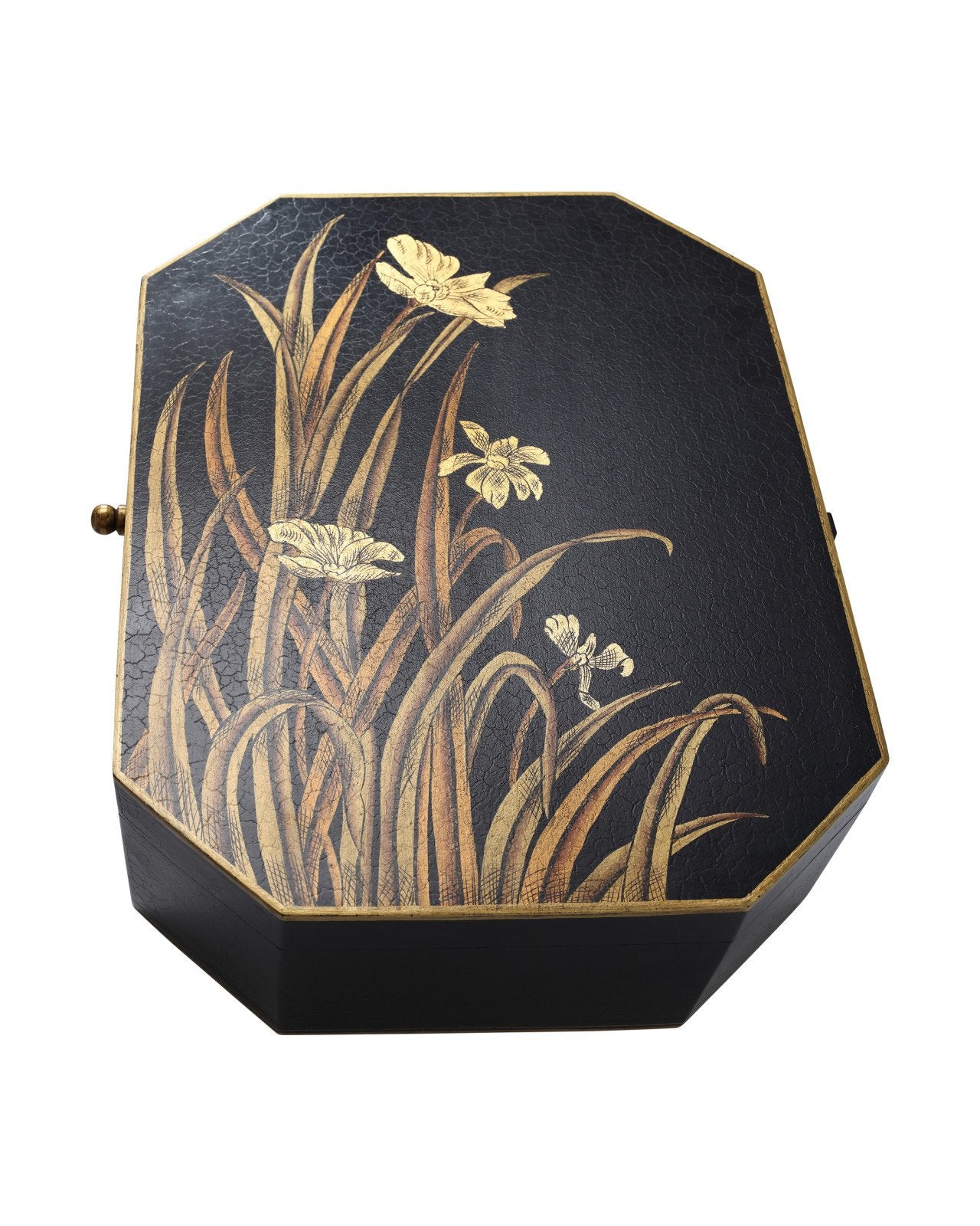 The Glasshouse Tole Decorative Box is crafted from iron in an angular octagonal shape. Its surface has a black ground adorned with floral embellishments painted in layered shades of gold. A small button knob serves as a handle to lift the lid, adding both function and a refined finishing detail. This decorative accent will bring the stylistic feel of Americana into a space. Due to the artisanal finish, the surface of each accessory could differ slightly.