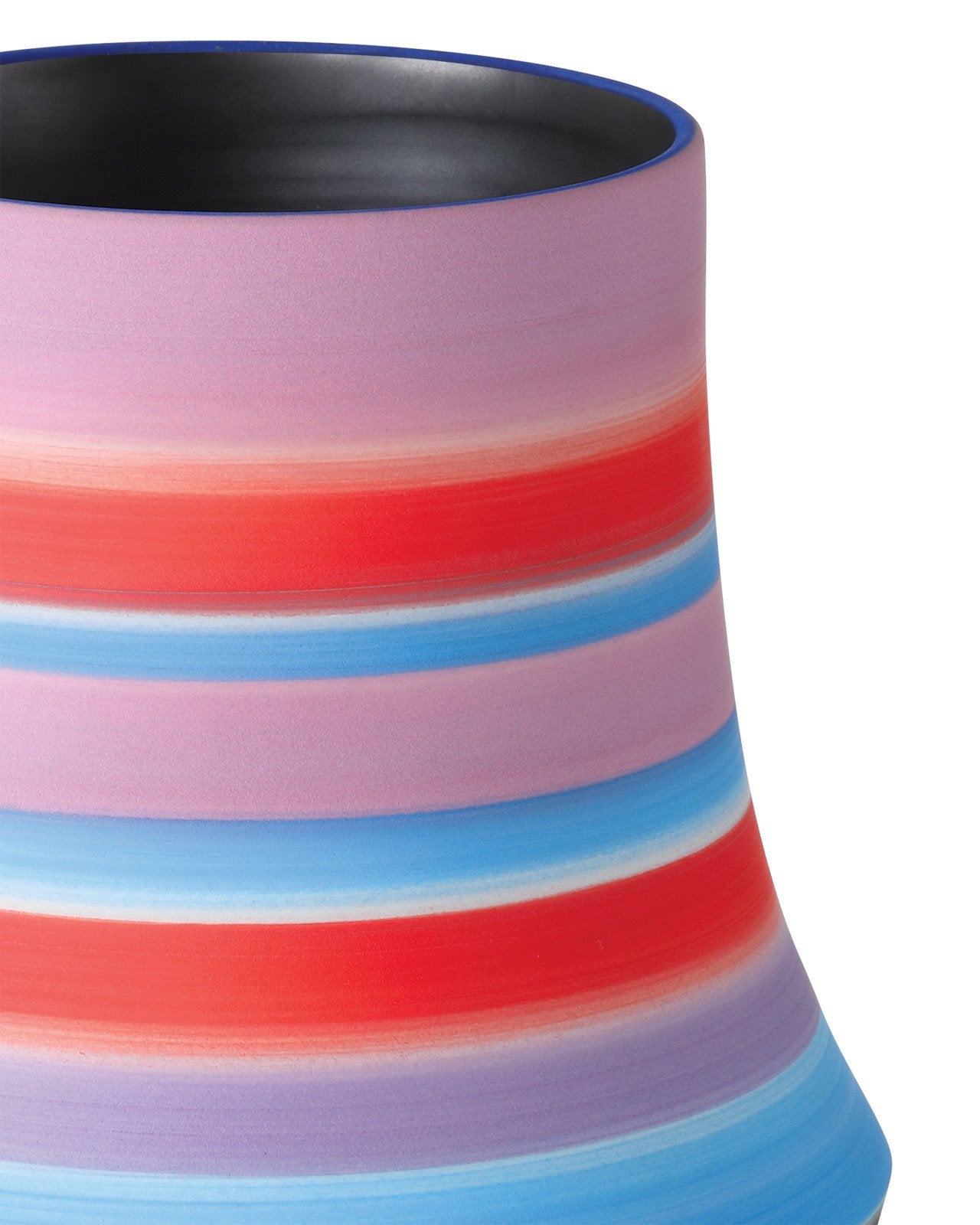 The Happy 80's Large Bright Blue & Red Vase captures the playful spirit of the 1980s with a modern twist. The hand-thrown porcelain vase features unique striations of brilliant blue and lively red that were skillfully applied while the vase was spinning on the potter's wheel. The resulting patterns highlight the artisanal craftsmanship behind each piece, as painting lines of color so uniformly while the vases are spinning is a painstaking process. Due to the artisanal painting, the surface of each accessory could differ slightly.