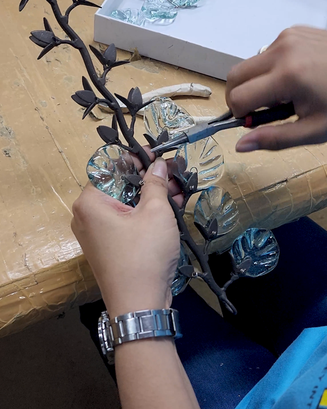 The Herbary Chandelier is a sculptural piece shaped by hanging branches of recycled glass leaves. The cut pieces that cascade closer to the bulbs absorb a greater degree of the light to read as clearer, while the outer stems retain more of the pale blue/green color of the glass from which the leaves are made. The arcing octagonal frame has hints of Asian influences given each section bends slightly and creates cross-hatches where each rod attaches to the next. The fixture has six lights and is dimmable.