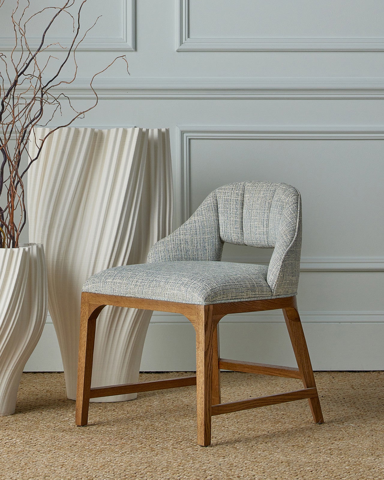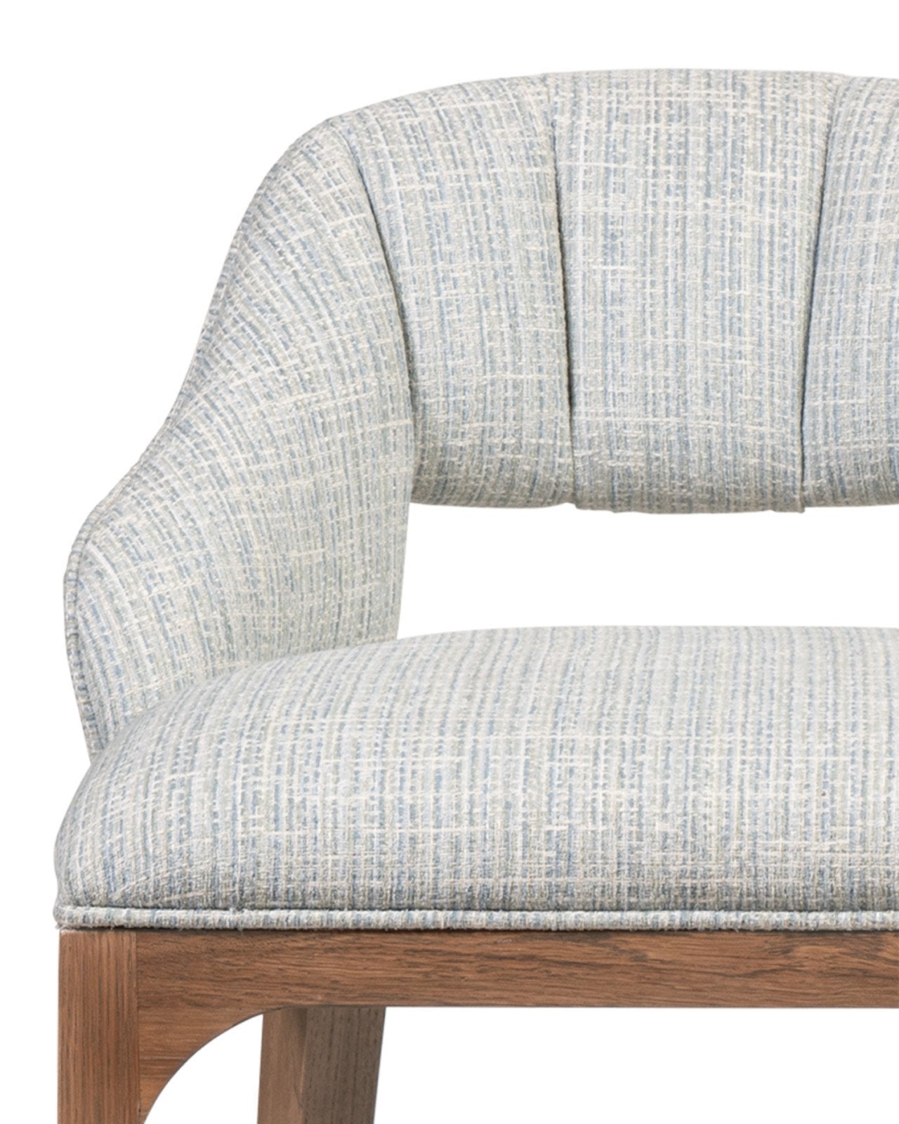 The Inga Chair covered in a Greenlight Powder fabric has an upholstered back and seat that sits nimbly atop a solid oak frame in a morel brown finish. The paleness of the fabric and the warmth of the wood bring a soft contrast to the slipper chair that is the prefect size to slide under a dressing table or a desk.