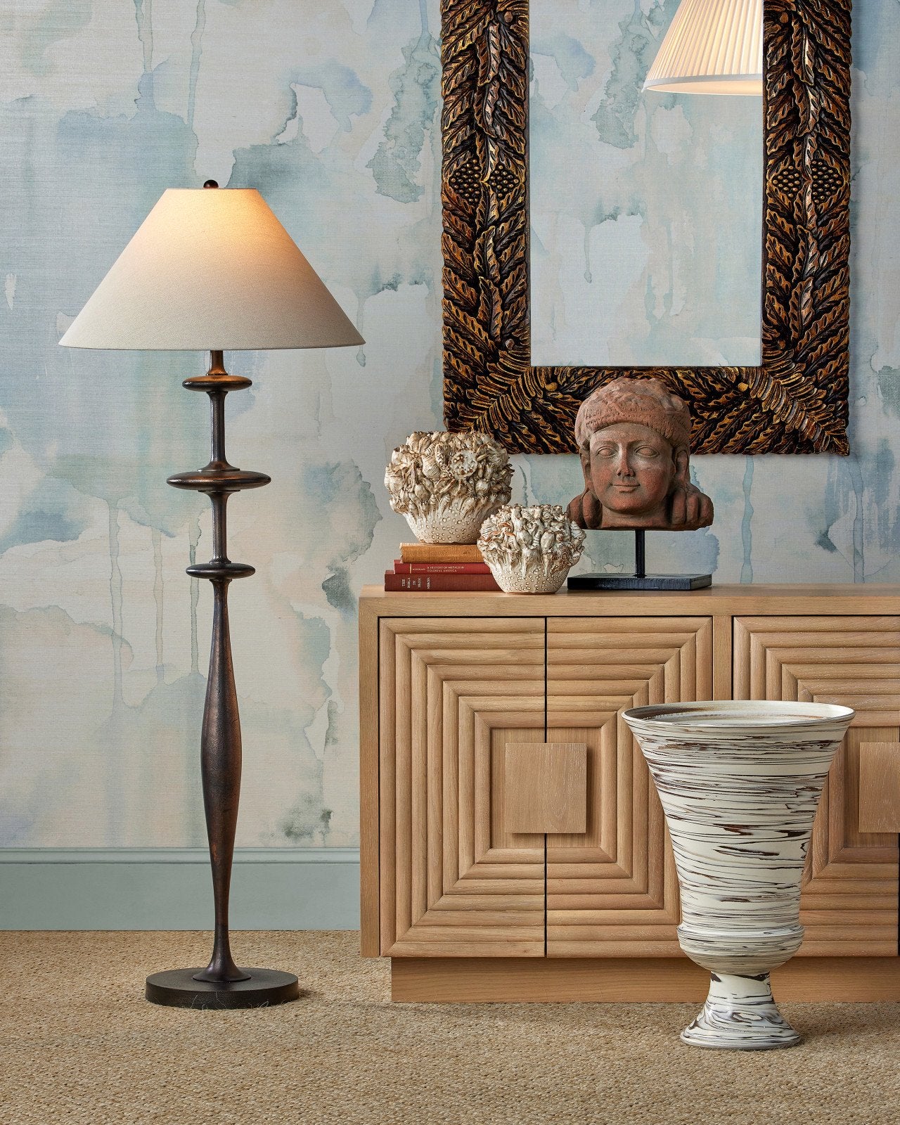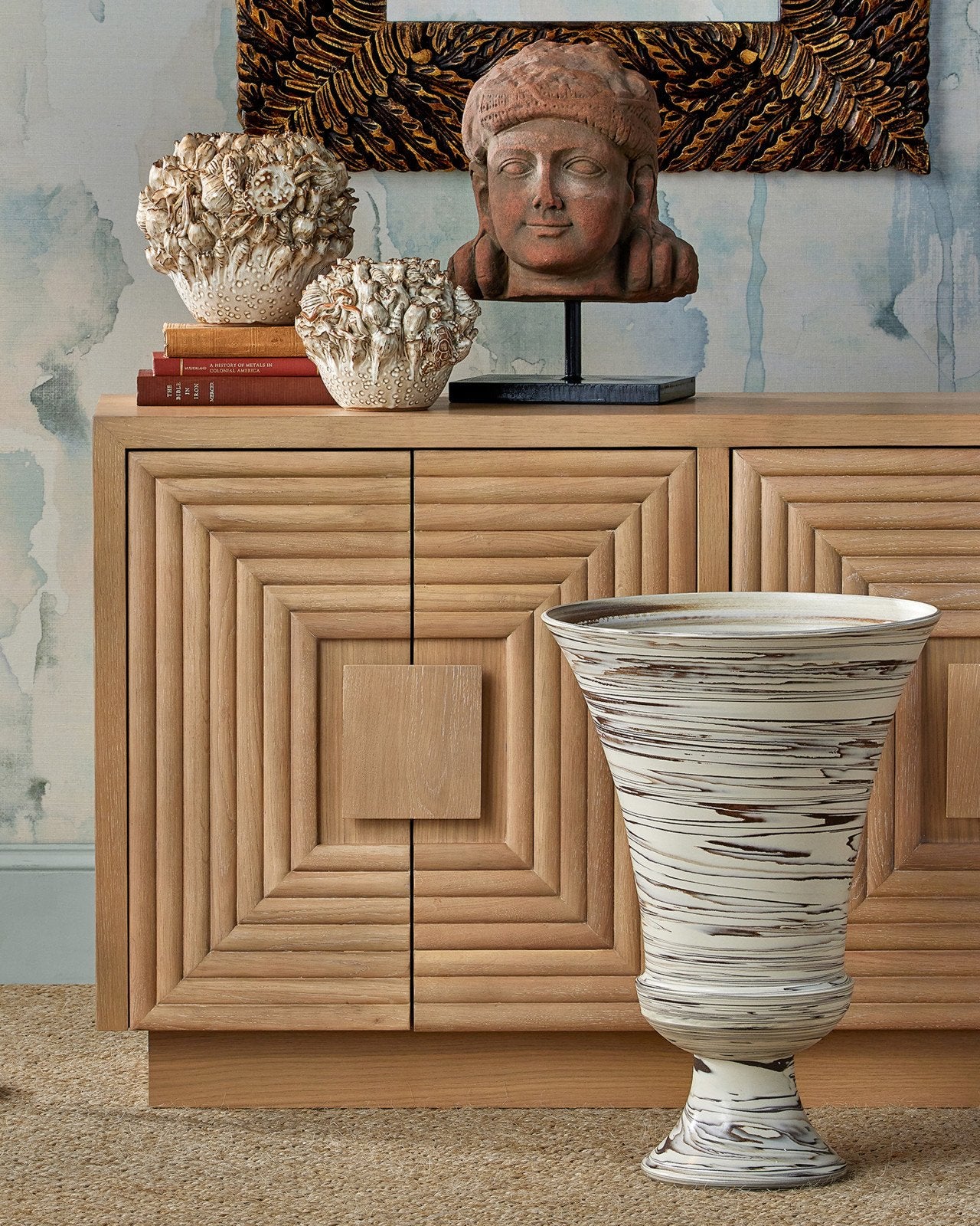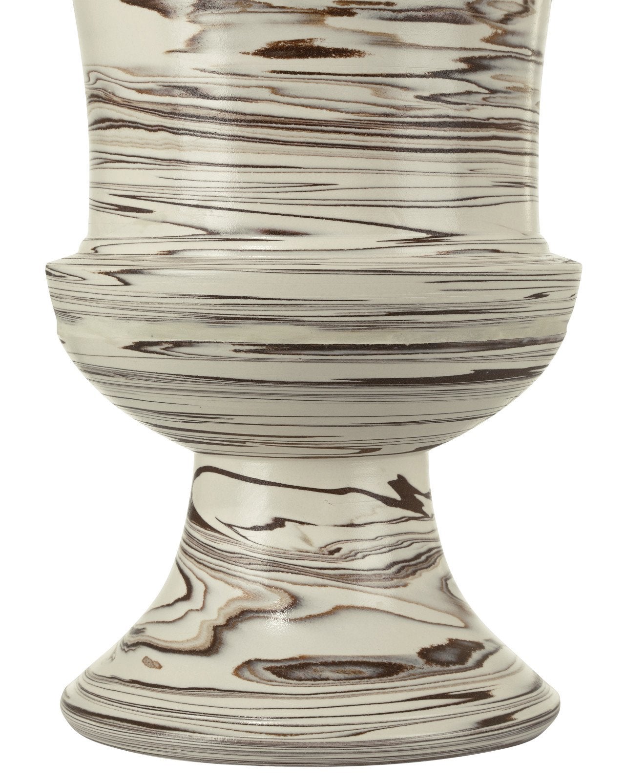 The Jejune Beige Large Footed Vase is an impressive oversized urn-shaped vessel that stands 25 inches tall. Its beige surface is adorned with swirling patterns of brown that are created during a terres mêlées production process when the two colors of clay are overlaid while the vase is spinning. This means the pattern will show on the inside and outside of the vessel, which is not watertight and is for indoor use only. Due to the artisanal treatment, the surface of each accessory could differ slightly.