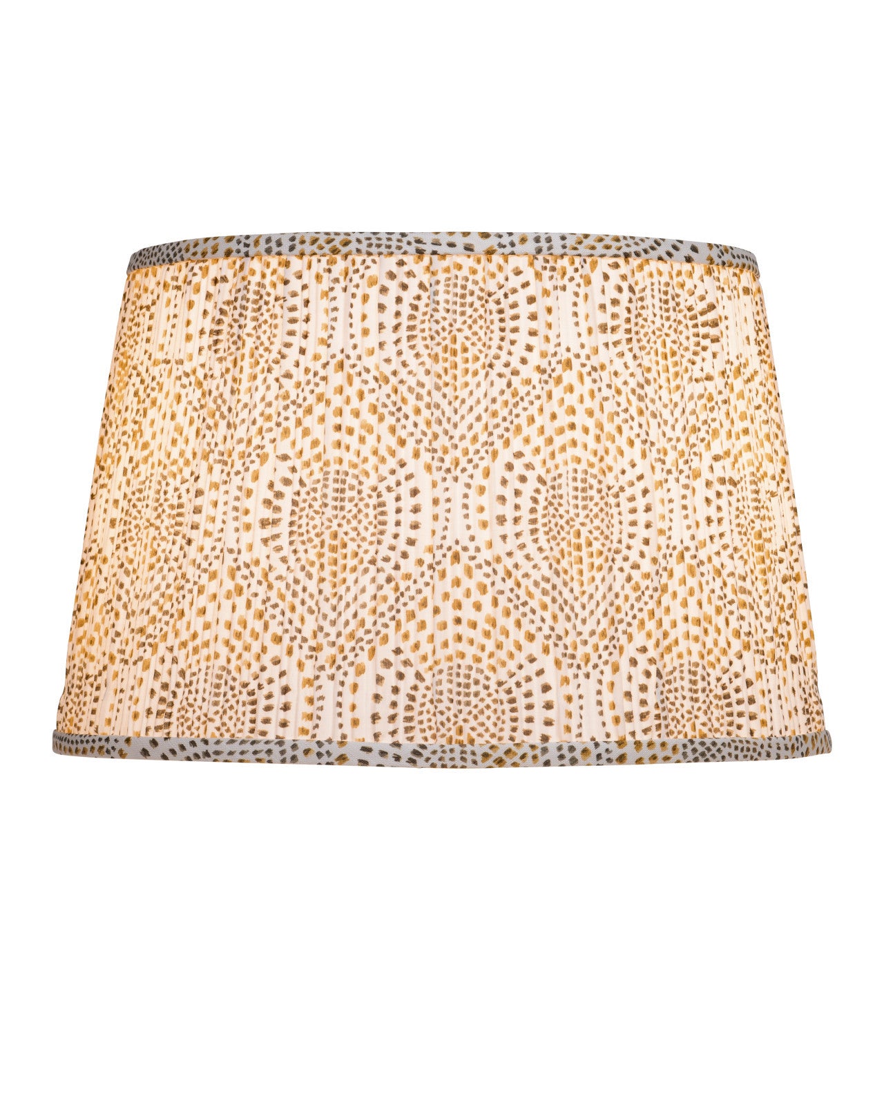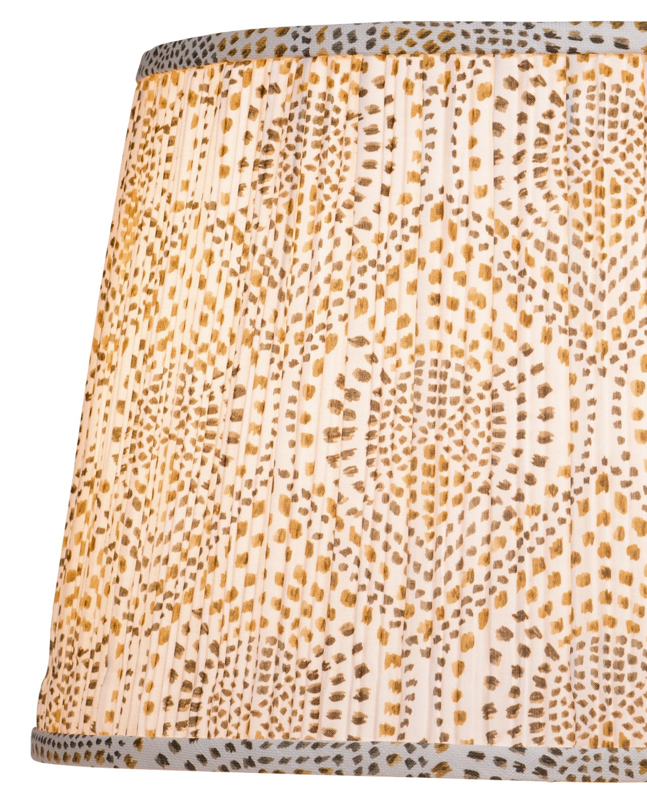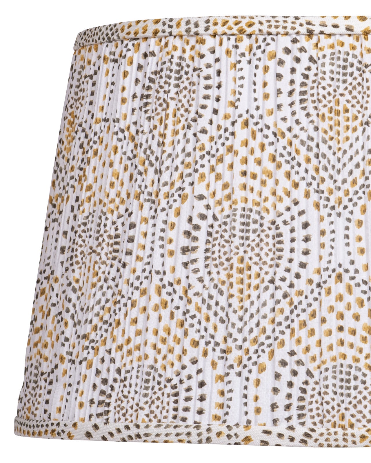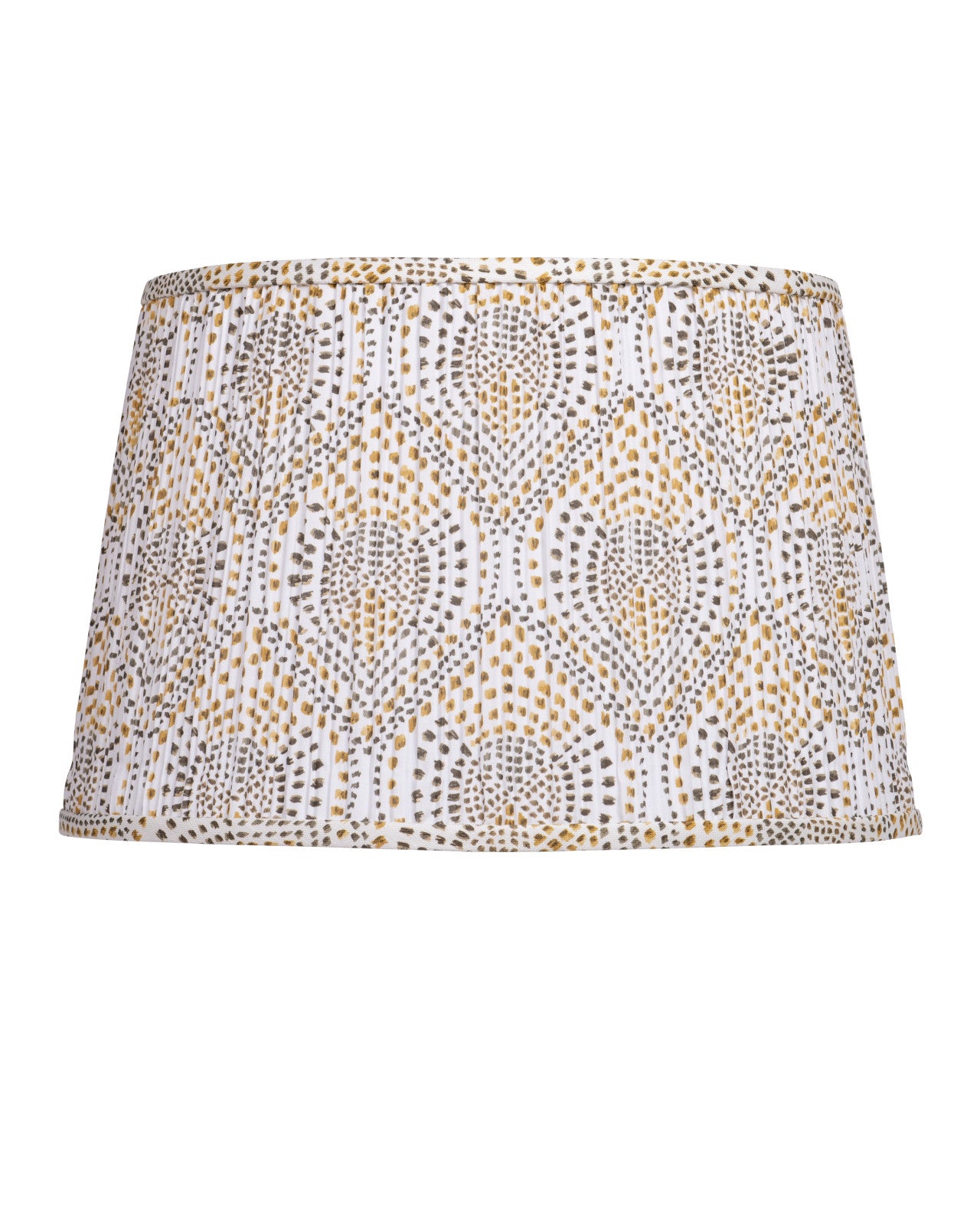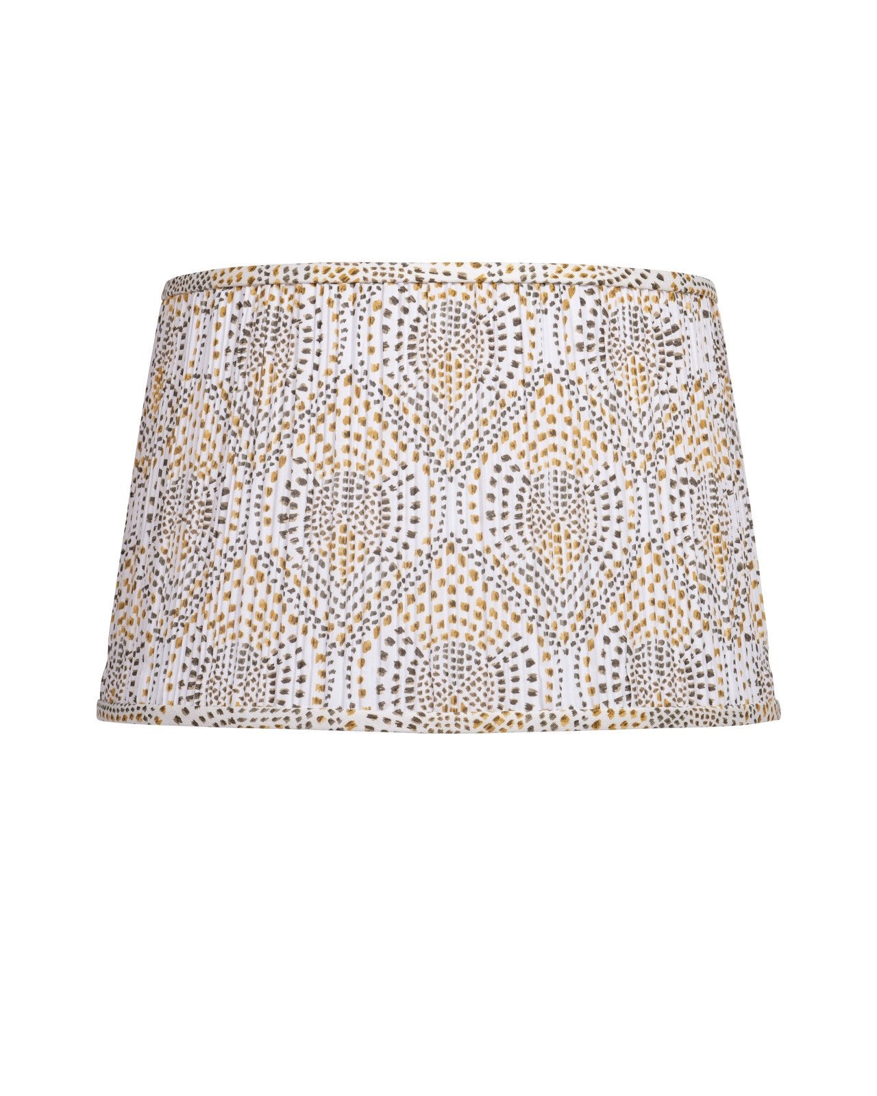 A block-print design of abstracted yellow and brown dots adorns this tapered, pleated mid-sized lampshade from design partner Lacefield Designs.