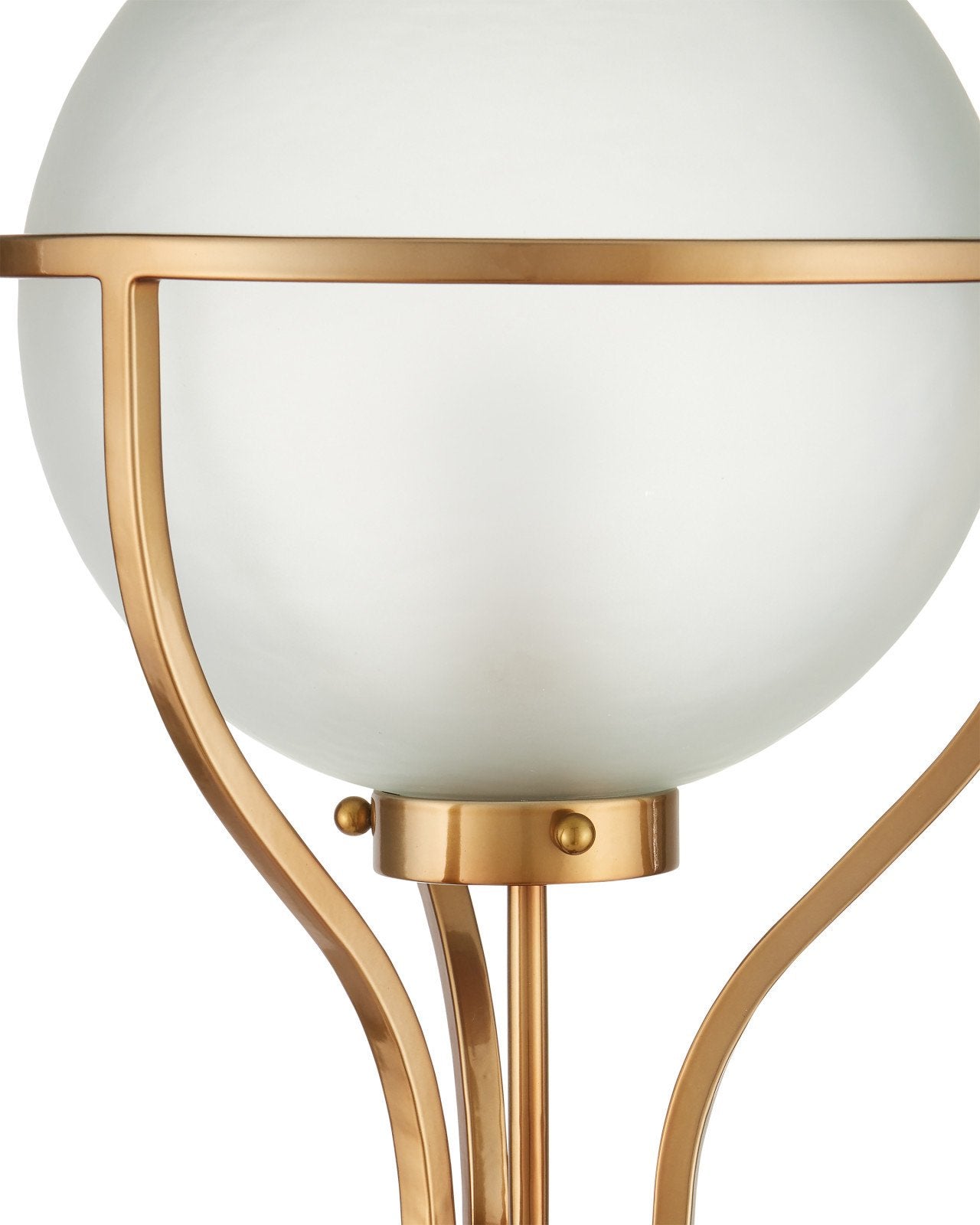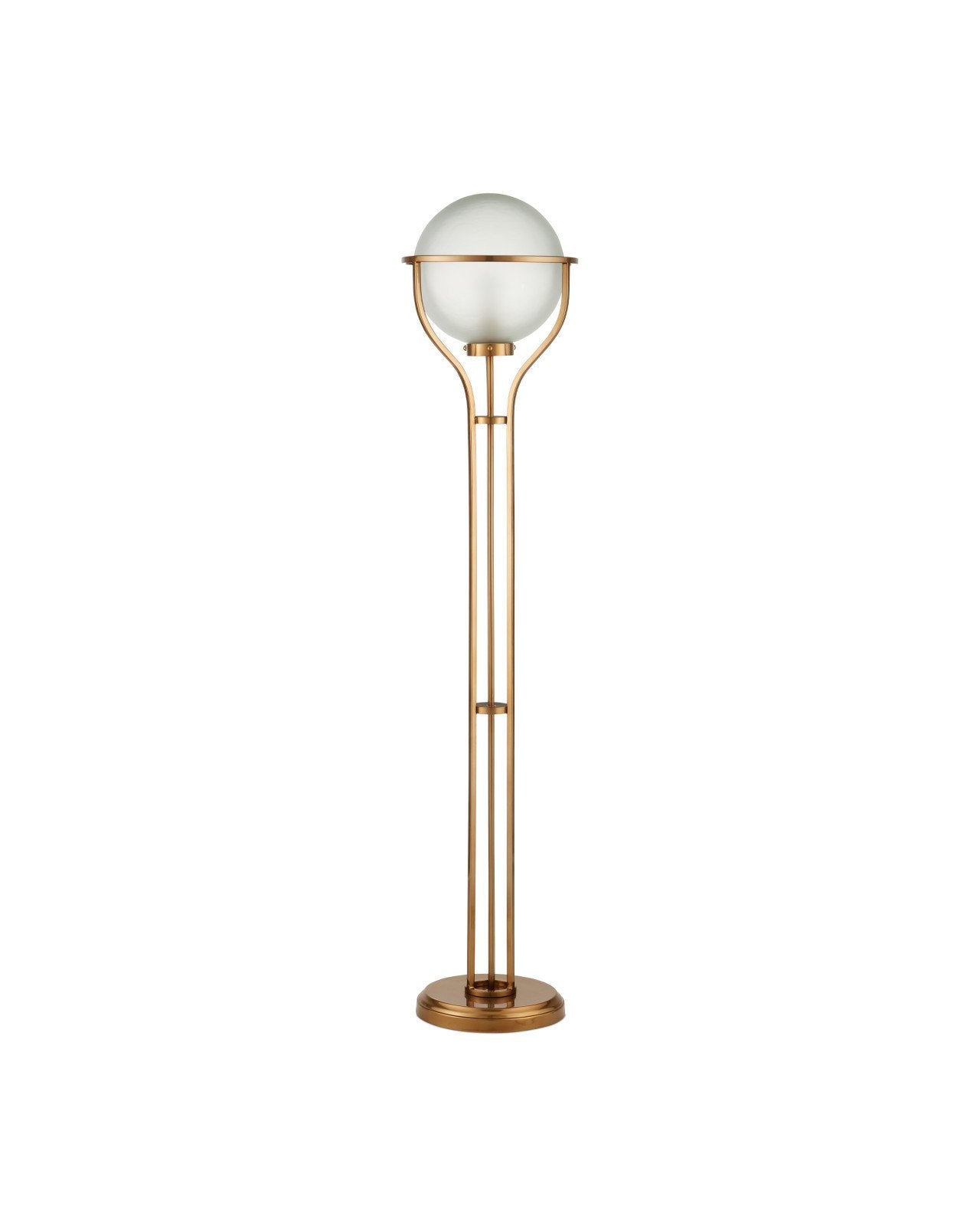 The Metropolis Floor Lamp draws inspiration from Parisian streetlights; its open metal body swelling outward to cradle a frosted glass globe. Finished in metallic champagne, the frame has an Art Deco sensibility with a refined glow. A foot switch adds convenient functionality to the elegant design.