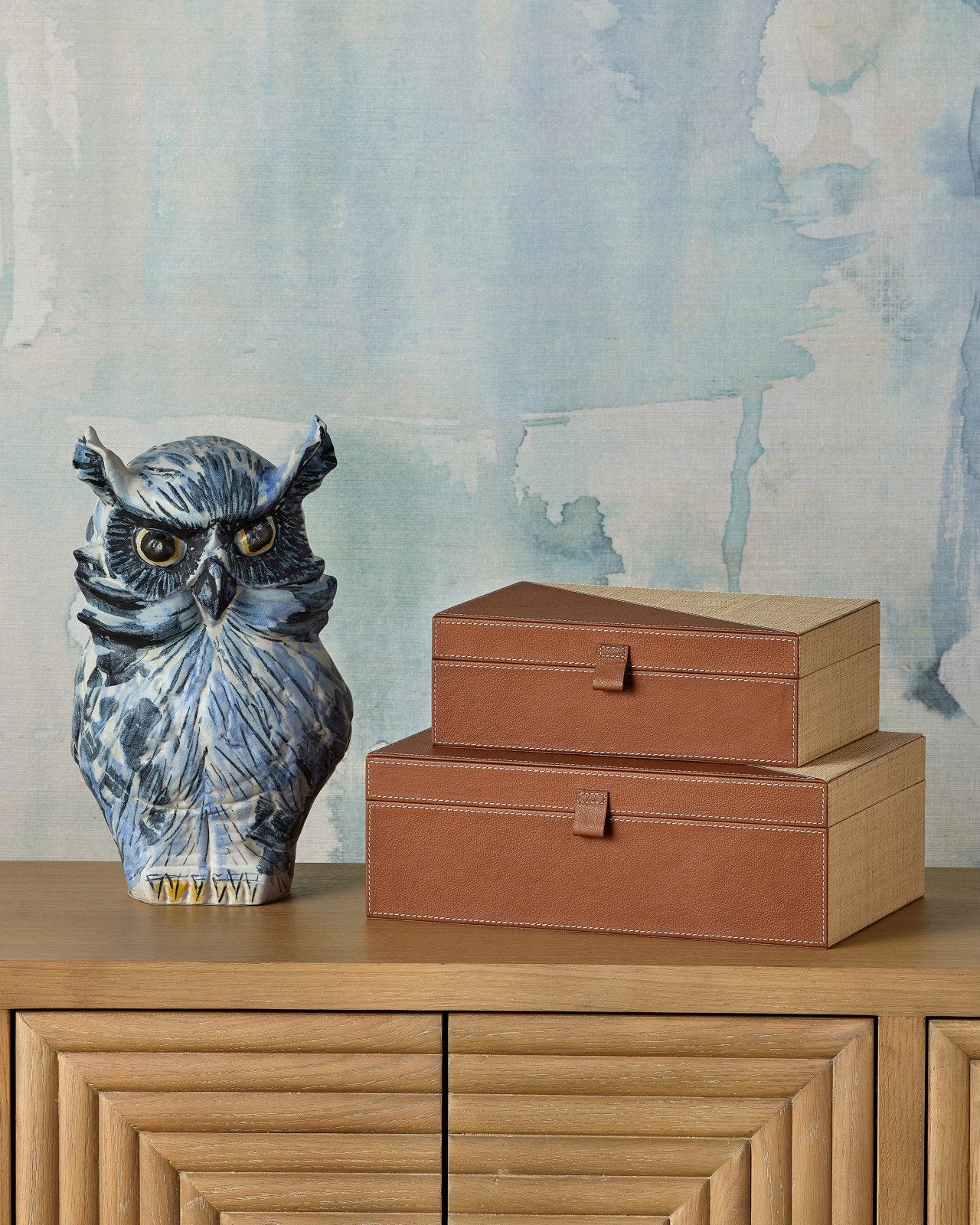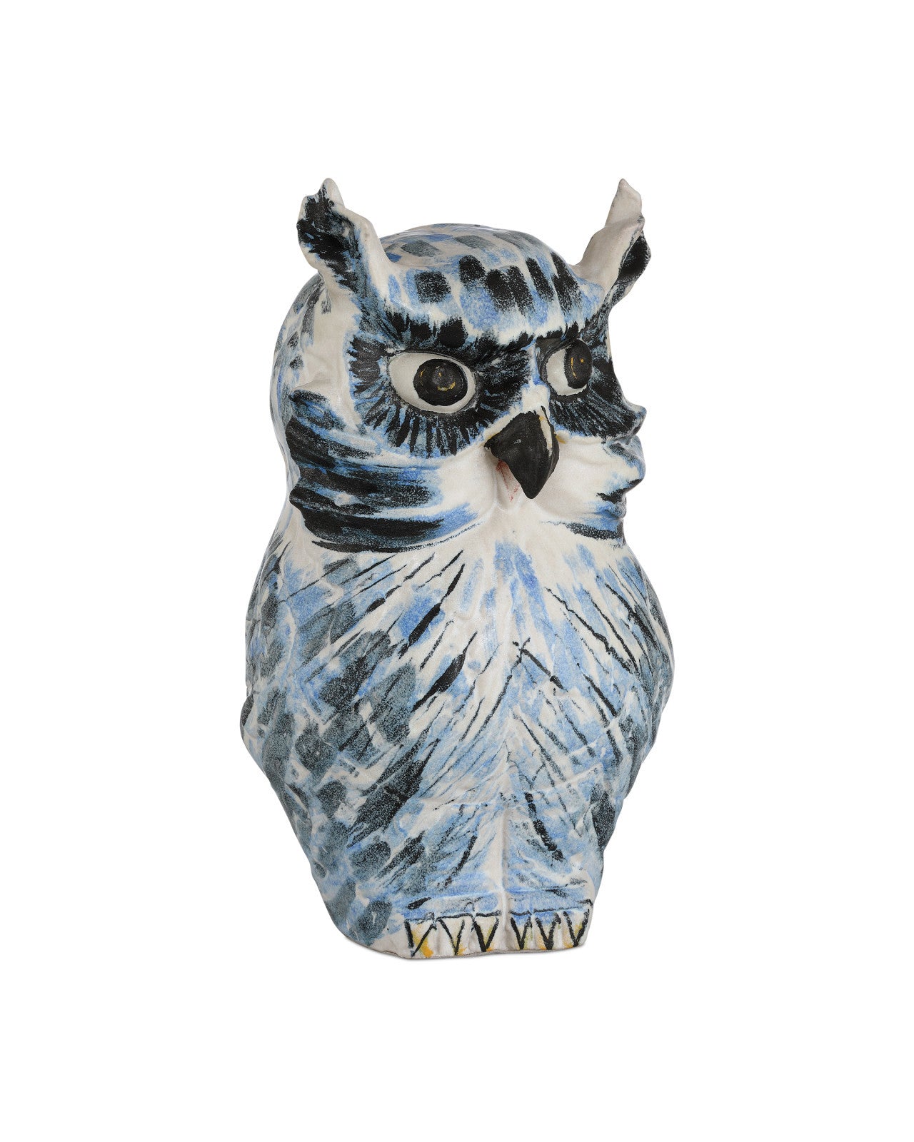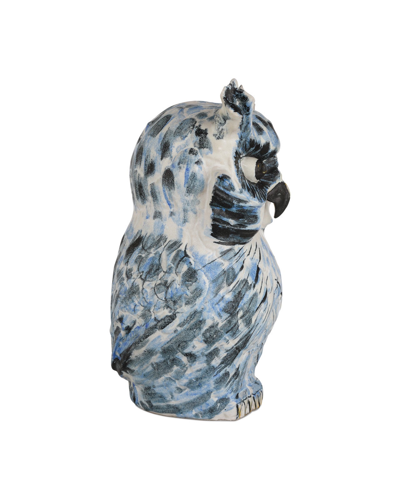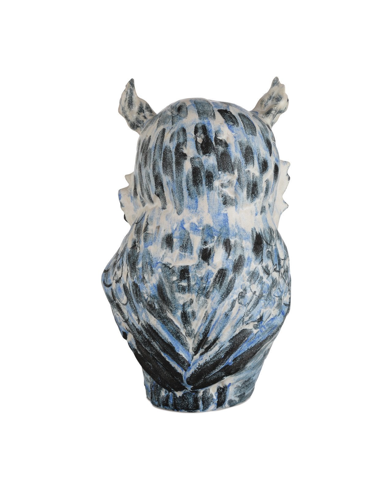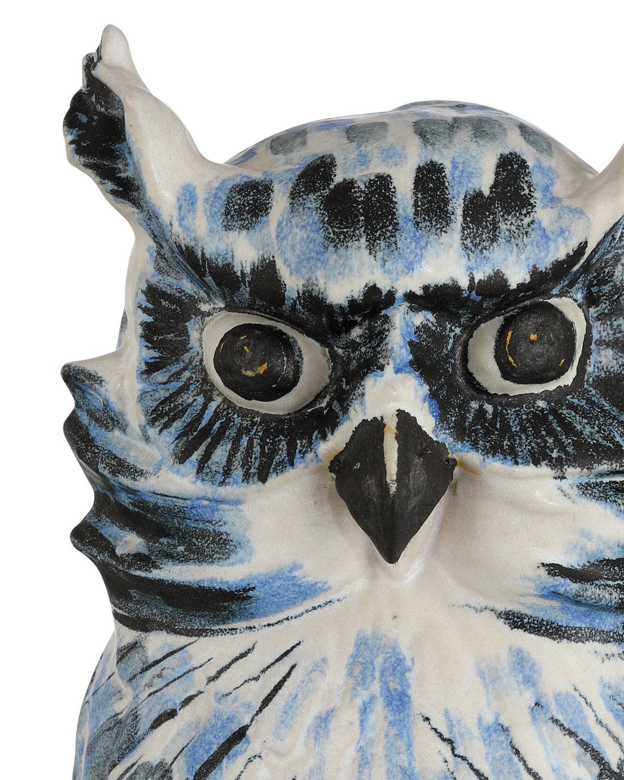 The Mina the Owl sculpture is crafted from porcelain and hand-painted in shades of blue and white. Standing over 15 inches tall, this overscale decorative accessory has unique character, as no two are painted exactly alike. The brushstrokes create the impression of layered plumage, giving the owl a lifelike, feathery feel.
