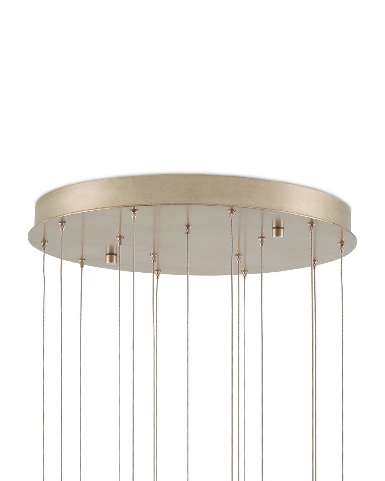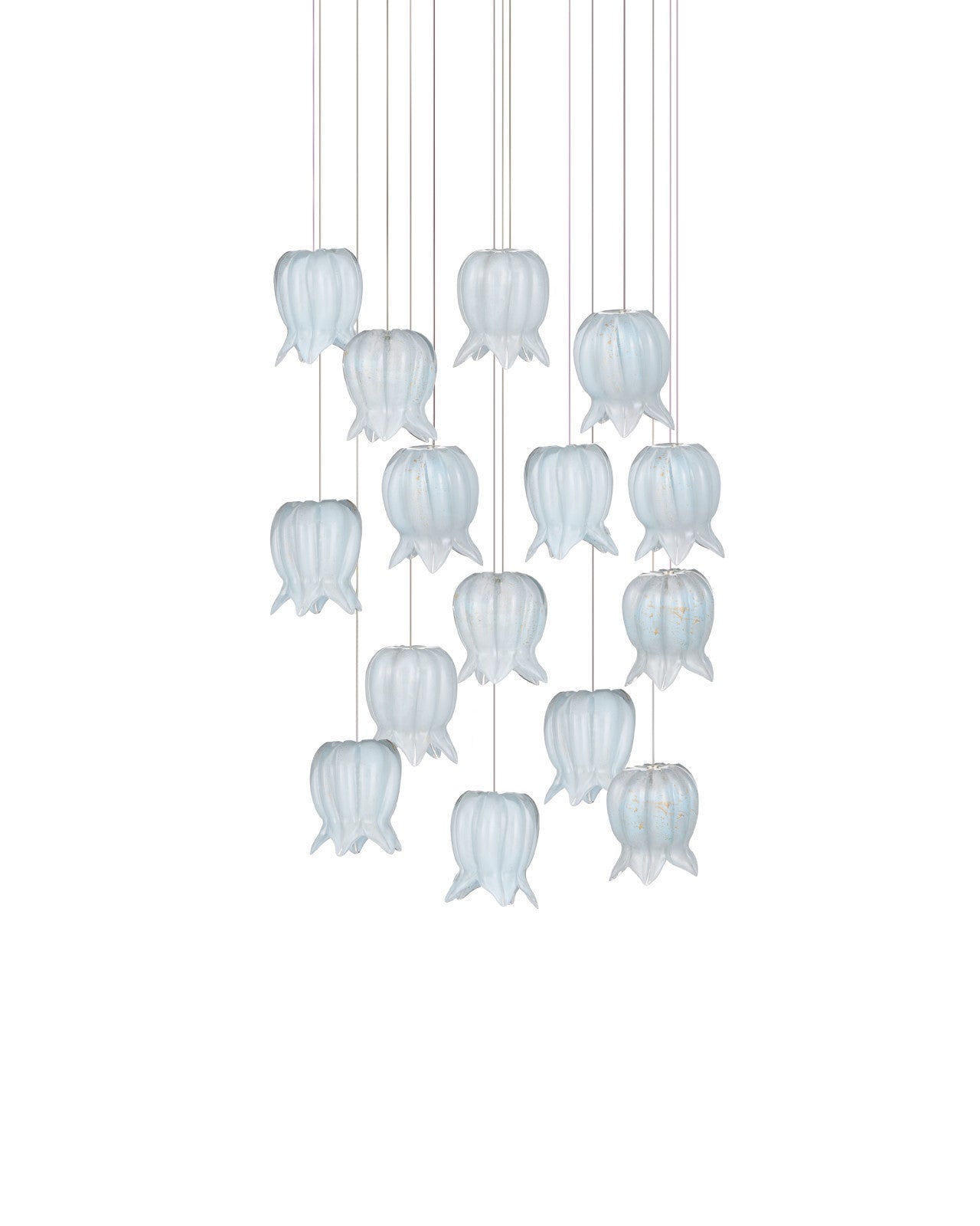 The Polpo Blue 15-Light Round Multi-Drop Pendant has bell-shaped shades that echo the form of inverted lily-of-the-valley flowers. Made of blue art glass with pronounced stippling, each shade has subtle variations that make it unique. The textured surfaces give the glass a Venetian-inspired character, adding depth and richness to the design.