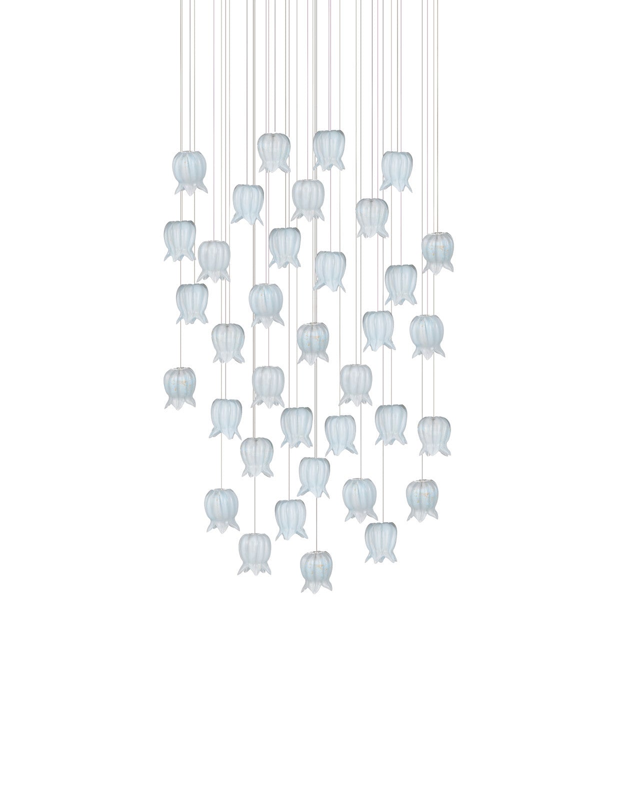The Polpo Blue 36-Light Round Multi-Drop Pendant has bell-shaped shades that echo the form of inverted lily-of-the-valley flowers. Made of pale blue art glass with pronounced stippling, each shade has subtle variations that make it unique. The textured surfaces give the glass a Venetian-inspired character, adding depth and richness to the design.