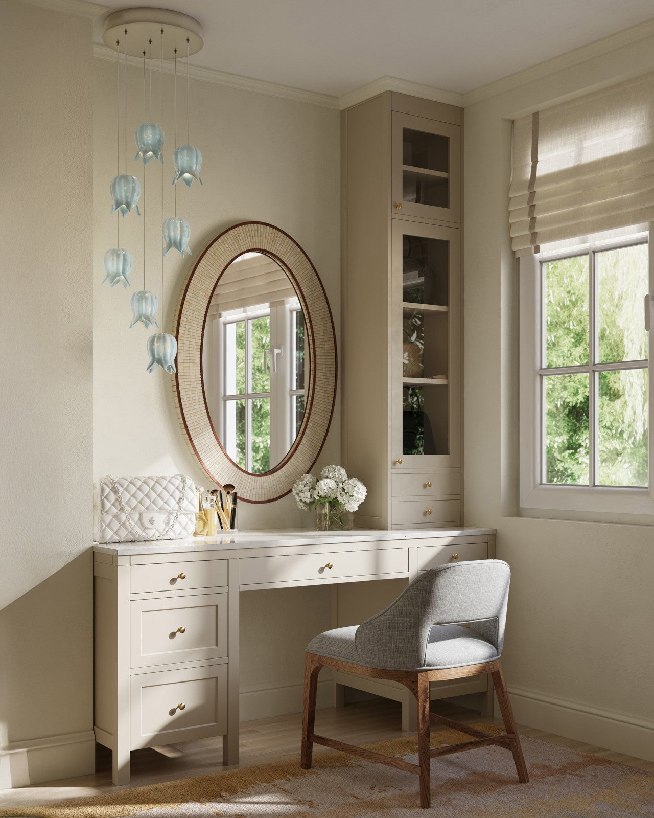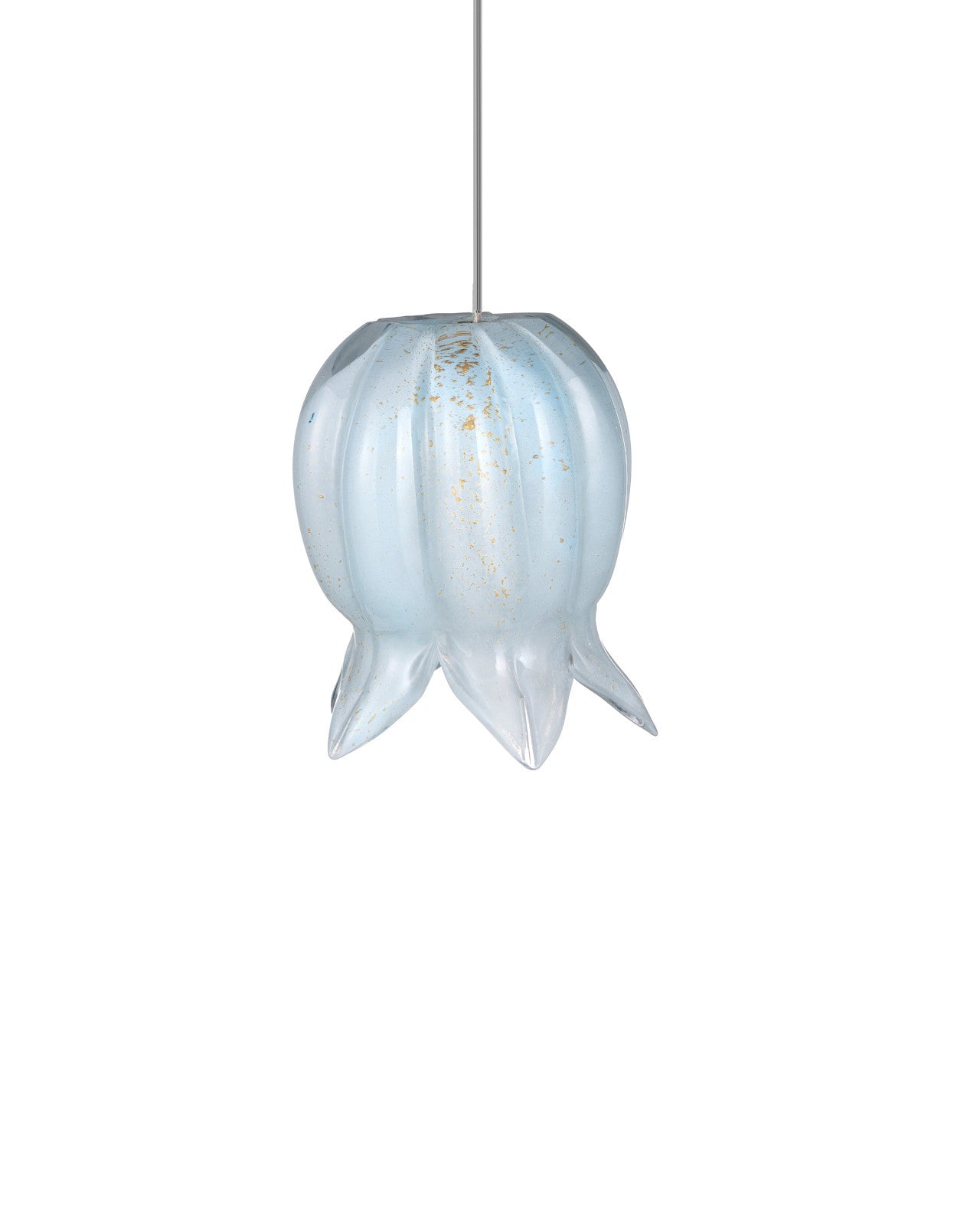 The Polpo Blue 7-Light Round Multi-Drop Pendant has bell-shaped shades that echo the form of inverted lily-of-the-valley flowers. Made of pale blue art glass with pronounced stippling, each shade has subtle variations that make it unique. The textured surfaces give the glass a Venetian-inspired character, adding depth and richness to the design.