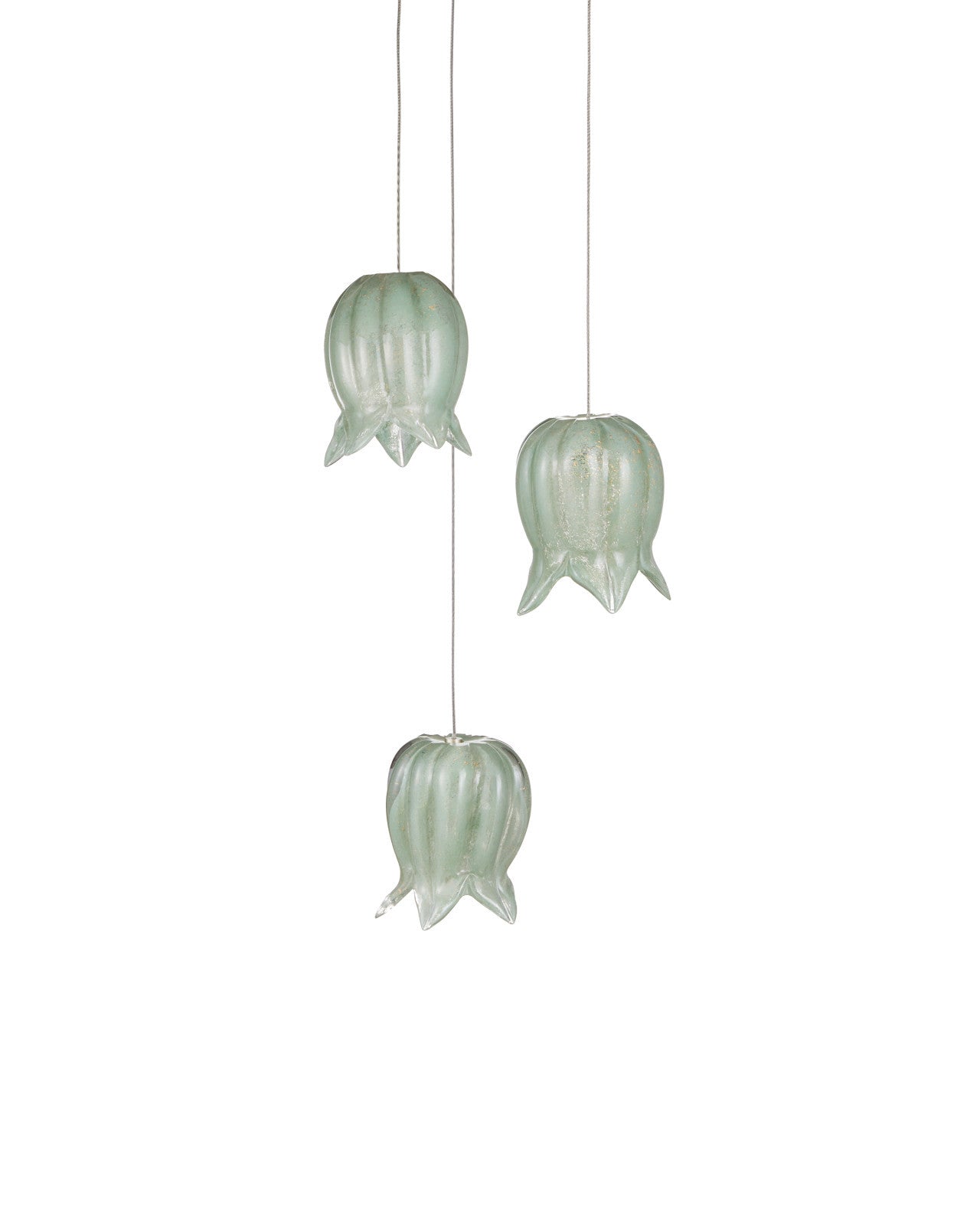 The Polpo Green 3-Light Round Multi-Drop Pendant has bell-shaped shades that echo the form of inverted lily-of-the-valley flowers. Made of pale green art glass with pronounced stippling, each shade has subtle variations that make it unique. The textured surfaces give the glass a Venetian-inspired character, adding depth and richness to the design.