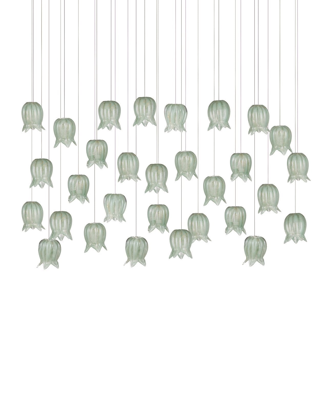 The Polpo Green 30-Light Linear Multi-Drop Pendant has bell-shaped shades that echo the form of inverted lily-of-the-valley flowers. Made of pale green art glass with pronounced stippling, each shade has subtle variations that make it unique. The textured surfaces give the glass a Venetian-inspired character, adding depth and richness to the design.