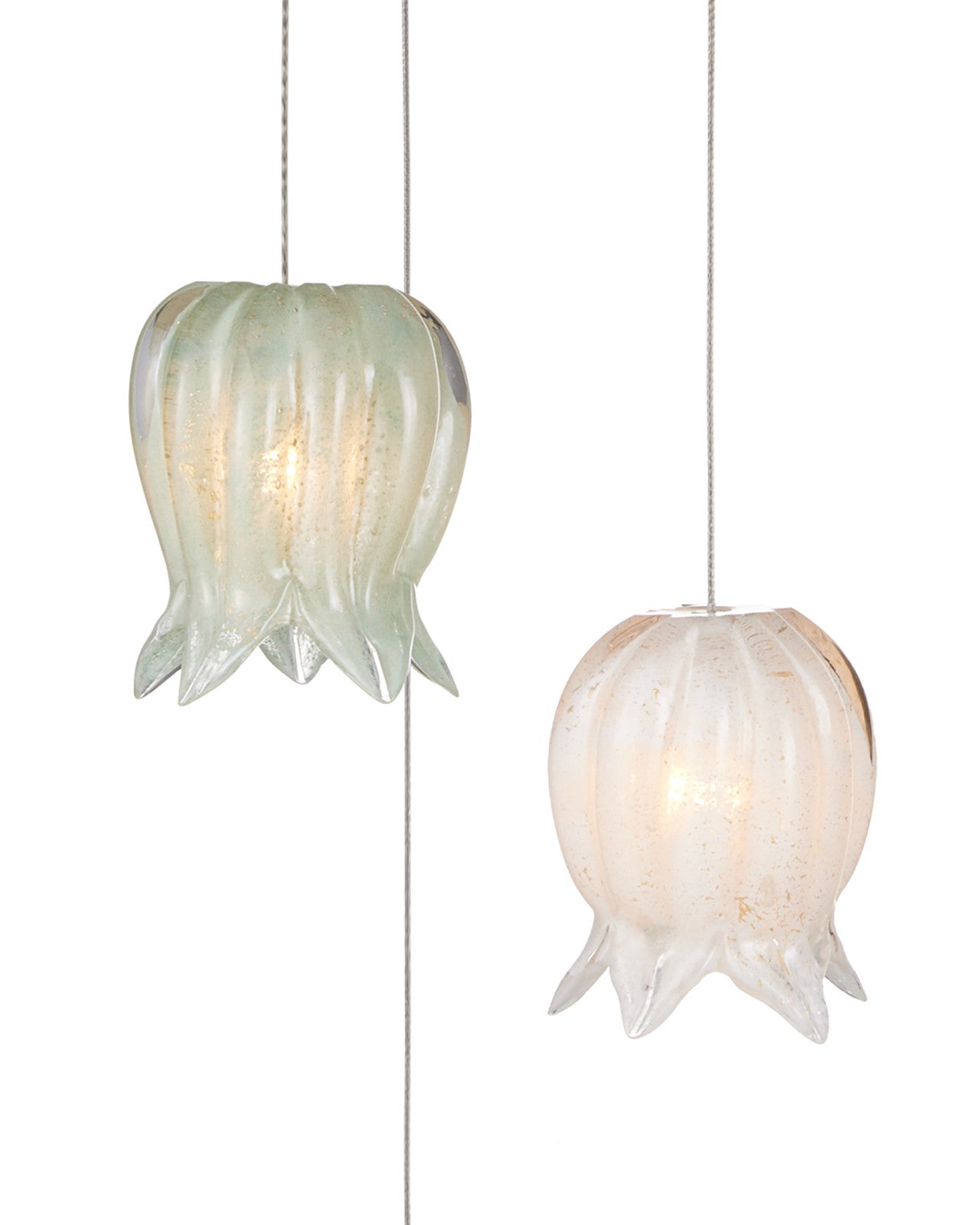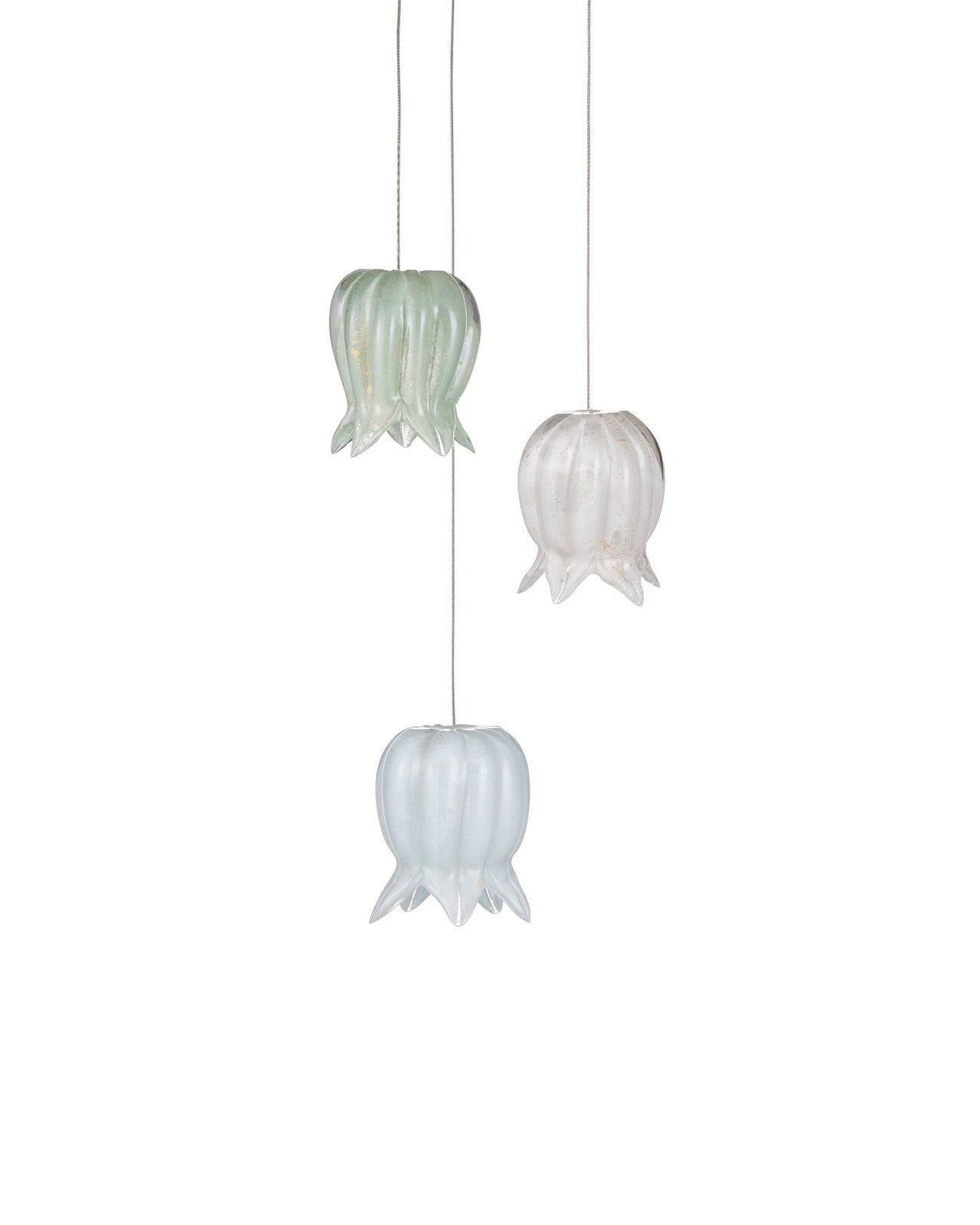 The Polpo Misto 3-Light Round Multi-Drop Pendant has bell-shaped shades that echo the form of inverted lily-of-the-valley flowers. Made of pale blue, green and white art glass with pronounced stippling, each shade has subtle variations that make it unique. The textured surfaces give the glass a Venetian-inspired character, adding depth and richness to the design. One shade of each color is represented on this fixture.