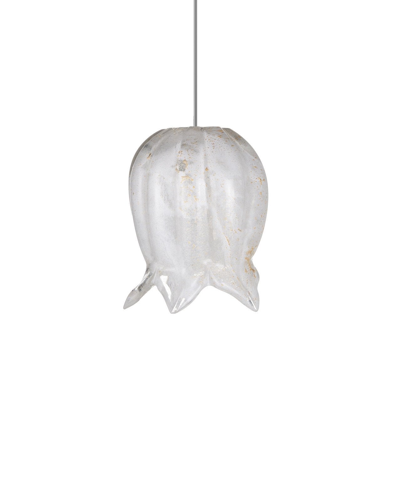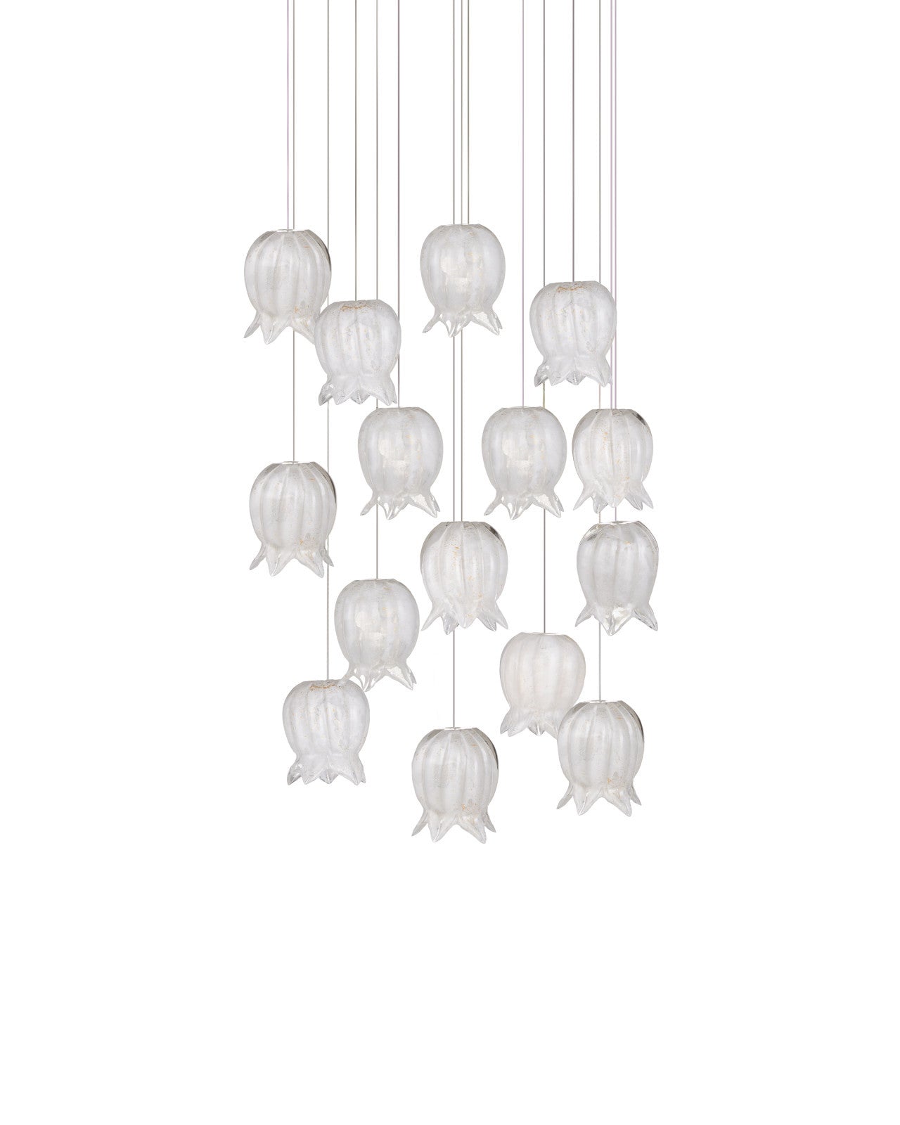 The Polpo White 15-Light Round Multi-Drop Pendant has bell-shaped shades that echo the form of inverted lily-of-the-valley flowers. Made of white art glass with pronounced stippling, each shade has subtle variations that make it unique. The textured surfaces give the glass a Venetian-inspired character, adding depth and richness to the design.