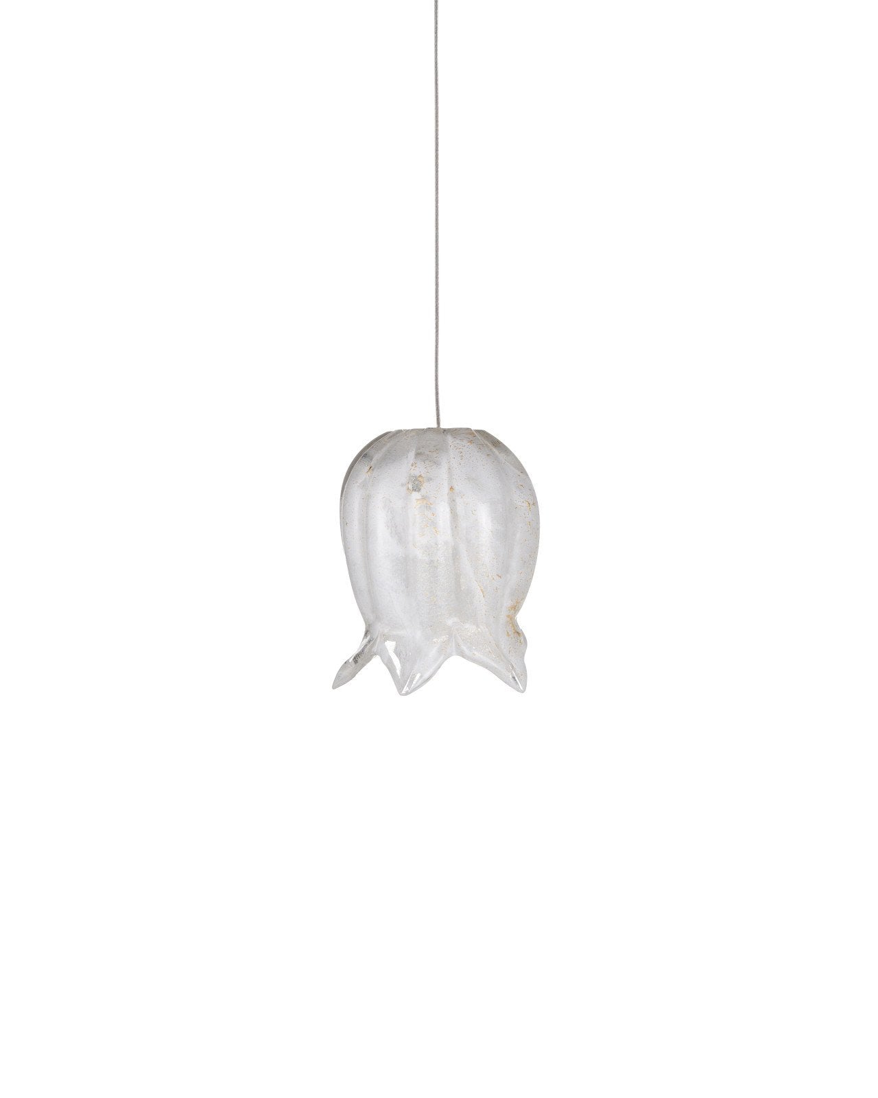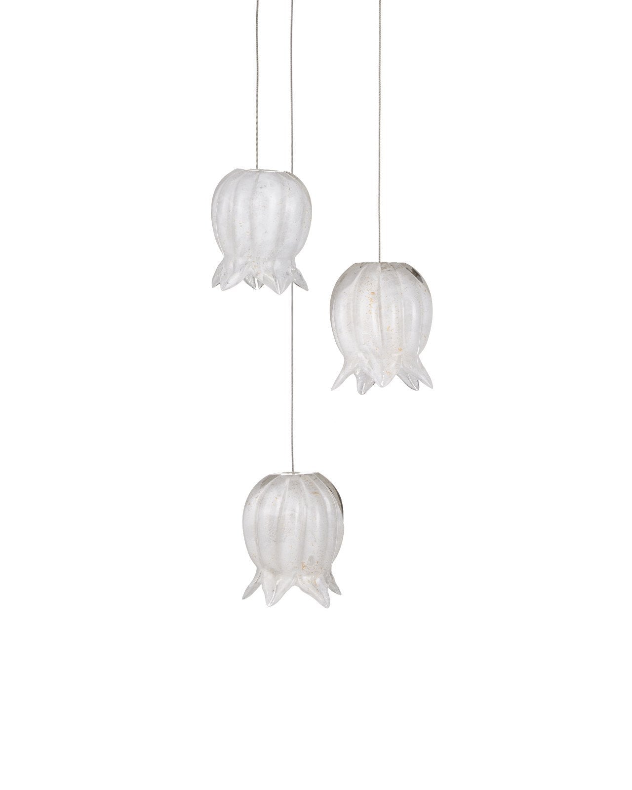 The Polpo White 3-Light Round Multi-Drop Pendant has bell-shaped shades that echo the form of inverted lily-of-the-valley flowers. Made of white art glass with pronounced stippling, each shade has subtle variations that make it unique. The textured surfaces give the glass a Venetian-inspired character, adding depth and richness to the design.