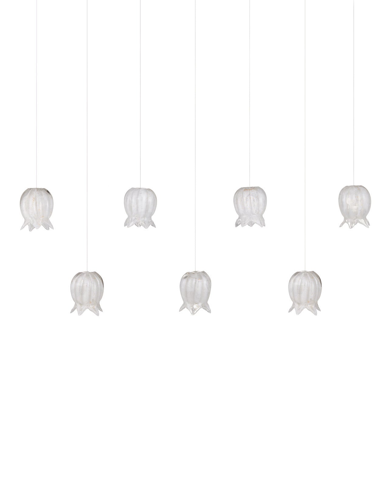 The Polpo White 7-Light Linear Multi-Drop Pendant has bell-shaped shades that echo the form of inverted lily-of-the-valley flowers. Made of white art glass with pronounced stippling, each shade has subtle variations that make it unique. The textured surfaces give the glass a Venetian-inspired character, adding depth and richness to the design.