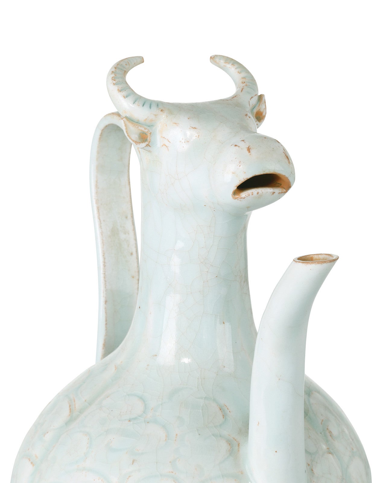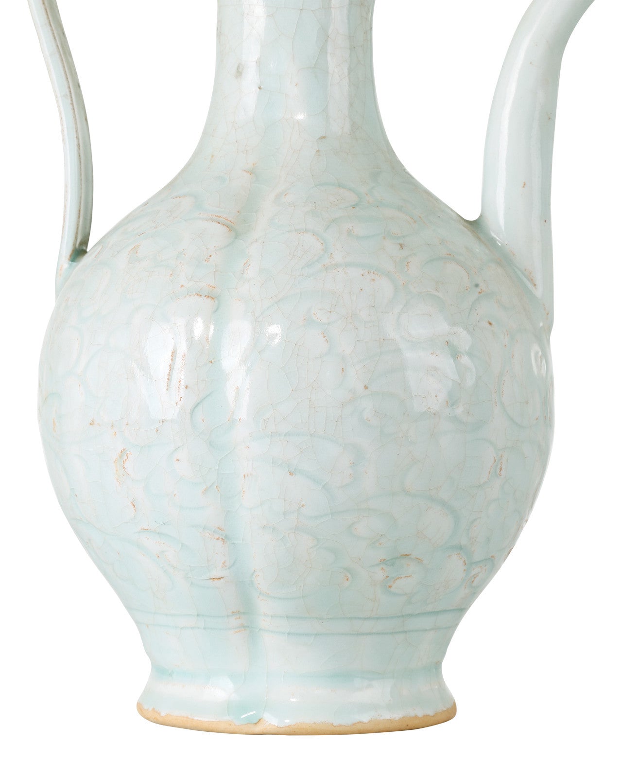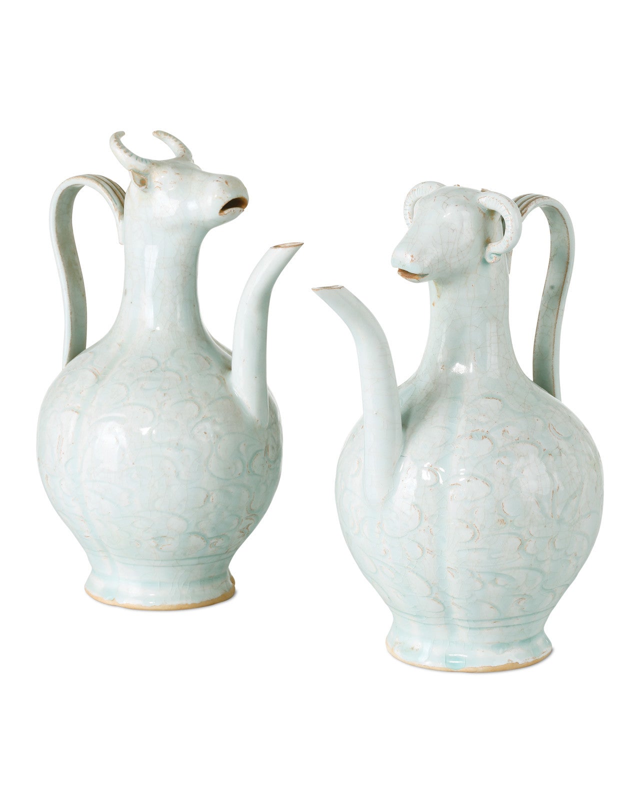 Inspired by ancient ceremonial art, the Ritual Large Hunting Bottle includes two striking vases that are modeled after Ming Dynasty liquor bottles taken on the hunt. The vessel features a sculptural animal head detail with great historical significance. Crafted in porcelain with a soft celadon green glaze, the surface has a delicate crackle effect that enhances the antique look and feel. Due to the artisanal finish, the surface of each accessory could differ slightly.