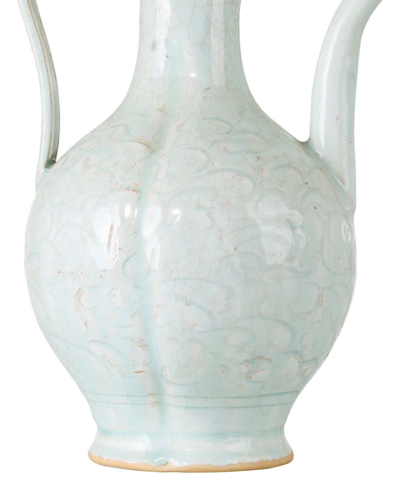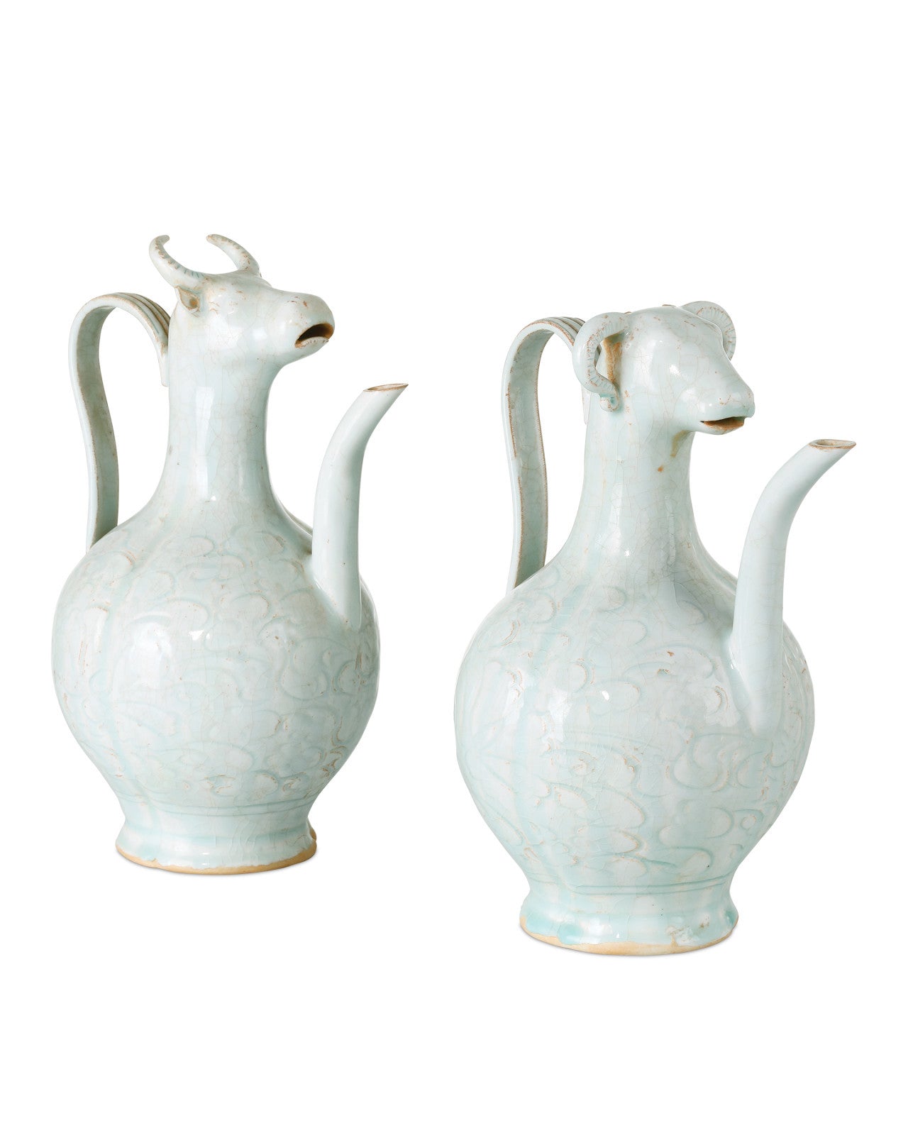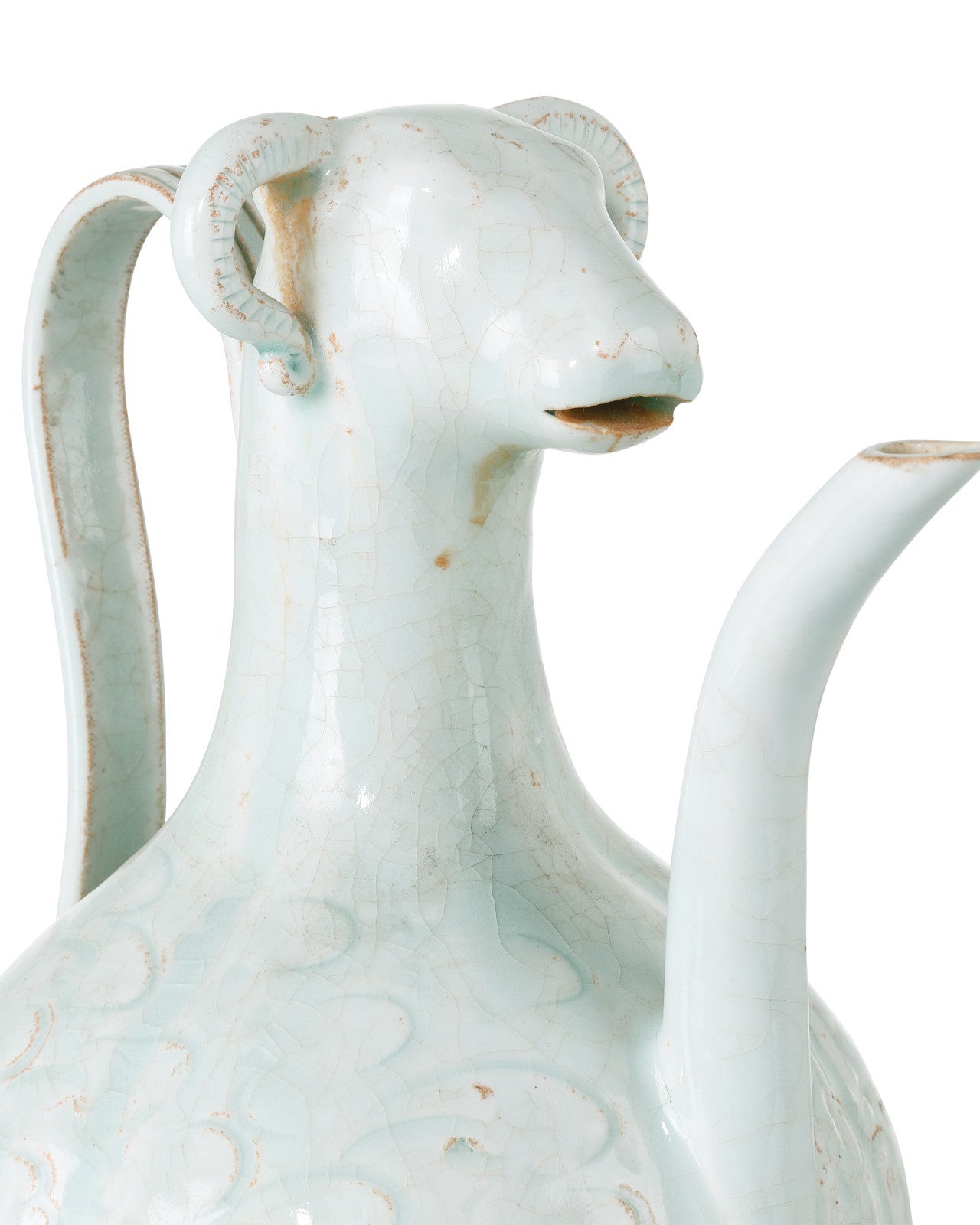 Inspired by ancient ceremonial art, the Ritual Small Hunting Bottle includes two striking vases that are modeled after Ming Dynasty liquor bottles taken on the hunt. The vessel features a sculptural animal head detail with great historical significance. Crafted in porcelain with a soft celadon green glaze, the surface has a delicate crackle effect that enhances the antique look and feel. Due to the artisanal finish, the surface of each accessory could differ slightly.