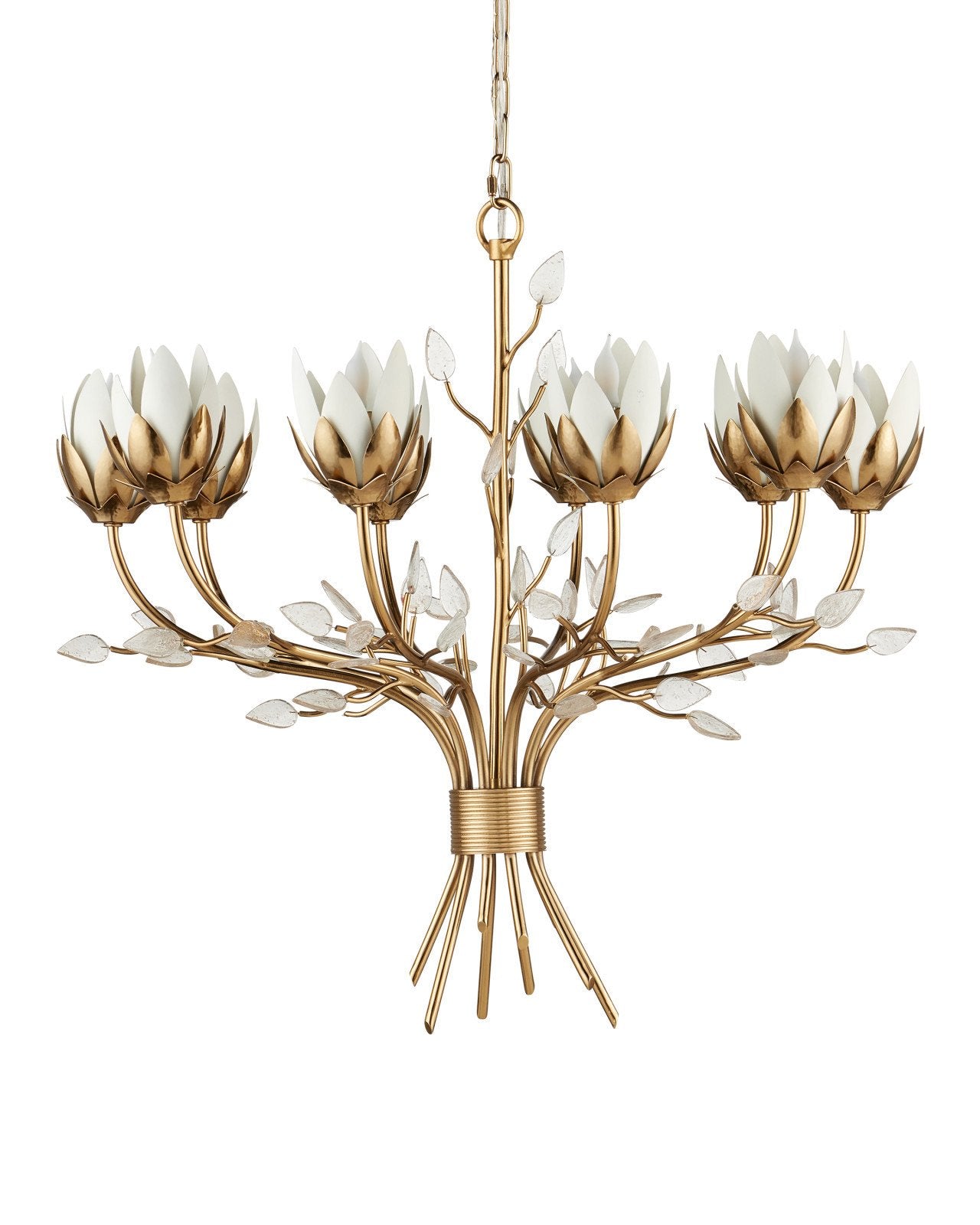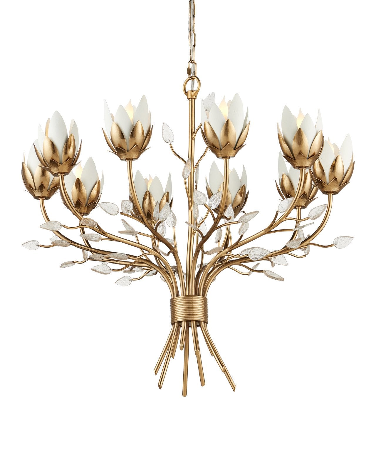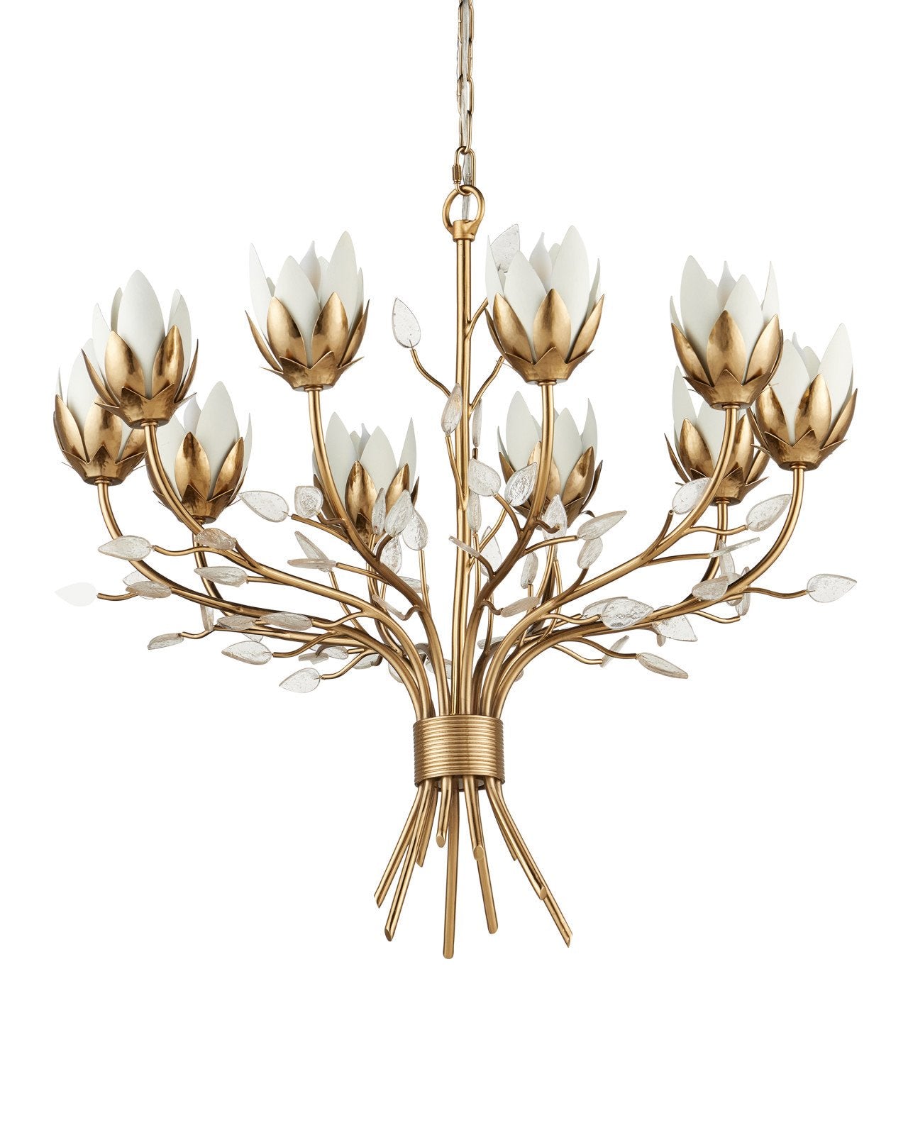 The floral artistry the Star Magnolia Medium Chandelier makes it an exceptional light fixture. The metal elements that ground the gold chandelier are covered in an antique brass finish while the blossoms extending from the outer leaves are finished in white. The smaller leaves fluttering from the branches are made of pressed glass, each of them handmade. Portions of the metal have been hand-hammered to add subtle texture to surfaces. The fixture has 10 lights and is dimmable. There may be slight variations in the surface of the glass from one chandelier to another.