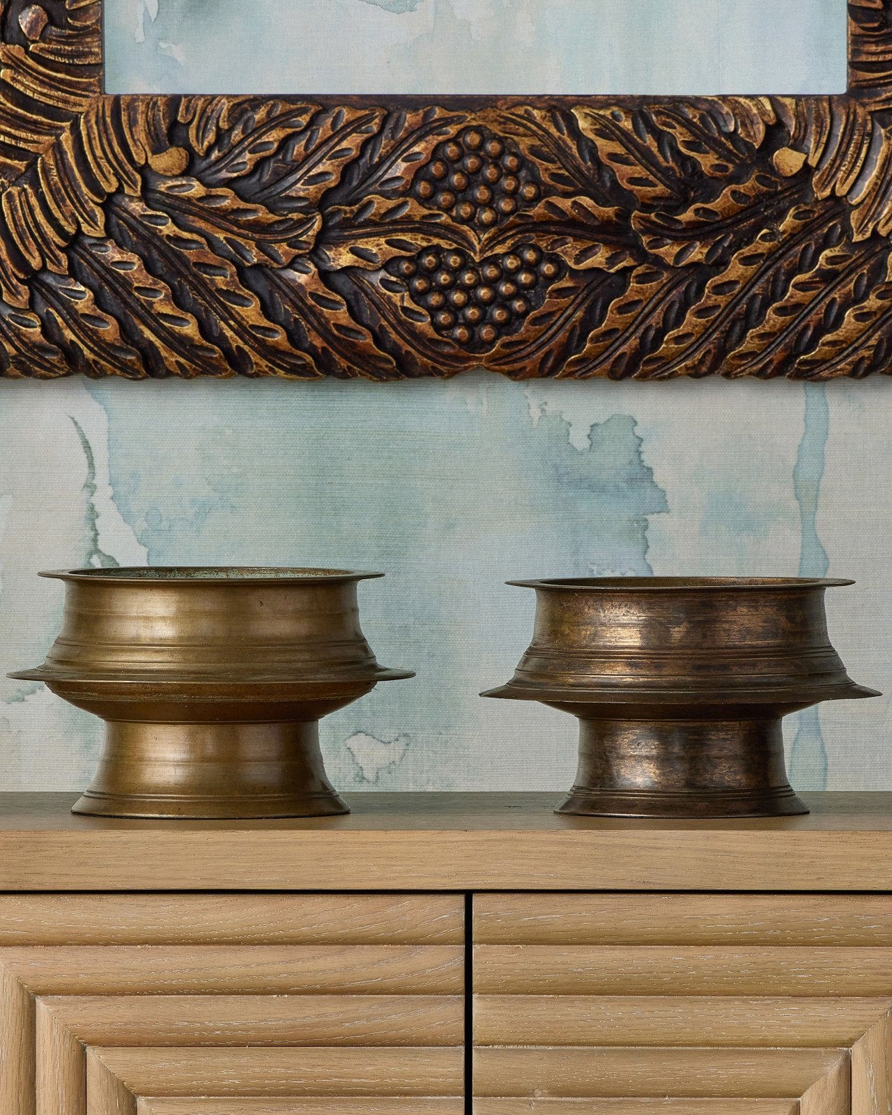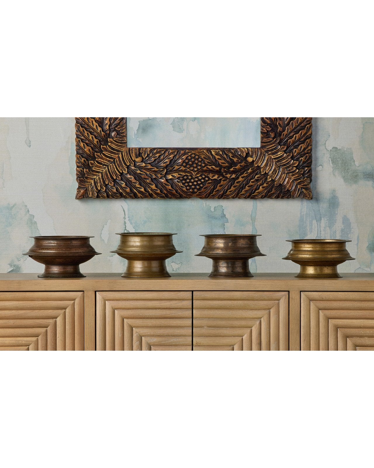 The Tanjore Ritual Bowl, which is made of brass in an antique brass finish, was inspired by collectible bronze vessels from southern India. Once used as everyday household items, these bowls have evolved into decorative accents, often filled with flowers as striking table centerpieces. With its historic roots and finely crafted form, the piece reflects a rich story of traditional craftsmanship. Due to the artisanal finish, the surface of each accessory could differ slightly.
