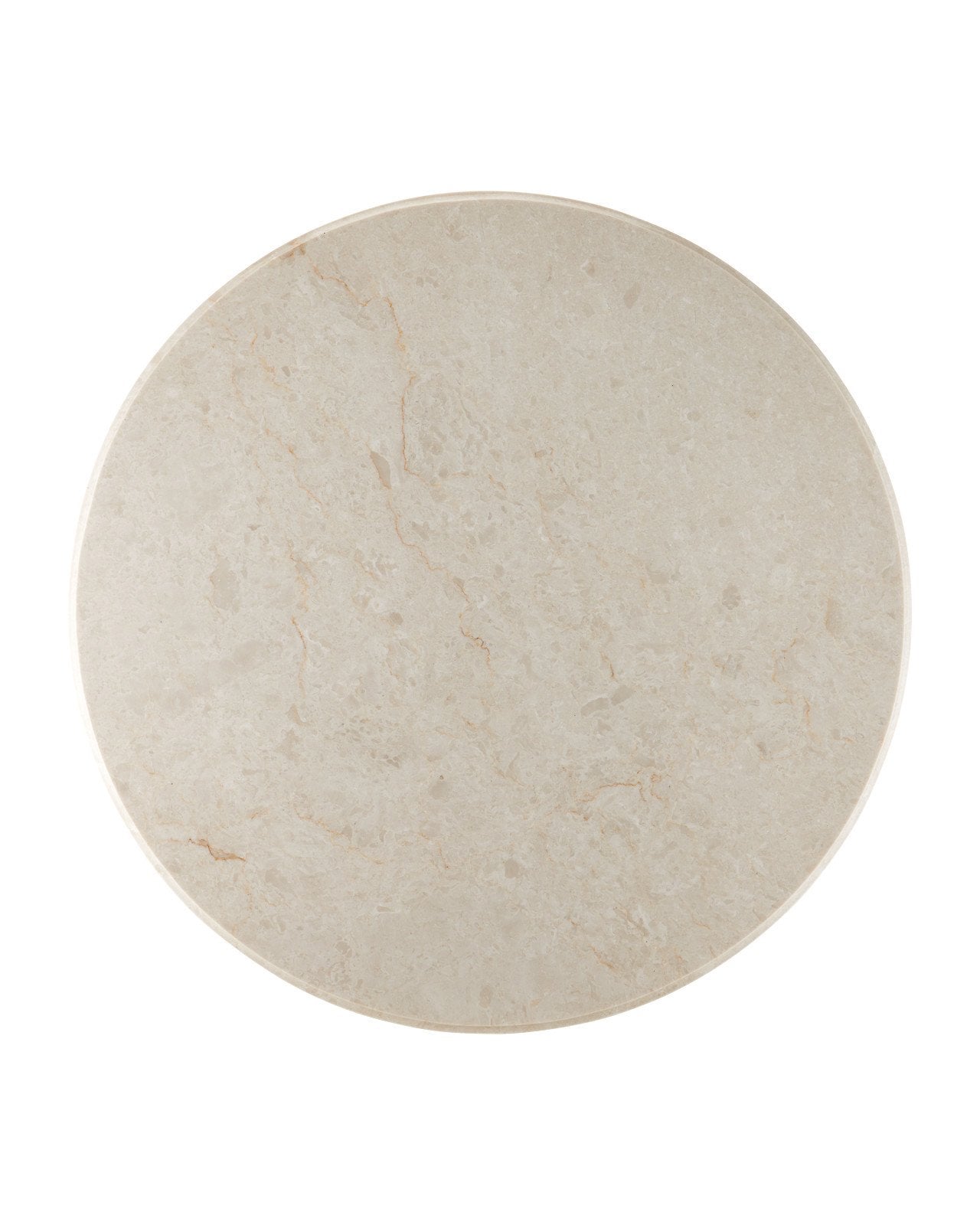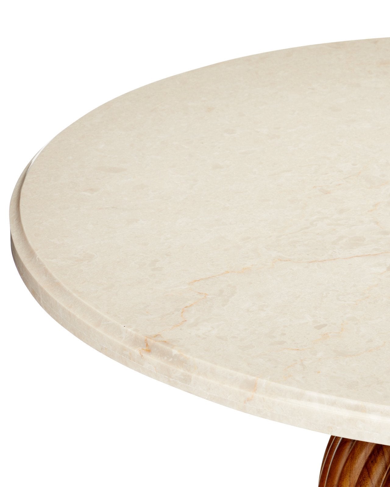 The hand-carved wood base of the Tassel Entry Table is a study in movement, with its flowing lines that imitate strands of thread. The Mindi wood from which it is made and the brass collar in a brushed brass finish bring the wood accent table warmth, while the Crema Marfill marble top is a nice contrast in its paleness.
