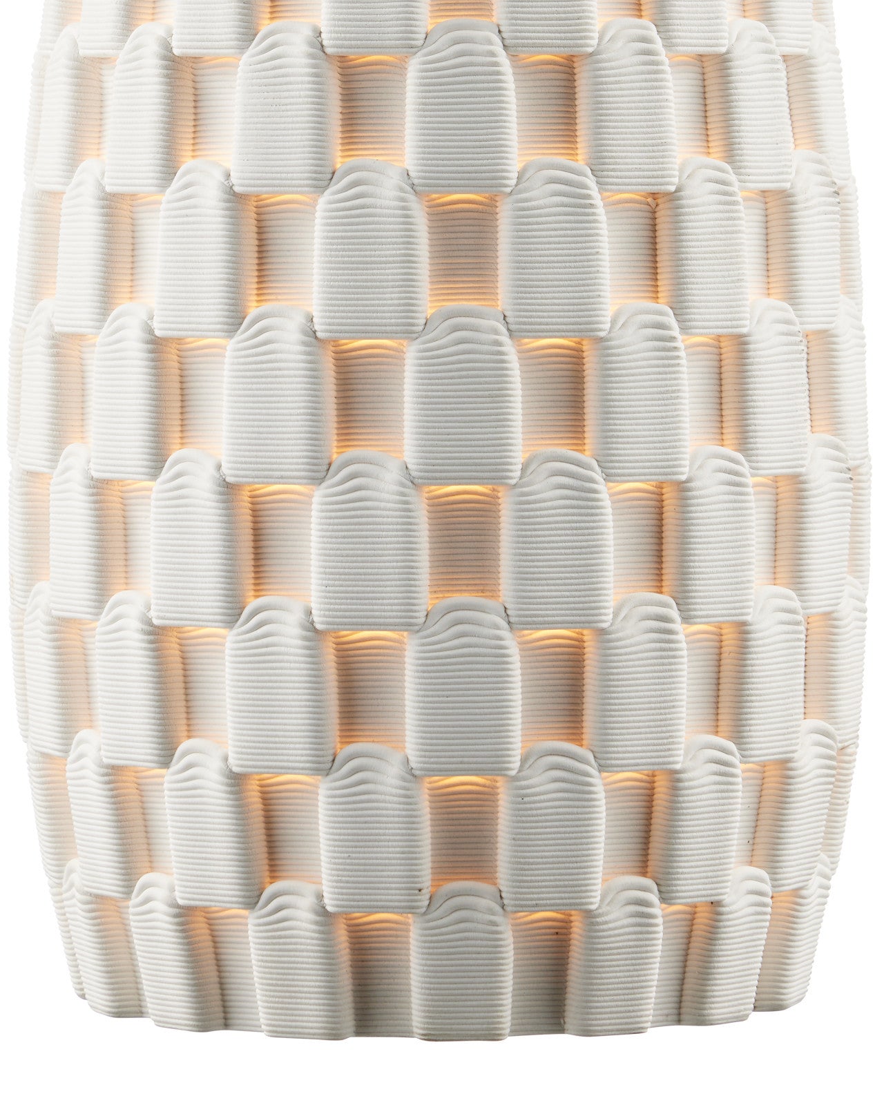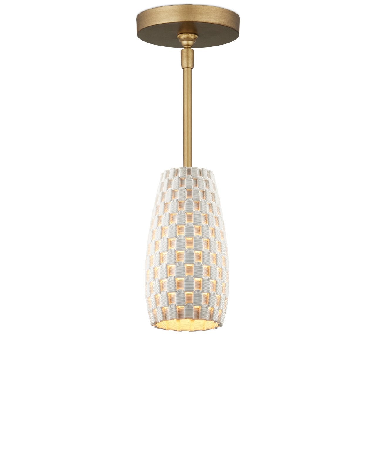The Tessitura Pendant features a shade made of white 3D-printed porcelain with a precise grid pattern. Because the ceramic is opaque, small slits are cut into the bottom of the raised sections to direct light into the indented areas, creating a subtle play of shadow and glow. The process uses only the clay required, giving the design a built-in sustainability story. An extra-bright bulb enhances the effect, while a metal stem in a brass finish completes the pendant’s clean profile. This fixture is dimmable.