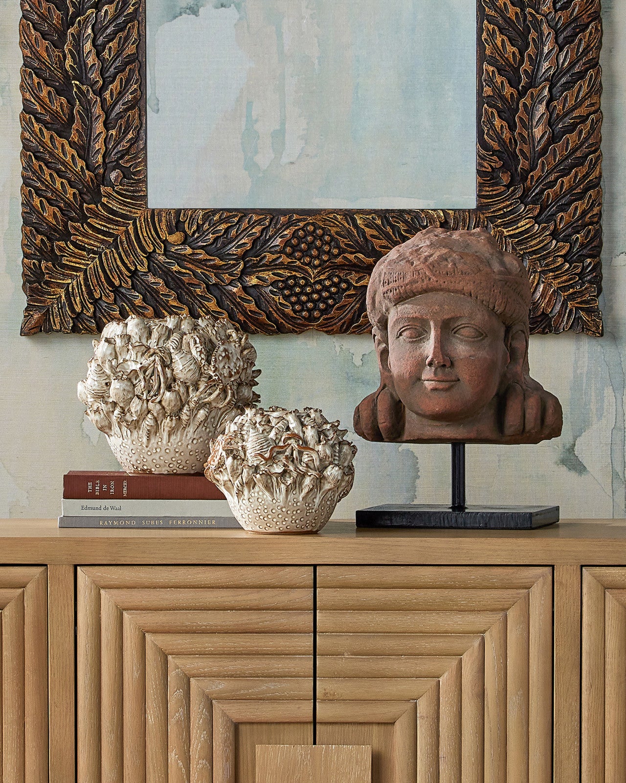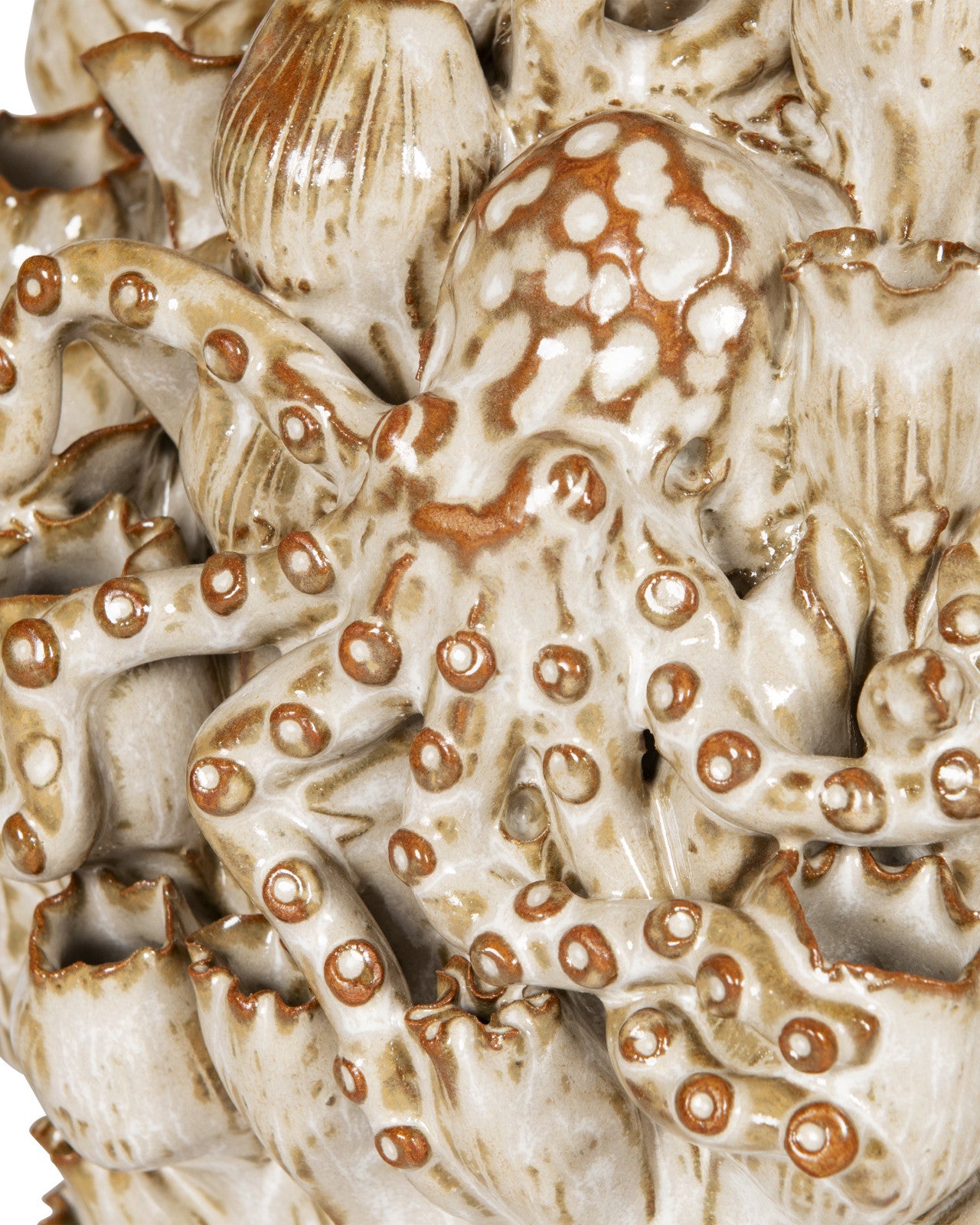 The Tidal Large Vase carries an underwater theme, with carved depictions of crabs and an octopus wrapping around its surface. Made of dark clay ceramic in a milky white finish, each vase is individually thrown, carved, decorated, and glazed by a community of women artisans. Not watertight, the piece should be lined before use, making it as much a work of art as a functional vessel. Due to the artisanal finish and unique placement of the decorations, each accessory could differ slightly.