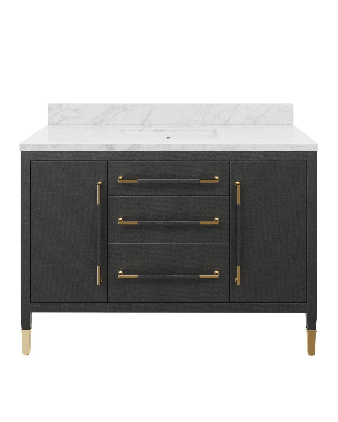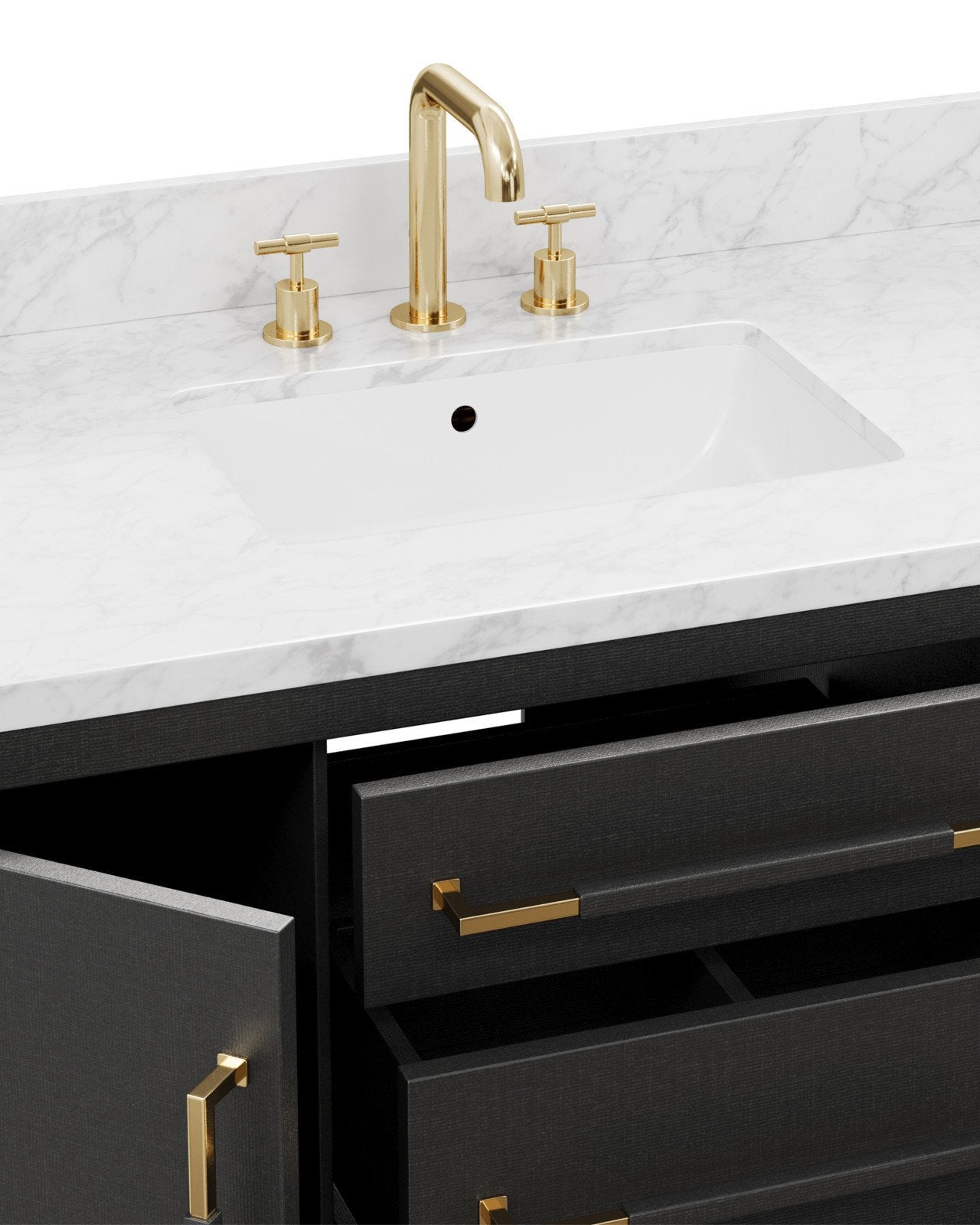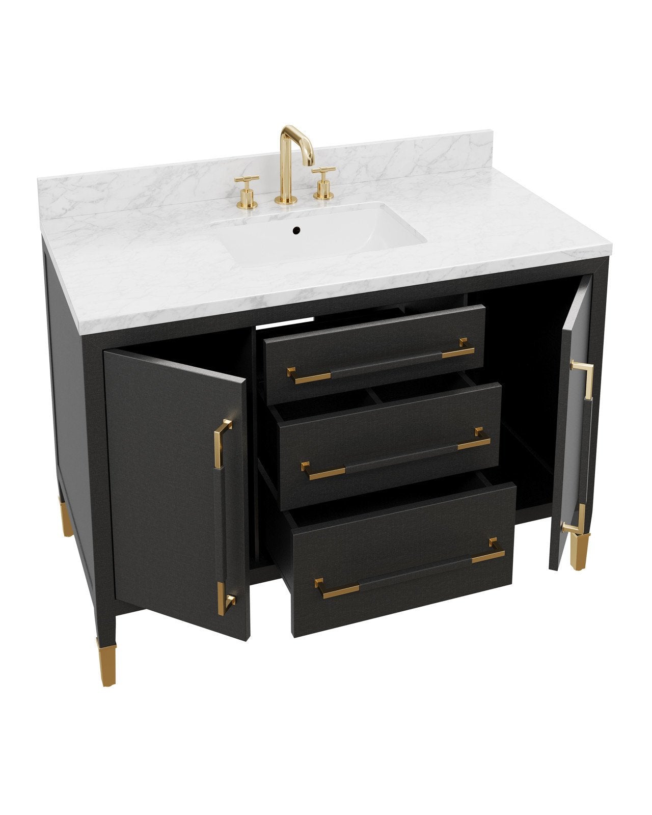 The Verona 48” Black Vanity with Rectangular Undermount Sink is covered in black lacquered linen with metal drawer pulls and ferrules in a champagne finish. The vanity has two working drawers on the bottom and a decorative panel on the top. There are recessed shelves behind the doors. The white Carrara marble top is fitted with a white rectangular undermount sink.