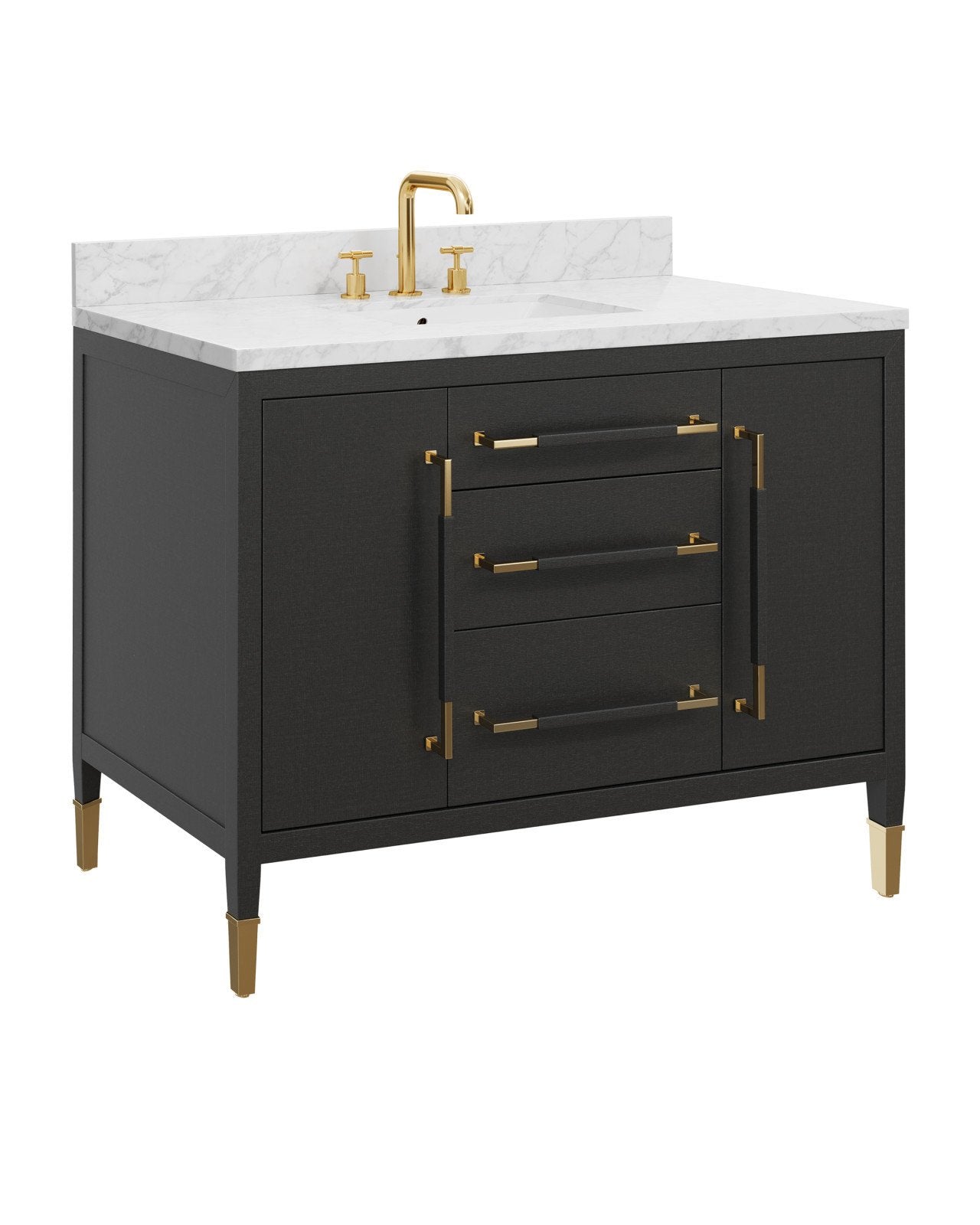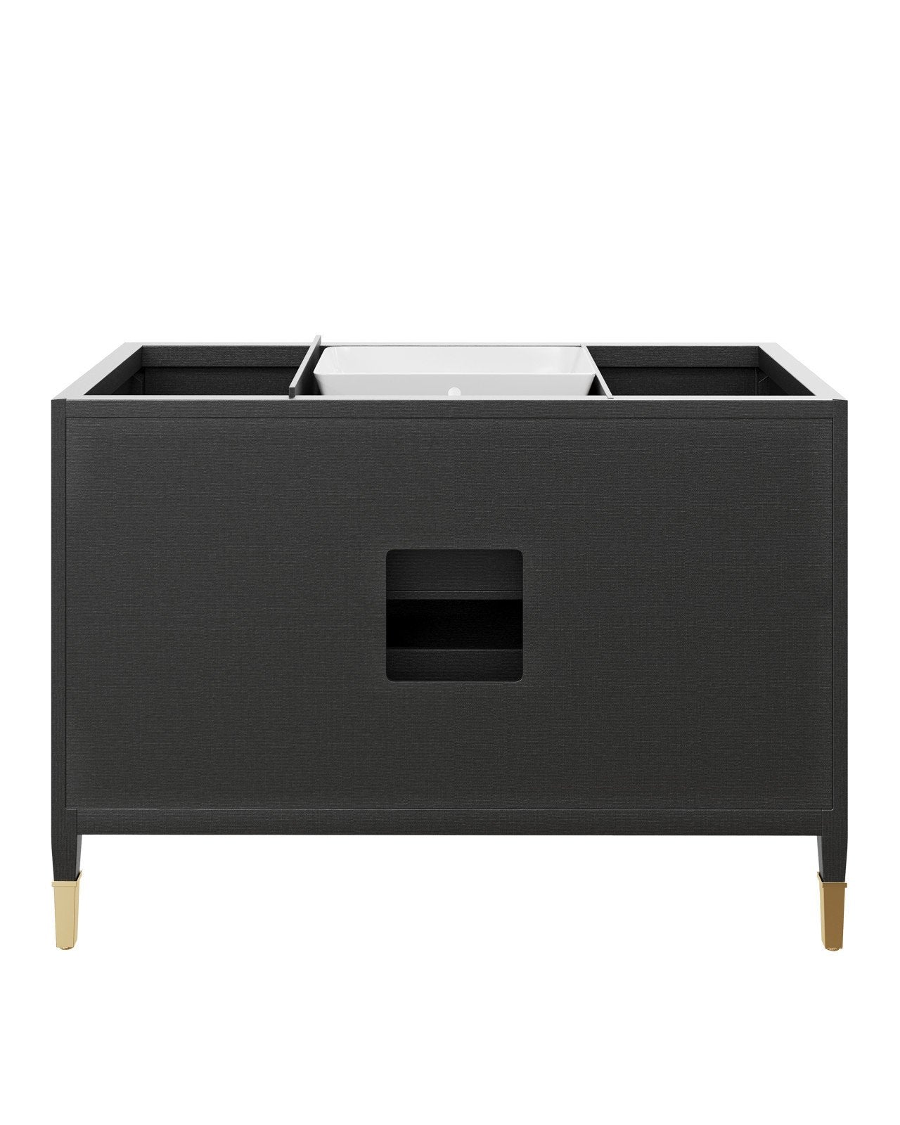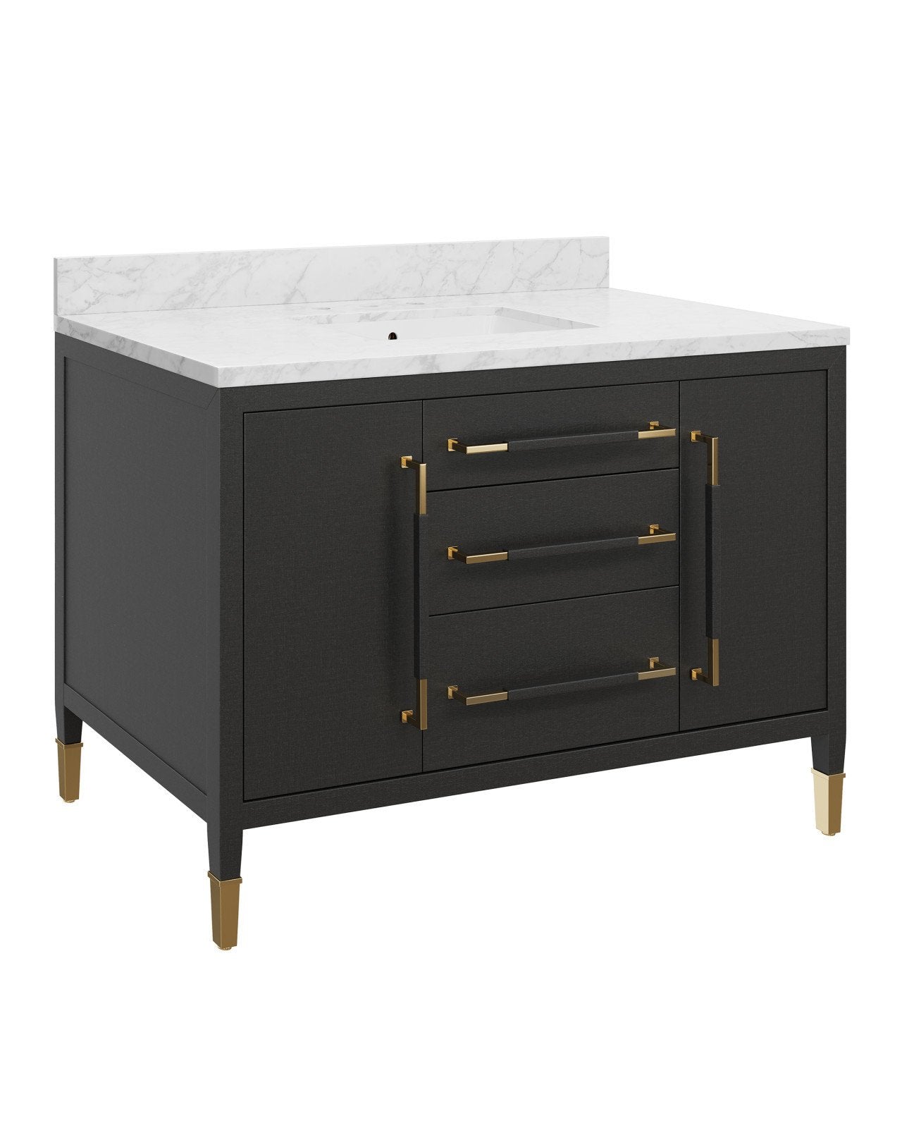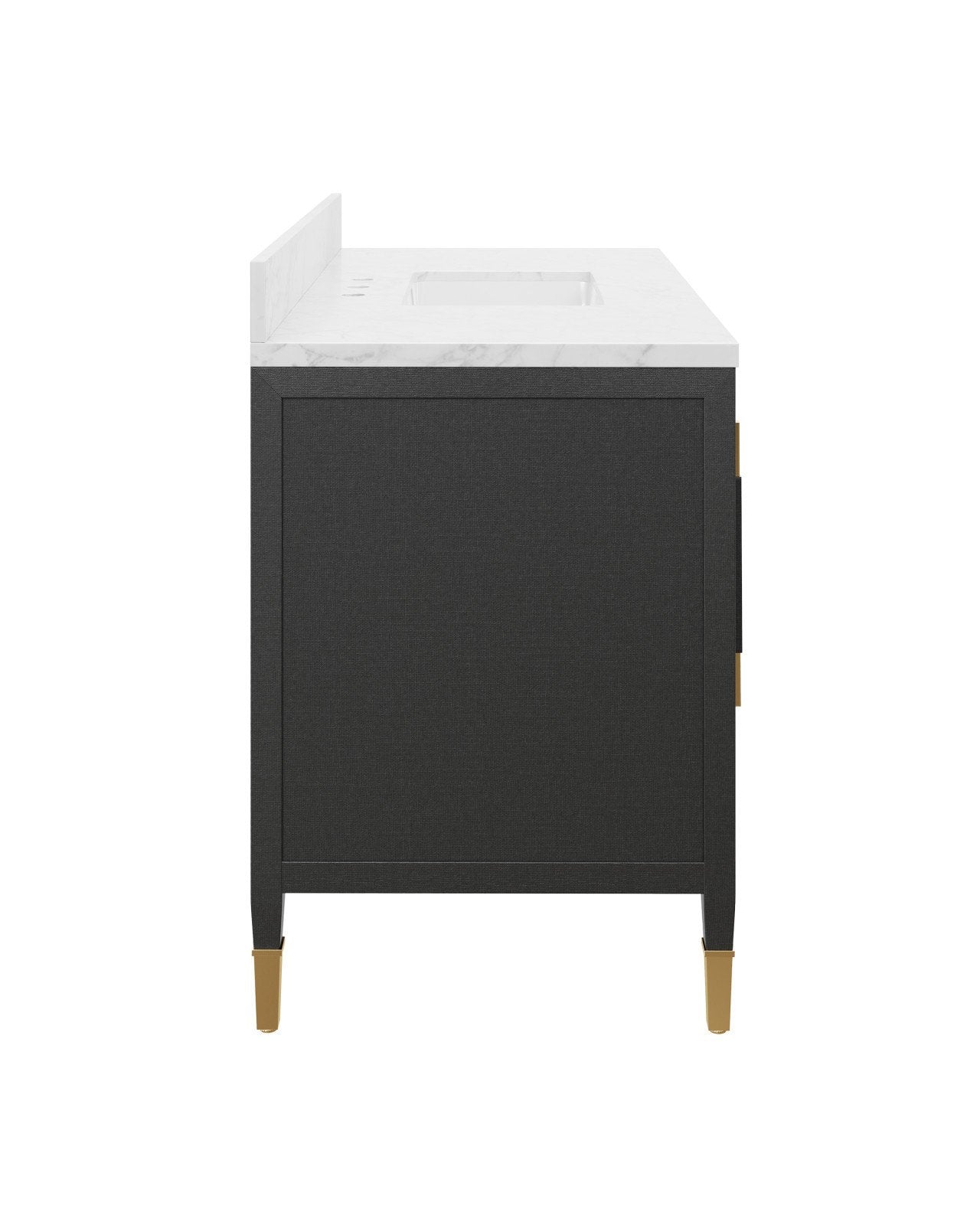The Verona 48” Black Vanity with Rectangular Undermount Sink is covered in black lacquered linen with metal drawer pulls and ferrules in a champagne finish. The vanity has two working drawers on the bottom and a decorative panel on the top. There are recessed shelves behind the doors. The white Carrara marble top is fitted with a white rectangular undermount sink.