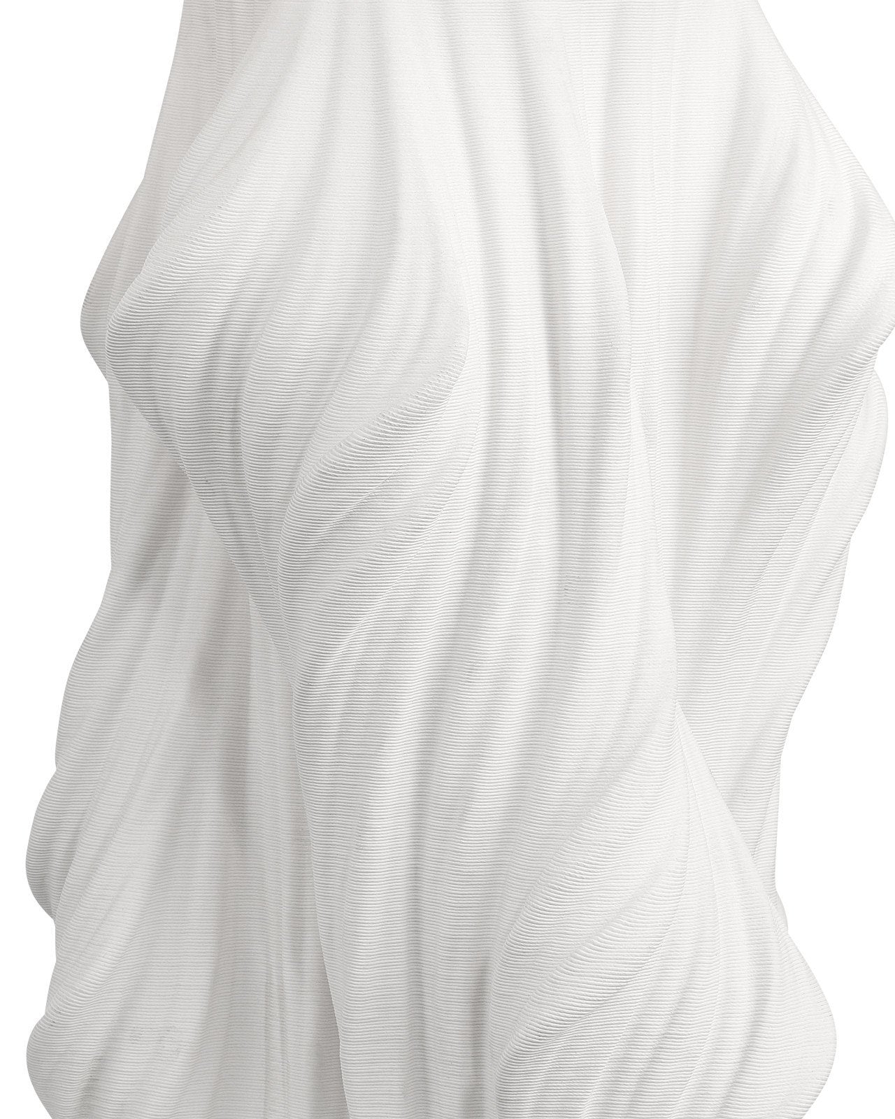 The Watershed Table Lamp is crafted from white 3D-printed porcelain with flowing lines that evoke the movement of rustling fabric. The advanced process makes possible a sculptural form that traditional techniques could not achieve, giving the lamp a distinctly modern character. Metal hardware in a polished nickel finish and an optic crystal finial complete the composition with a crisp, light touch.