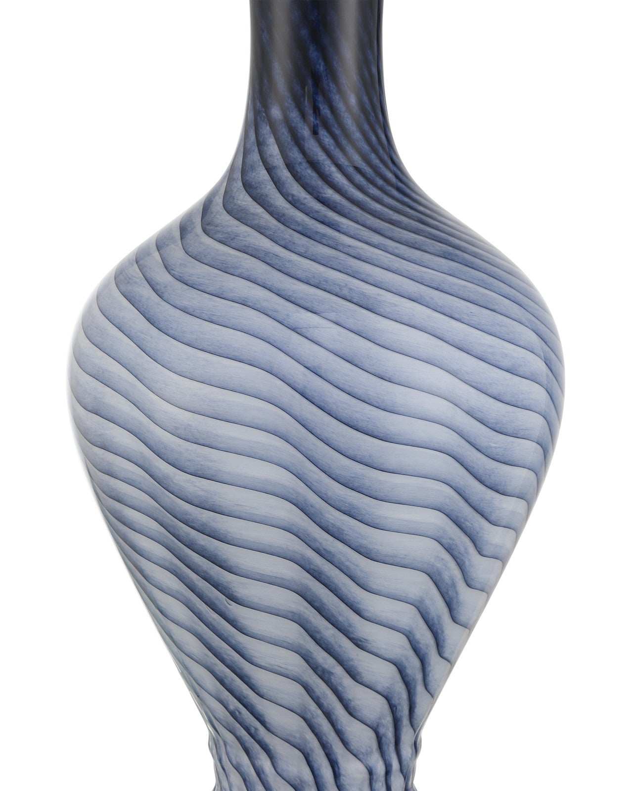 The Zeta Blue Table Lamp is crafted from grayish-blue glass with a swirling pattern created using two molds, a technique that gives the surface the feeling of movement. Its shape is inspired by a 19th-century antique Zanfirico glass vase, reminiscent of the artistry of Murano glassmakers. The lamp rests on an optic crystal base with a coordinating crystal finial, while a softback shade trimmed in blue echoes the tones of the glass body. Because it is made of an artisanal material, its surface may vary slightly from lamp to lamp.