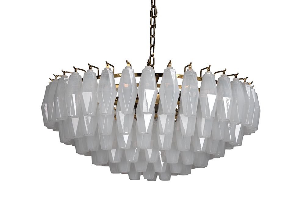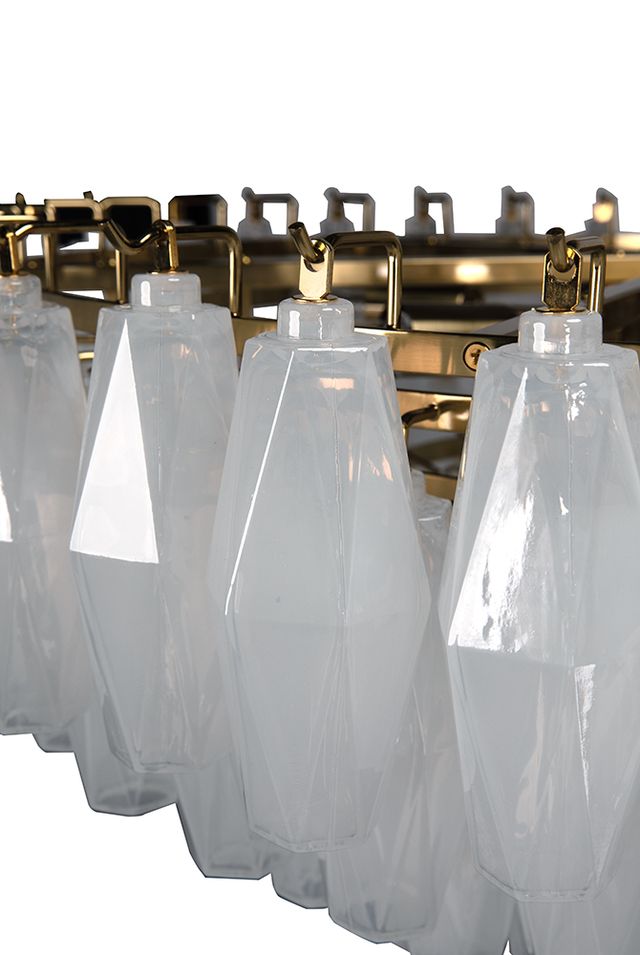 A tiered Murano-style chandelier with faceted opaline glass prisms on a polished brass frame. The geometric design emits a soft, diffused glow, blending Mid-Century Italian elegance with contemporary sophistication and sculptural presence.