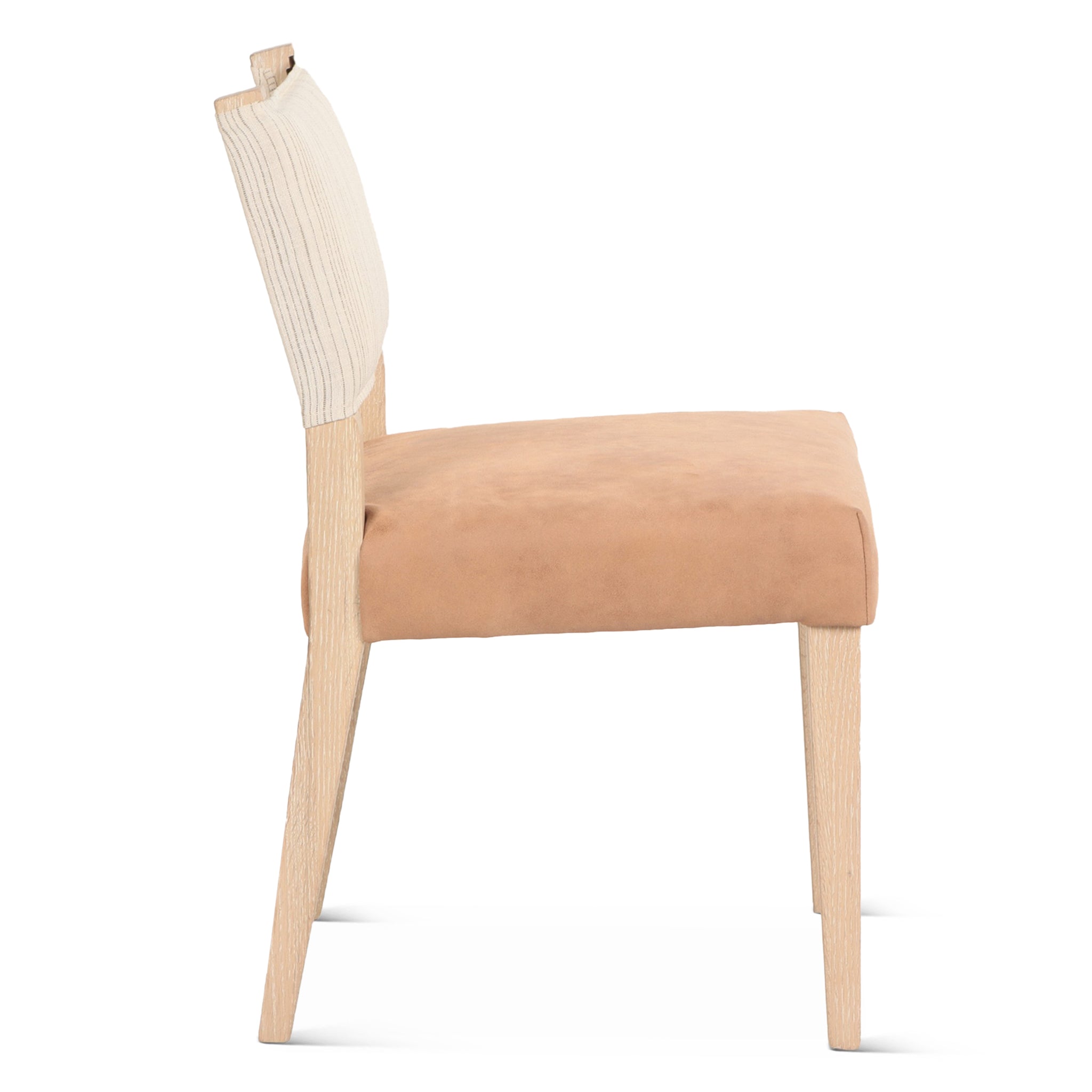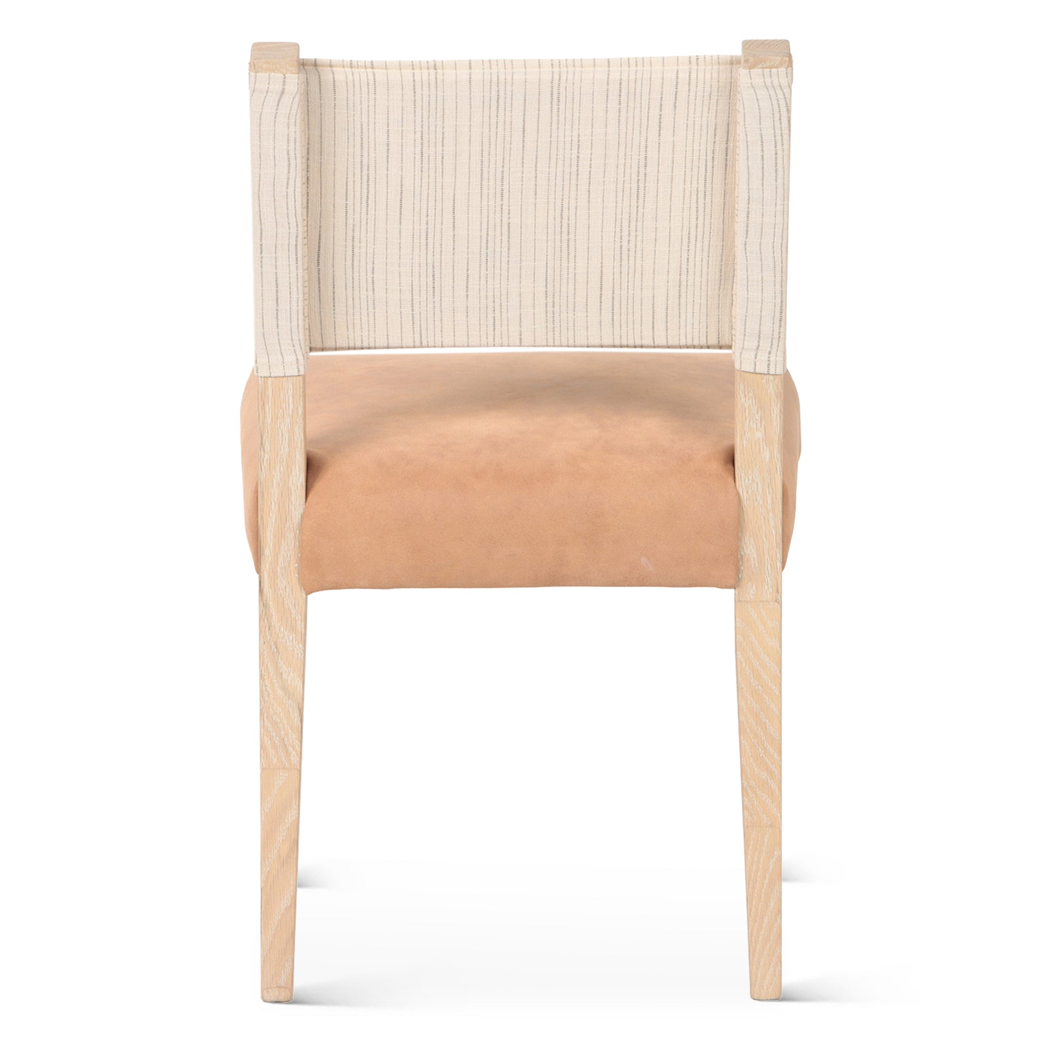 Designed for both style and durability, the Lila Dining Chair boasts a sturdy frame and legs made from high-quality solid wood. This exquisite dining chair combines the luxurious comfort of leather seating with the comforting charm of a striped linen backrest. The fusion of these two premium materials creates a sophisticated and inviting seating solution for your dining room.