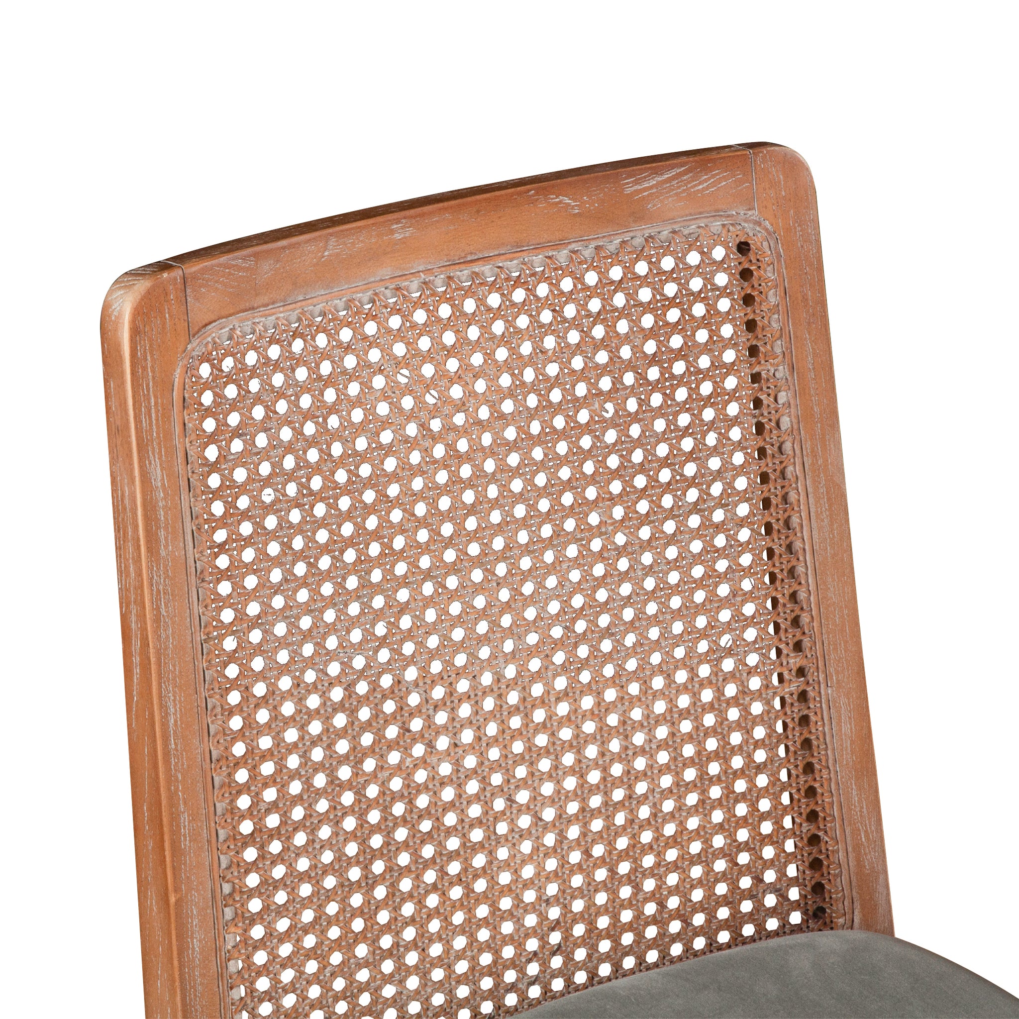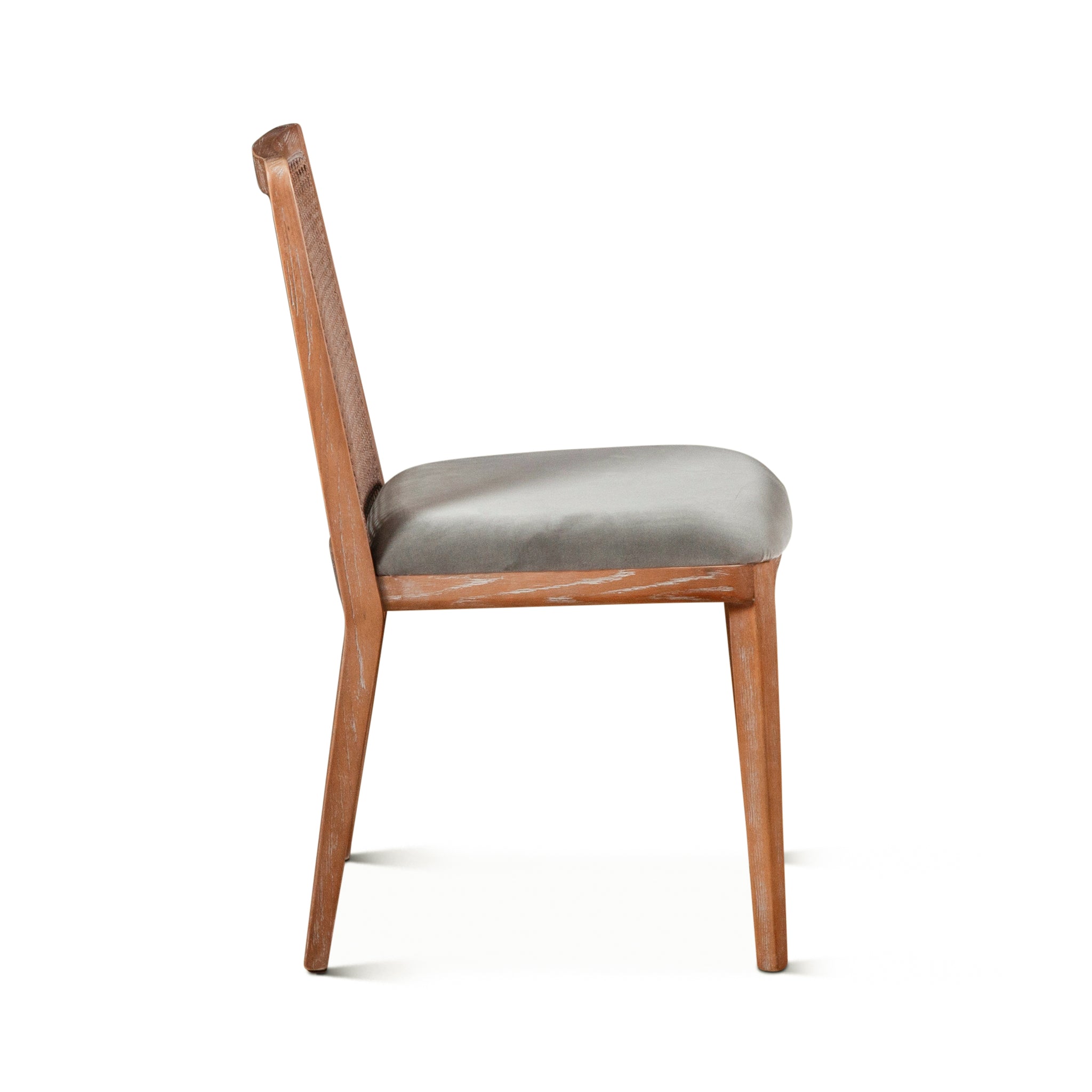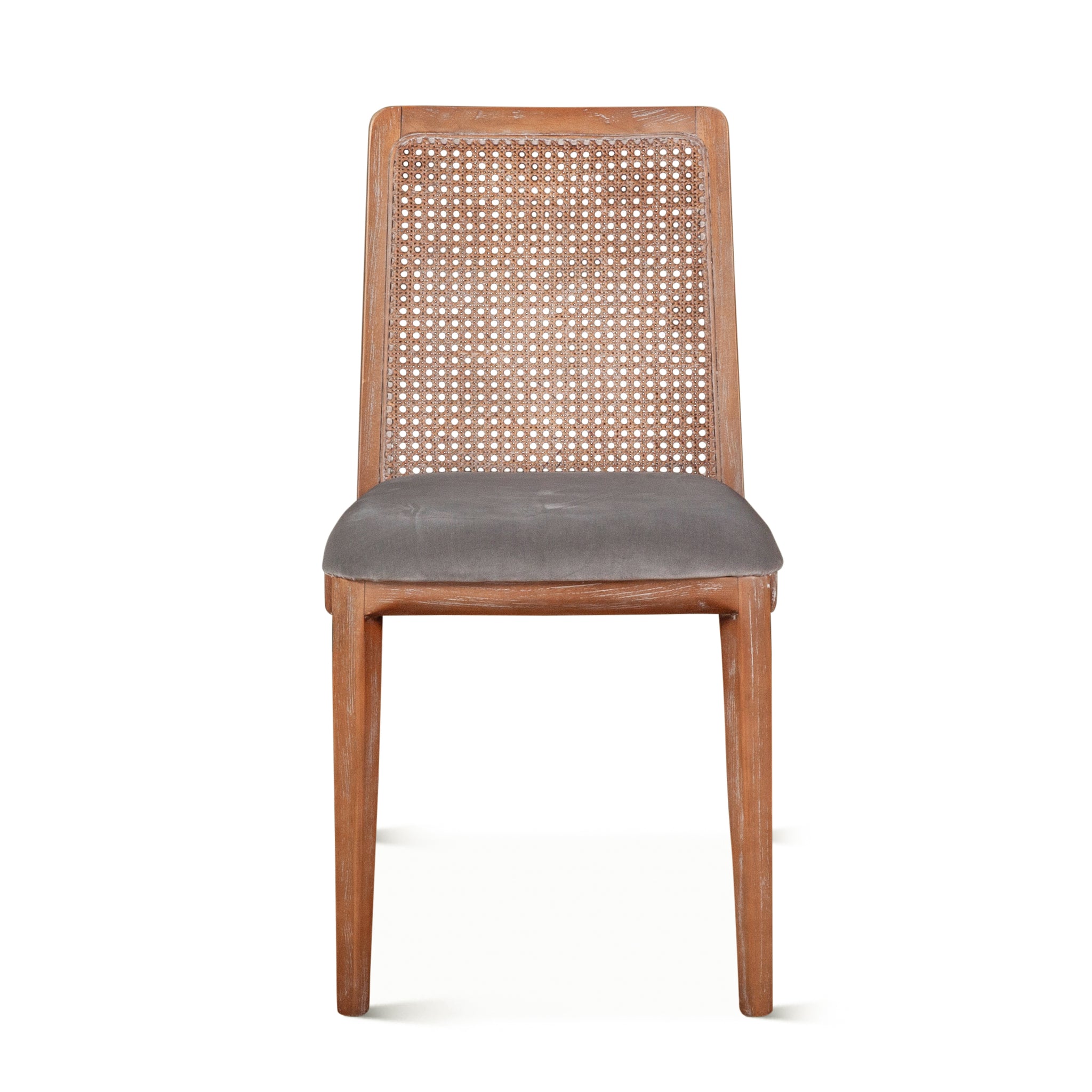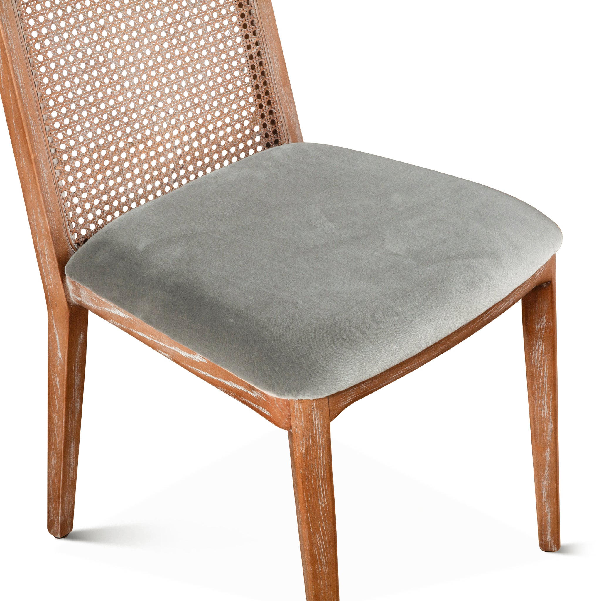The Luna Chair is simple and refined. A beautifully crafted mango wood frame surrounds a rattan back and finished with a soft grey velvet seat to give this chair a uniquely modern yet weathered look. The gently whitewashed finish brings the Mango wood frame to life, enriching the graining and giving the Luna chair a warm weathered appearance.