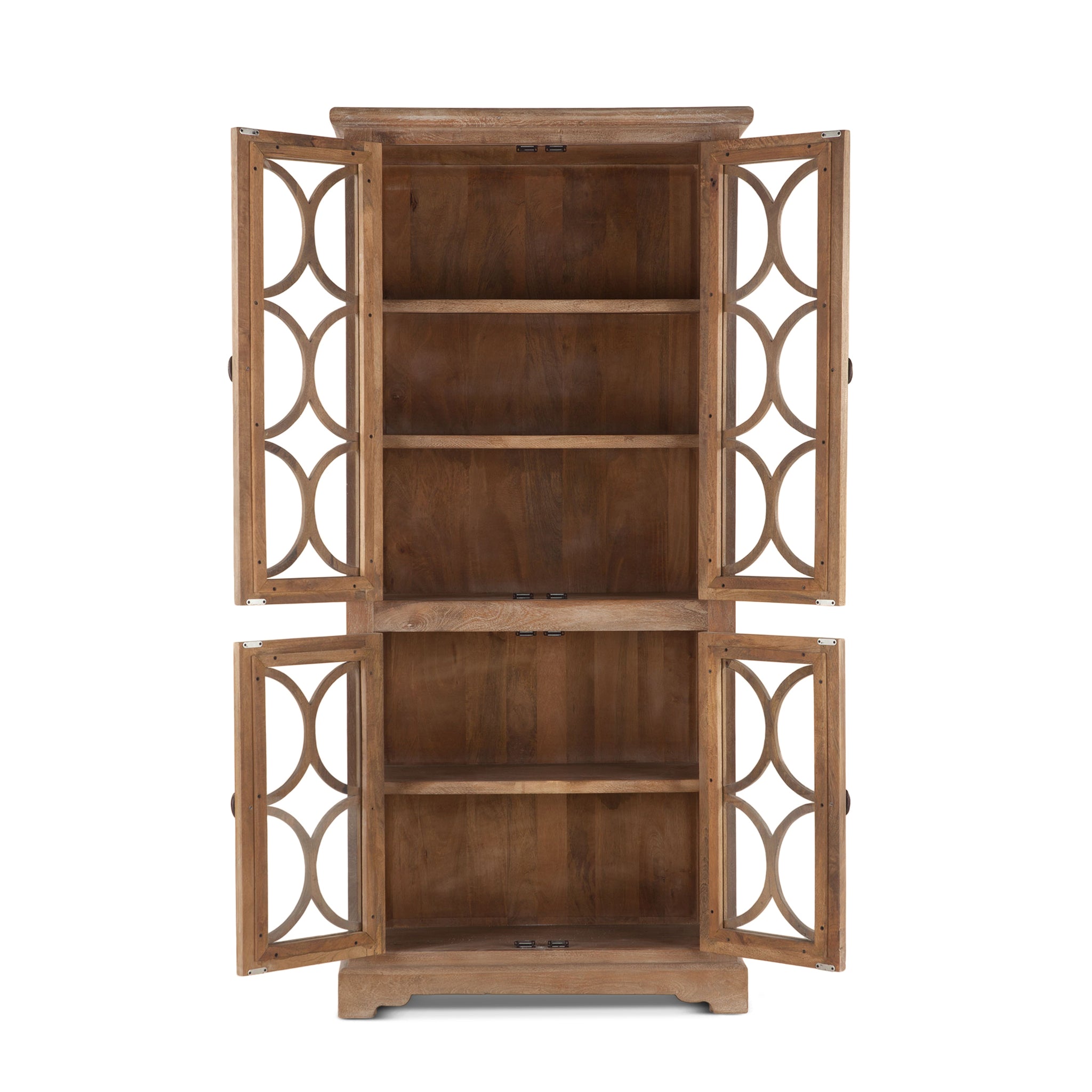 Surrounded by the familiar comforts of coastal charm and heirloom-quality construction, the Pengrove collection is crafted from solid mango wood. The beautiful furniture of this collection features frame-and-panel construction, over-sized styling, carved pedestals and a beautiful, antique oak finish. Whether you're looking to bring harmony to a cluttered office or display your favorite fragile china in the dining room, this unique cabinet offers up a touch of elegant appeal to your decor. At 84-inches tall and made of solid mango wood, this cabinet has five shelves from top to bottom. Two sets of double doors cover the top and bottom halves of the cabinet, each with carved wood in half moon patterns over the glass. The antique oak finish of the wood adds to the longevity of the piece, providing maximum moisture and scratch resistance for many years to come.