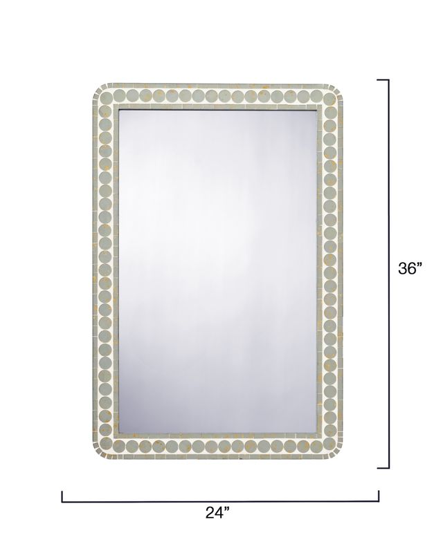 Soft sage tones and a gently distressed finish lend this handcrafted mirror an aura of quiet sophistication. Its painted glass frame, detailed with a subtle circular motif, captures and reflects light beautifully throughout the room. Perfect above a console, vanity, or dresser, it blends warmth, texture, and a hint of vintage glamour. Designed to complement both traditional and modern spaces, it evokes calm elegance.