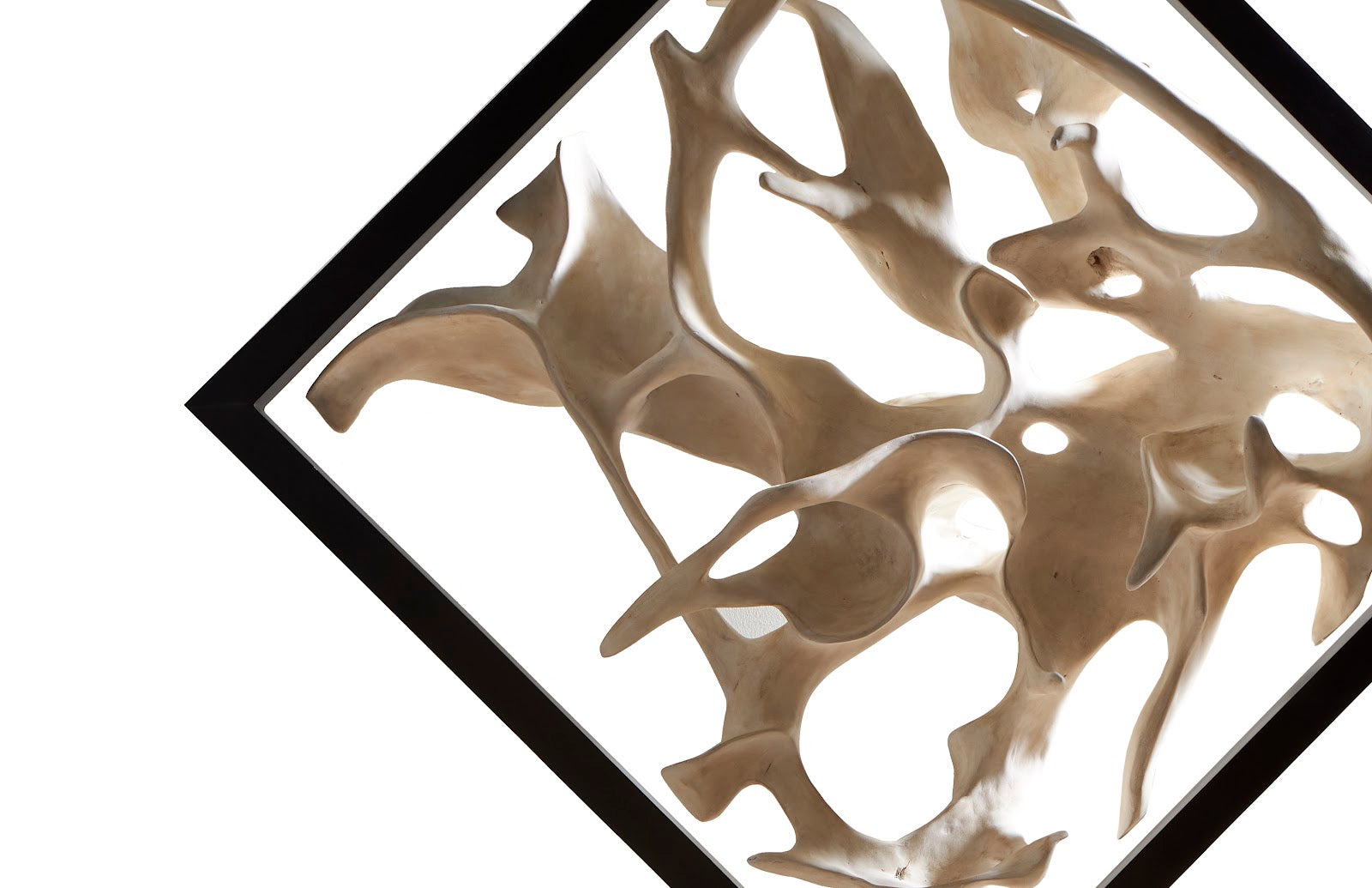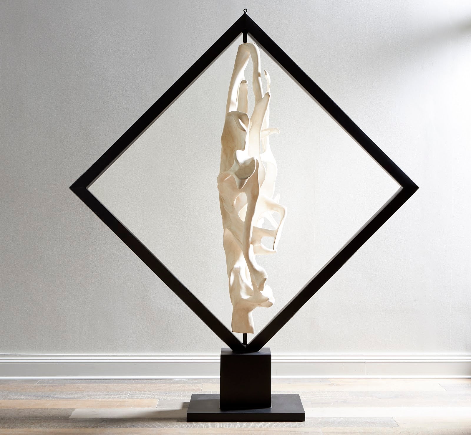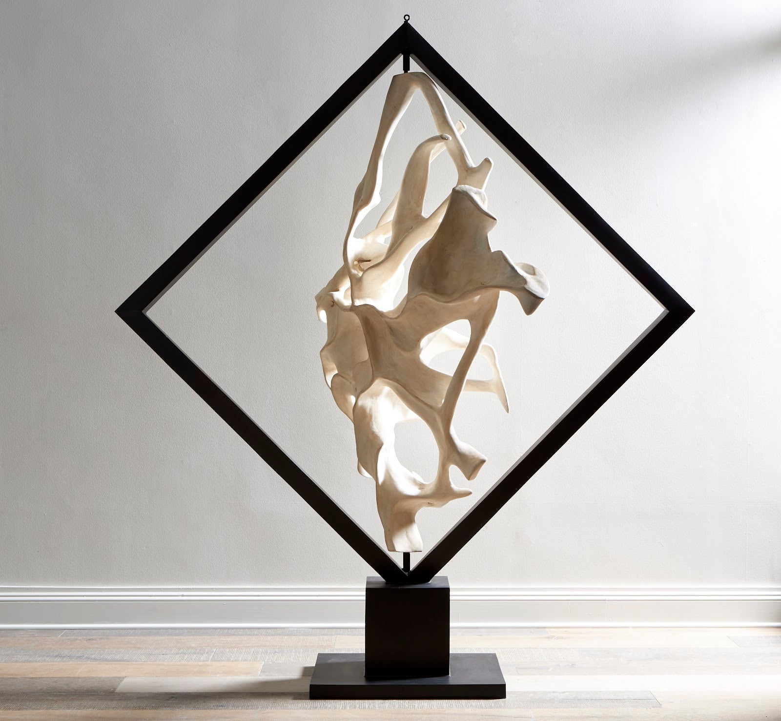Enjoy a mix of organic in Our Cast Revolving Root Rotating Sculptures. Each one has the same organic root shape with a smooth black metal outer frame, adding interest to the sculpture. This floor sculpture has the organic feeling of a natural piece and a beautiful white stone finish, making it anything but ordinary.