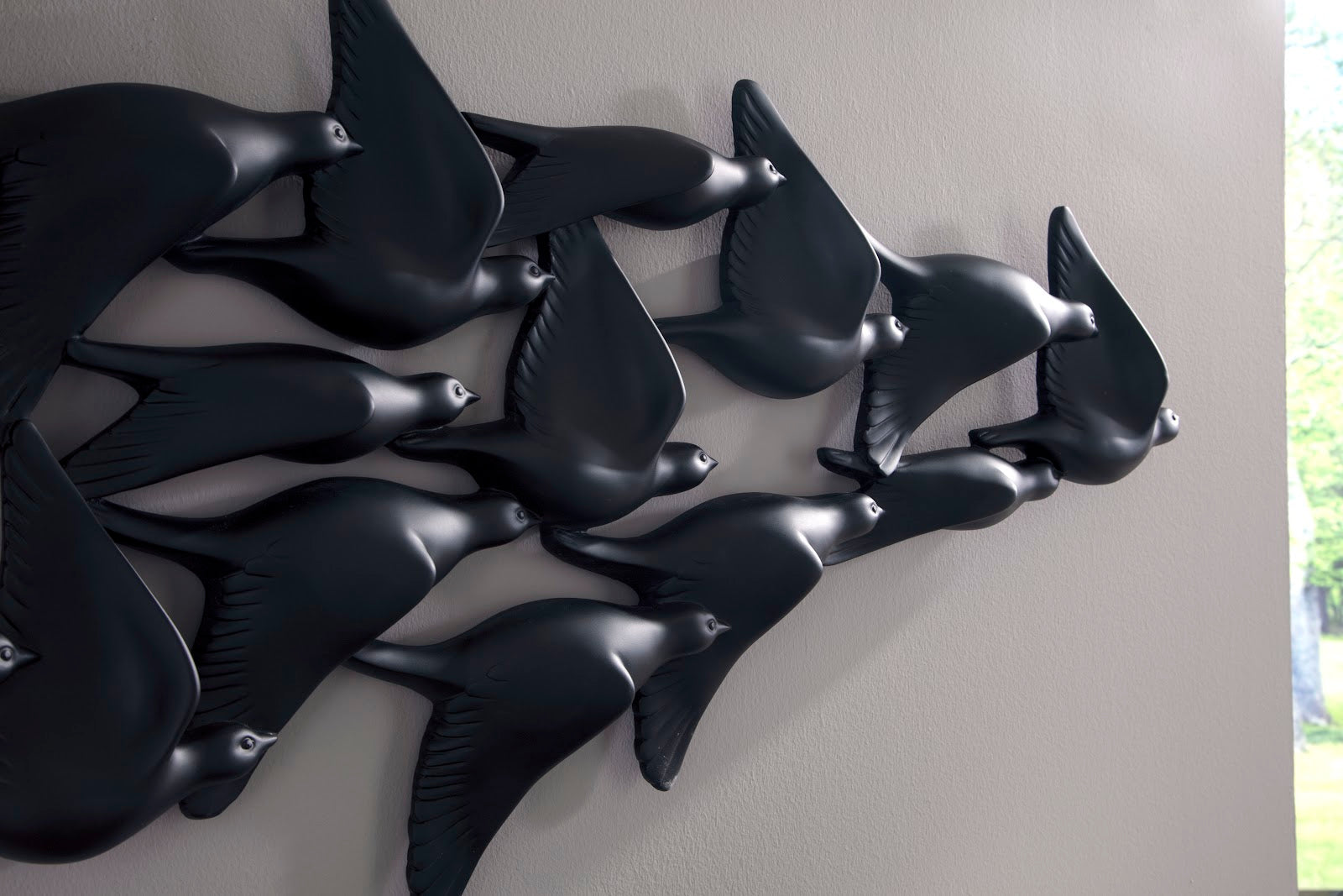 Traveling gracefully together in a season of migrating; Our Flock of Birds Wall Art will have an impact on your interior space and will give dimension and depth. Made from artisan-grade resin and finished in matte black, this playful piece of dimensional wall decor features over twenty birds flying from various lengths from the wall that lends an element of depth to the piece.