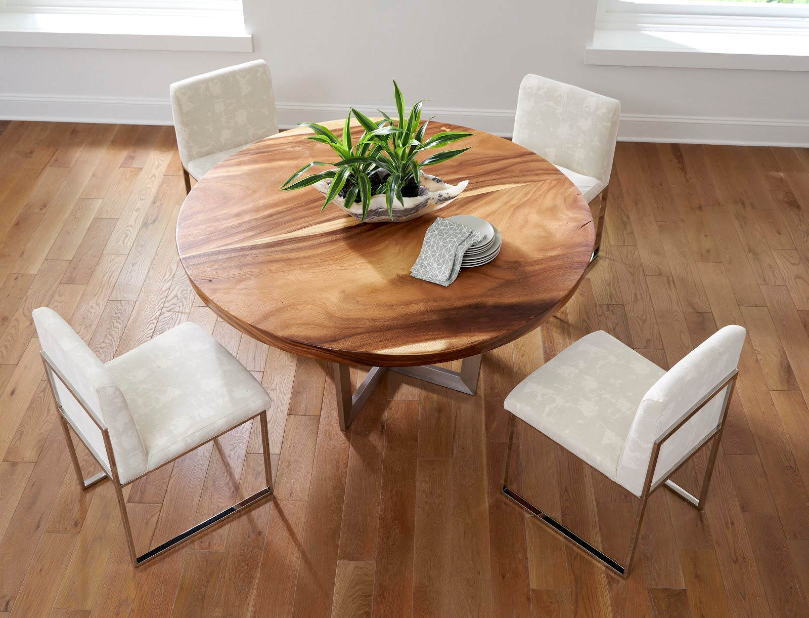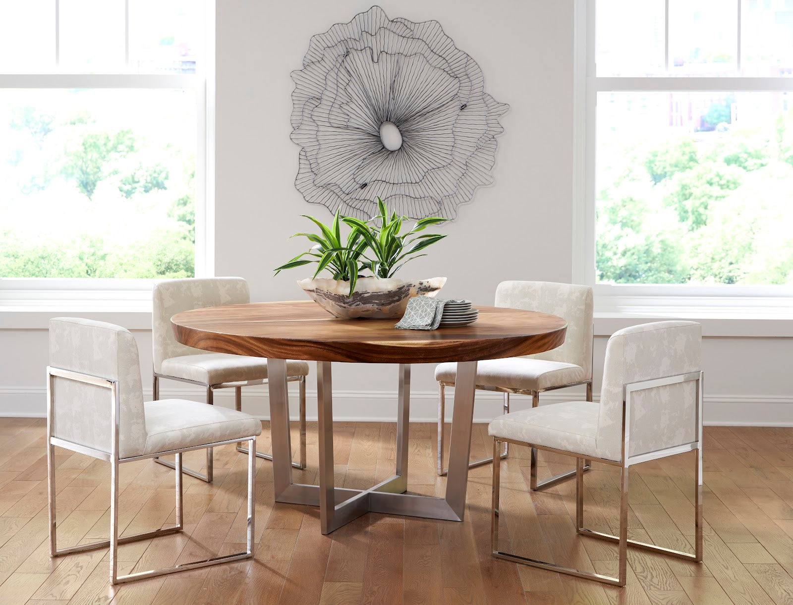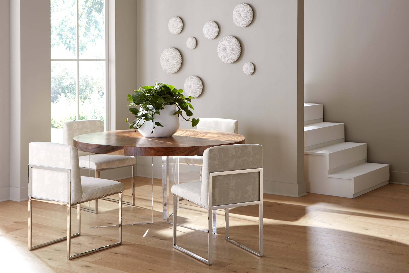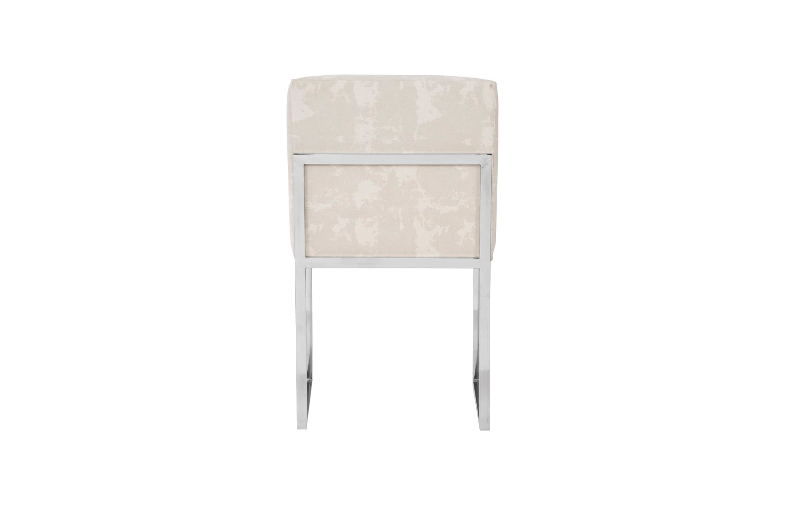 The Frozen Off-White Dining Chair is one of our most popular dining chairs. With its off-white upholstery fabric and stainless-steel frame, it is a shoe-in for both contemporary and mid-century modern interiors because we have tweaked the vintage profile to bring it seriously clean lines. Though it appears it could have been born in the swinging seventies, this is no disco-ball baby, as it was conceived by our design team in the 21st century. We offer a number of upholstery and frame finish options in this collection, and we have arm chairs in the mix. Each of these reflects the ethos that the Phillips Collection personifies: modern organic.