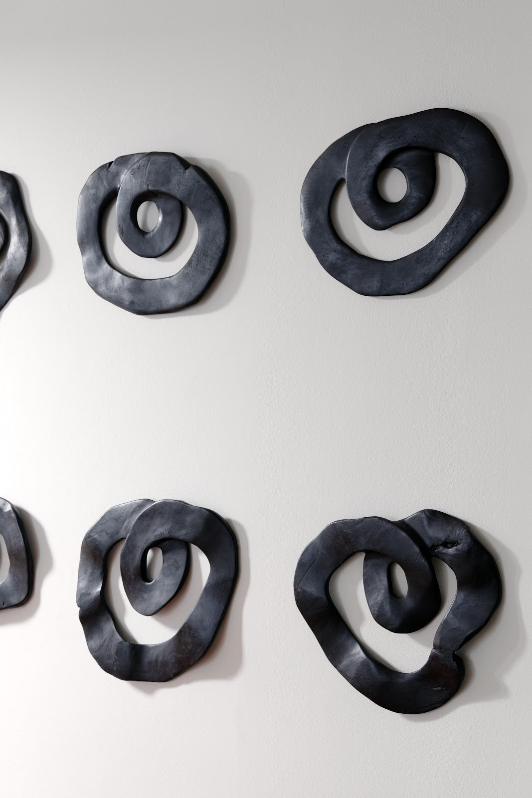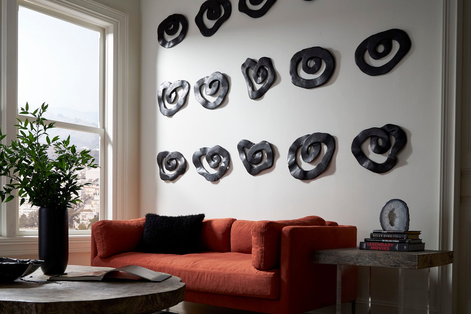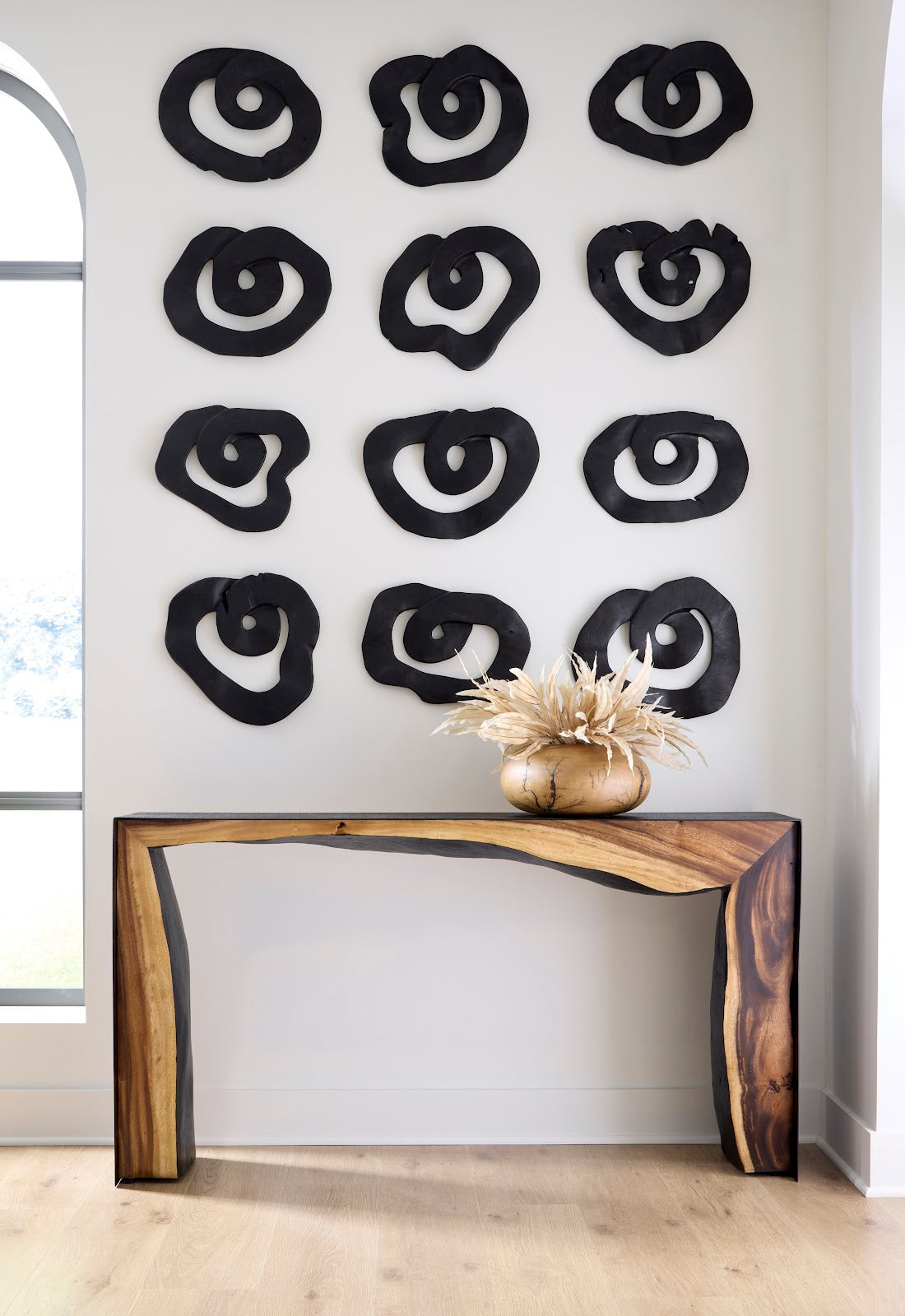 Childlike in its rendering, the Swirl Black Wall Tile will bring a hint of whimsy to a room. This round teak wall tile is lively when hung singly but group them in an arrangement and watch them gain even greater felicity. The warmth of the teak and the powerful woodgrain on the surface of the circlet would normally make this wood sculpture traditional in style but the clean lines of the rings bring it a modern organic vibe for which Phillips Collection is known.