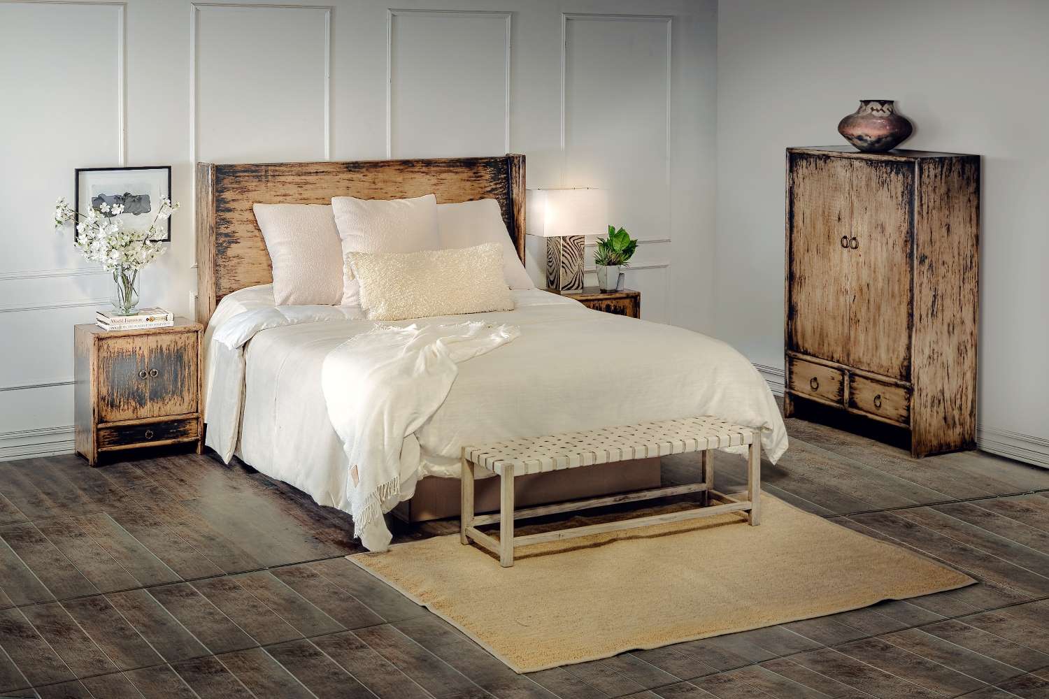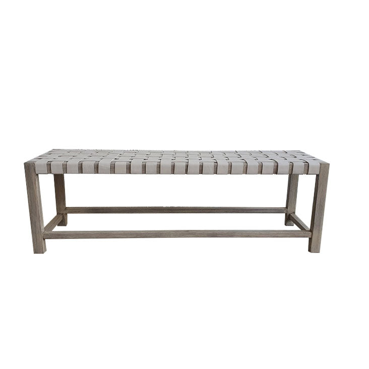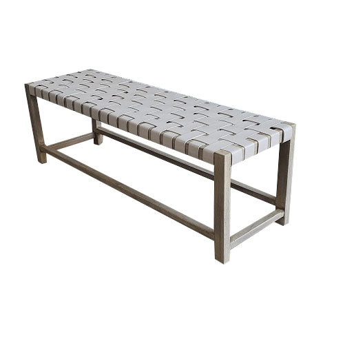 This transitional wooden frame bench is covered with woven vegetable tanned leather finished in a crème tone with a contrasting base. It is an ideal bench for the foot of the bed in your master or guest bedrooms.
