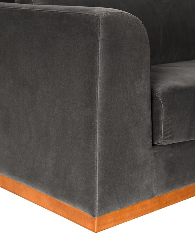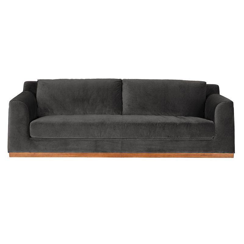 This three-seater sofa features rich charcoal velvet upholstery with gently sloped track arms, deep seat cushions, and a tailored silhouette. A grounded warm walnut plinth base adds architectural contrast and a contemporary foundation.