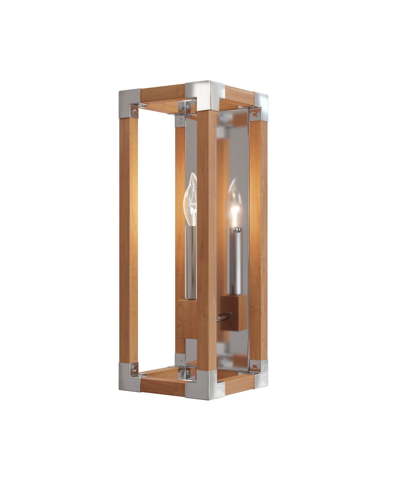 The Boyd Nickel Wall Sconce is made of teak, which is accentuated with metal in a polished nickel finish that wraps around the corners of the rectangular shape and clads the back surface to make it appear mirrored. A block of teak serves as a bobeche to hold the candle-sleeve that is also in polished nickel. At 16.25 inches tall, the one-light sconce is damp rated and dimmable.
