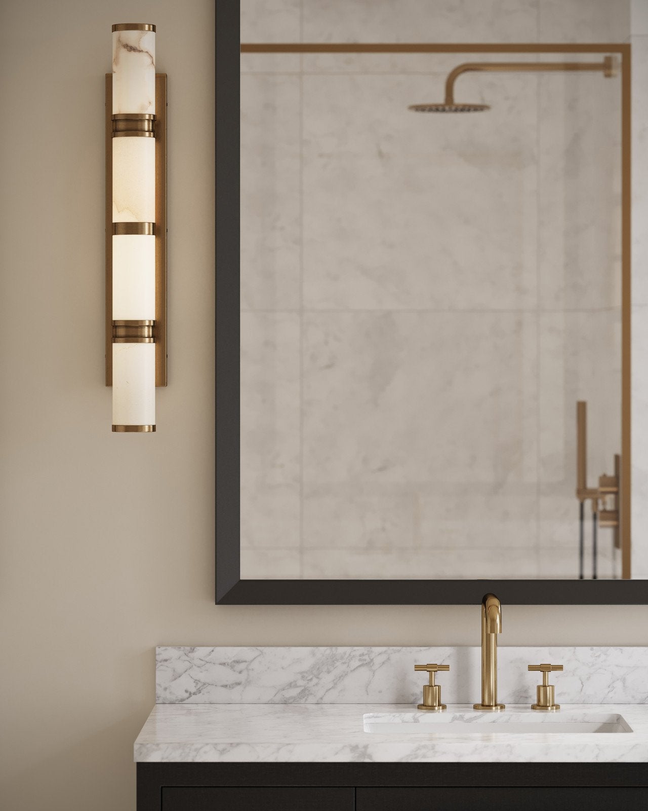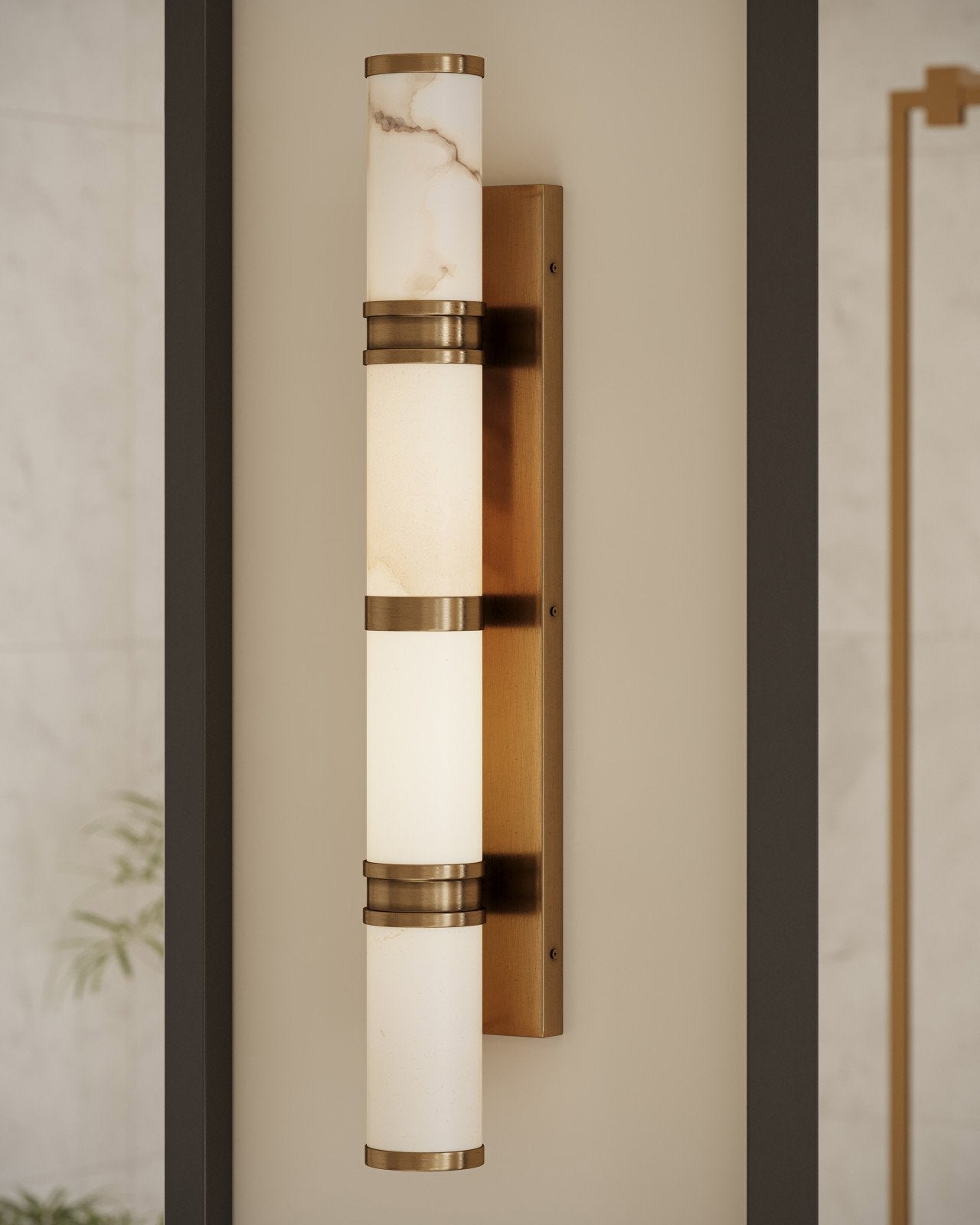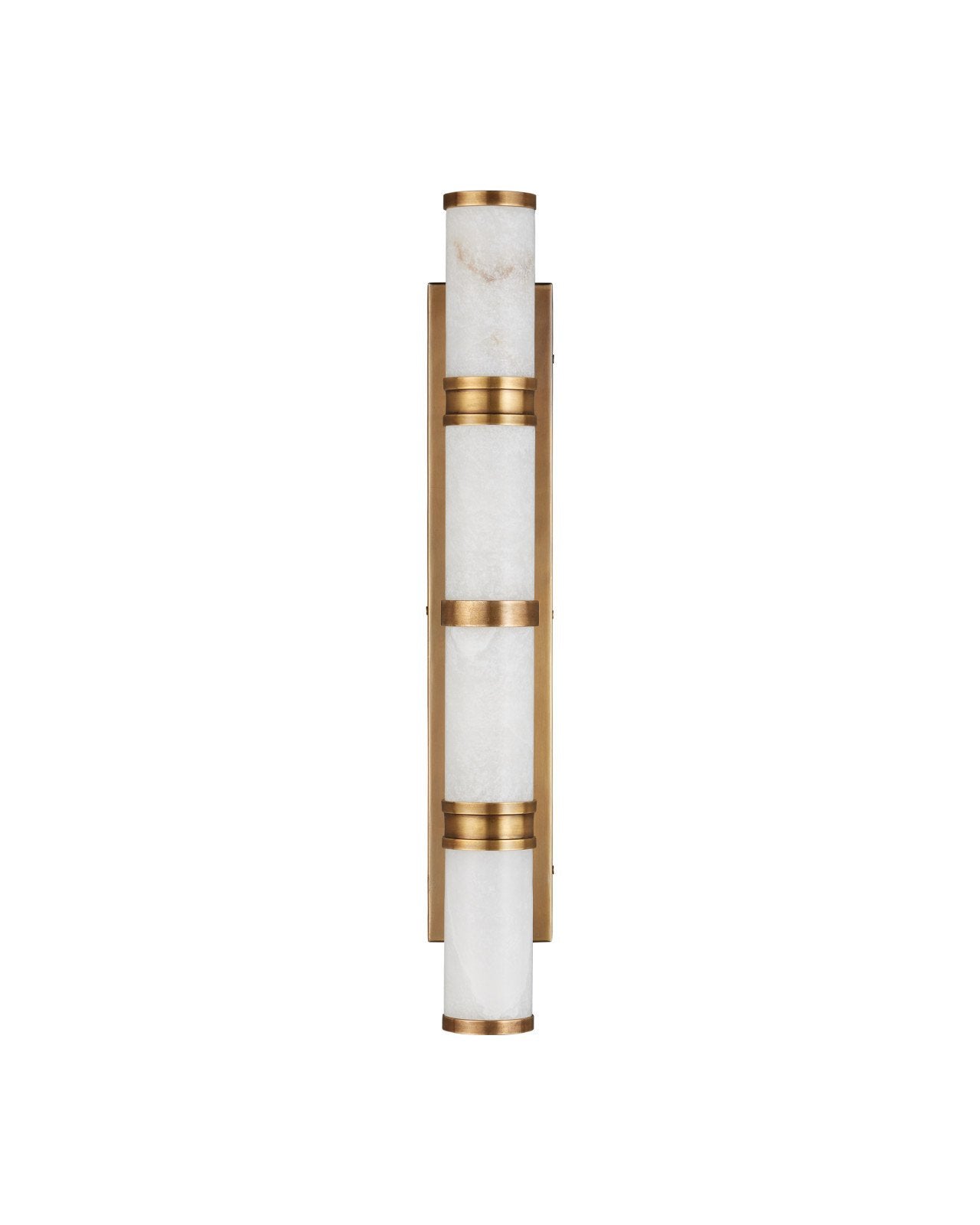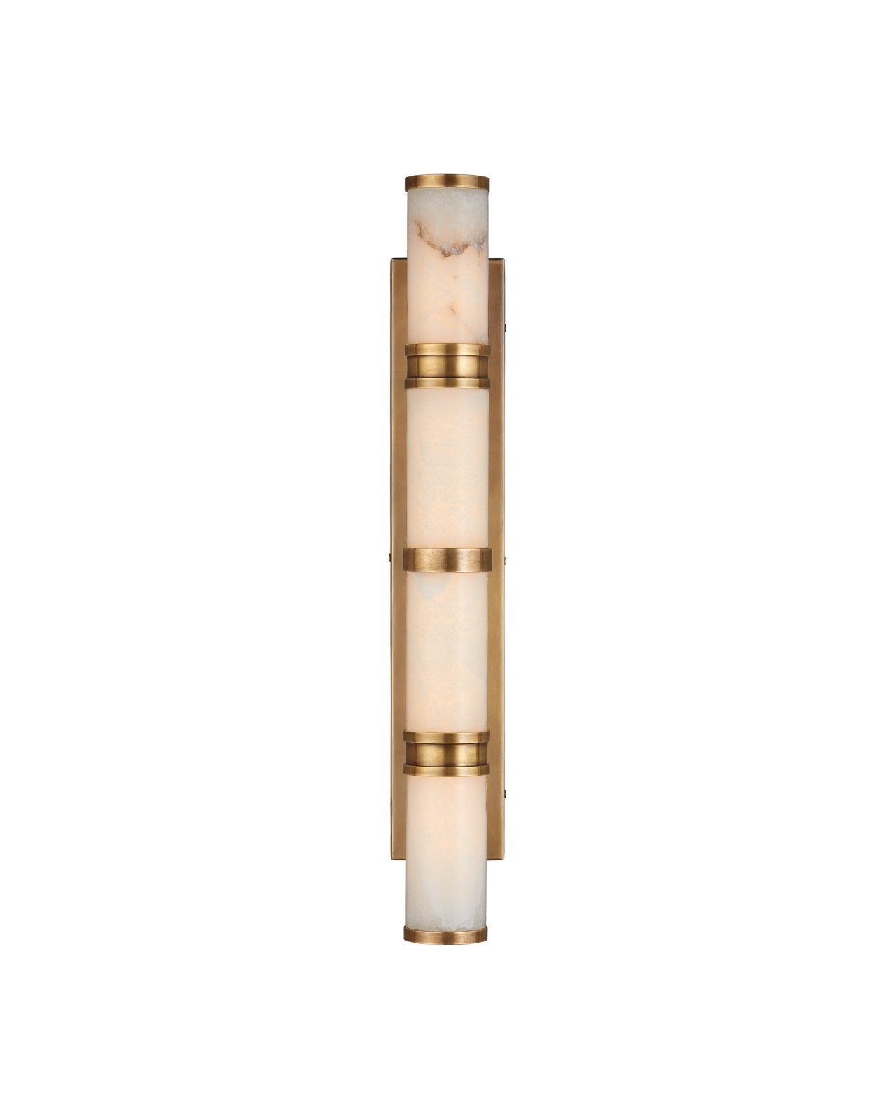 The Brenham Large Brass Wall Sconce features bands of cast brass in a vintage brass finish that secure alabaster tubes to the wallplate. The natural veining in the alabaster gives each fixture unique character, with subtle variations in tone and pattern. Designed for versatility, the sconce can be mounted horizontally or vertically, though it is not dimmable.