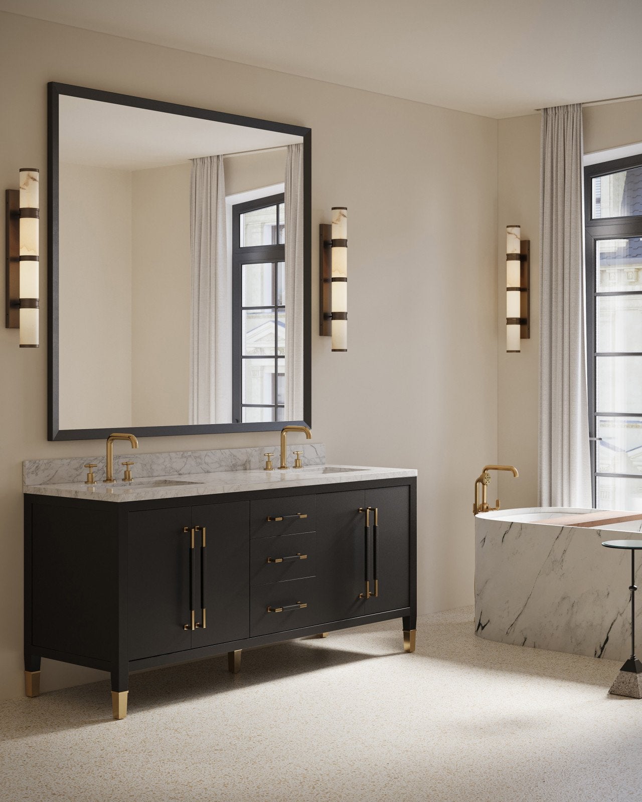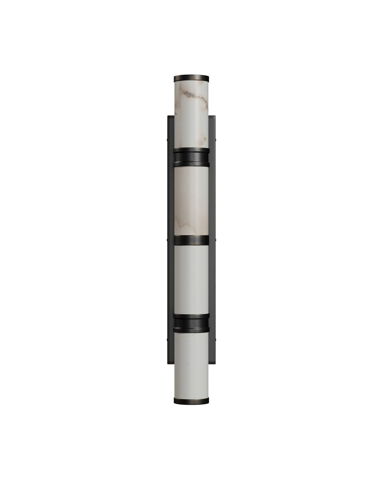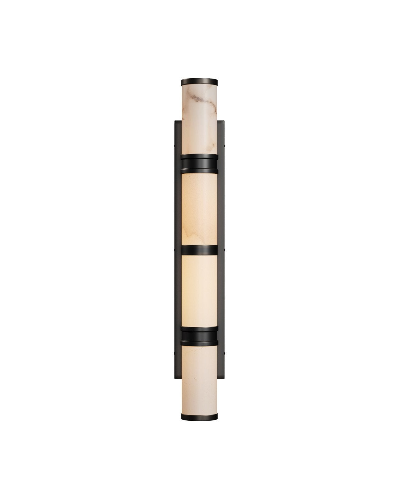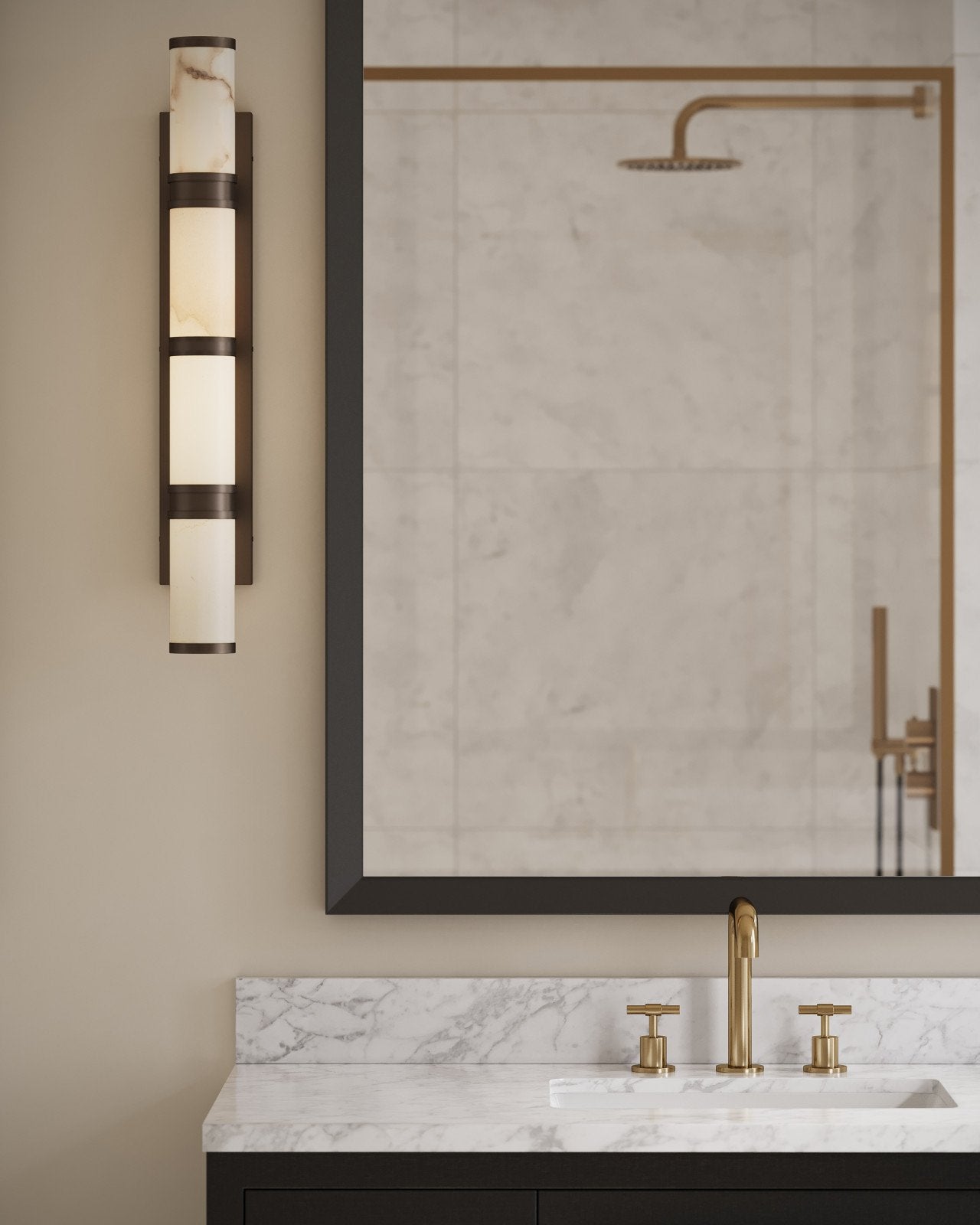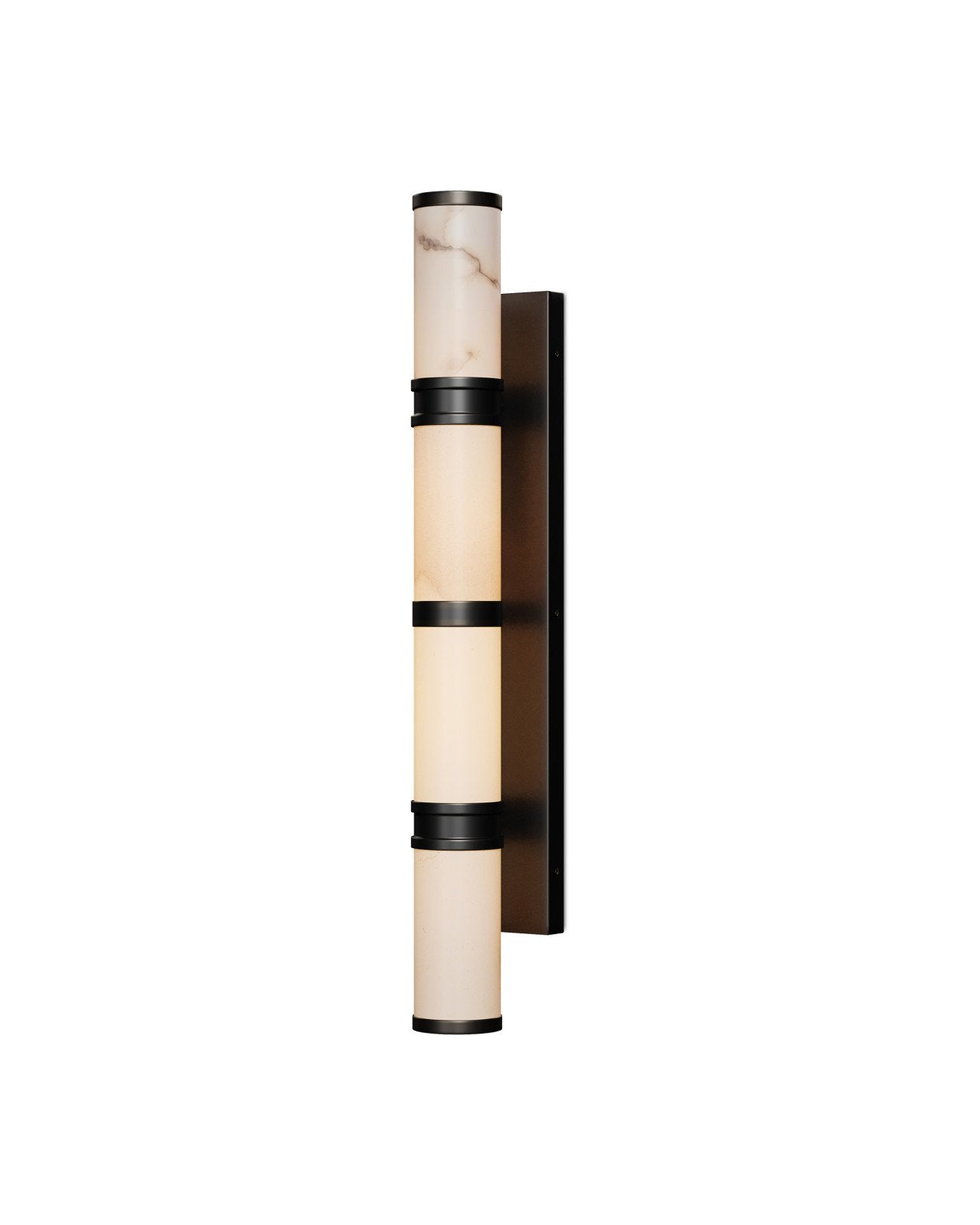 The Brenham Large Bronze Wall Sconce features bands of cast brass in an oil-rubbed bronze finish that secures alabaster tubes to the wallplate. The natural veining in the alabaster gives each fixture unique character, with subtle variations in tone and pattern. Designed for versatility, the sconce can be mounted horizontally or vertically, though it is not dimmable.