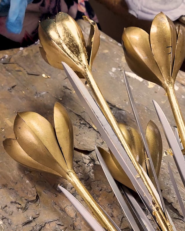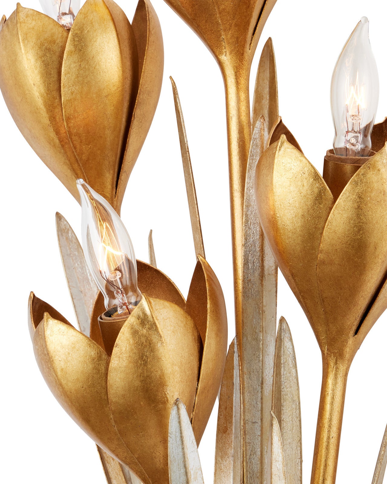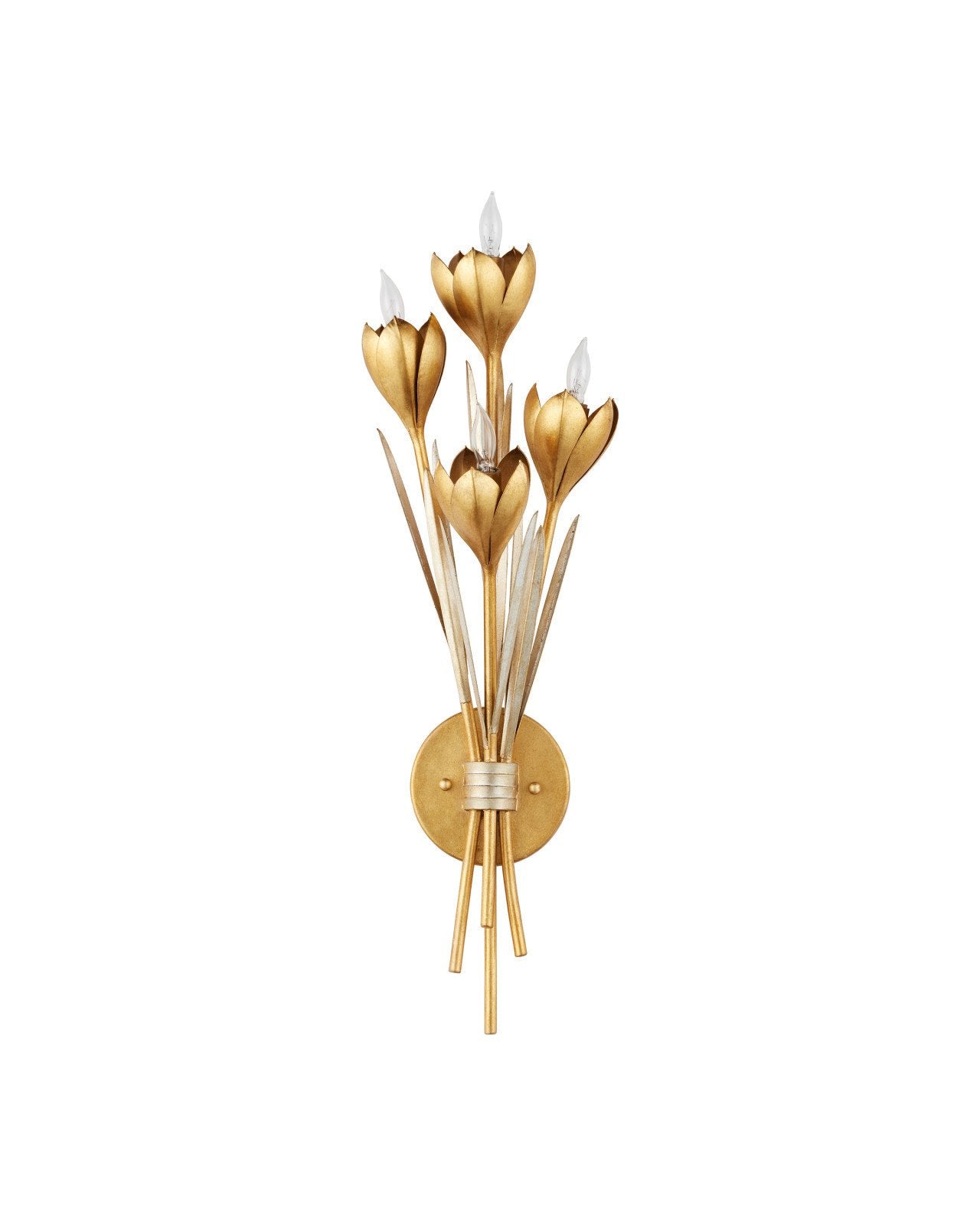 The blossoms that rise from the Hortensia Wall Sconce were inspired by the Crocus flower. The blooms and frame, both made of wrought iron, are covered in a contemporary gold leaf finish while the linear leaves, also in wrought iron, are in a contemporary silver leaf finish. The blossoms on the gold wall sconce imitate their namesake flower so convincingly, they open toward slender bulbs as if they are growing toward the sun. The four-light fixture is dimmable.