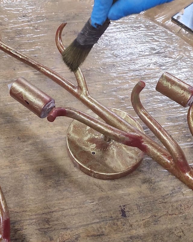 The Morning Grove Wall Sconce, Left, is crafted from wrought iron in a shape that resembles a slender, graceful twig. Finished in Rhine Gold, the branch-like form is adorned with elongated crystal drops that hang like icicles, catching and reflecting the light. The combination of textured metal and shimmering glass creates a refined design with a natural edge. The two-light sconce is dimmable for creating a softer glow when desired.
