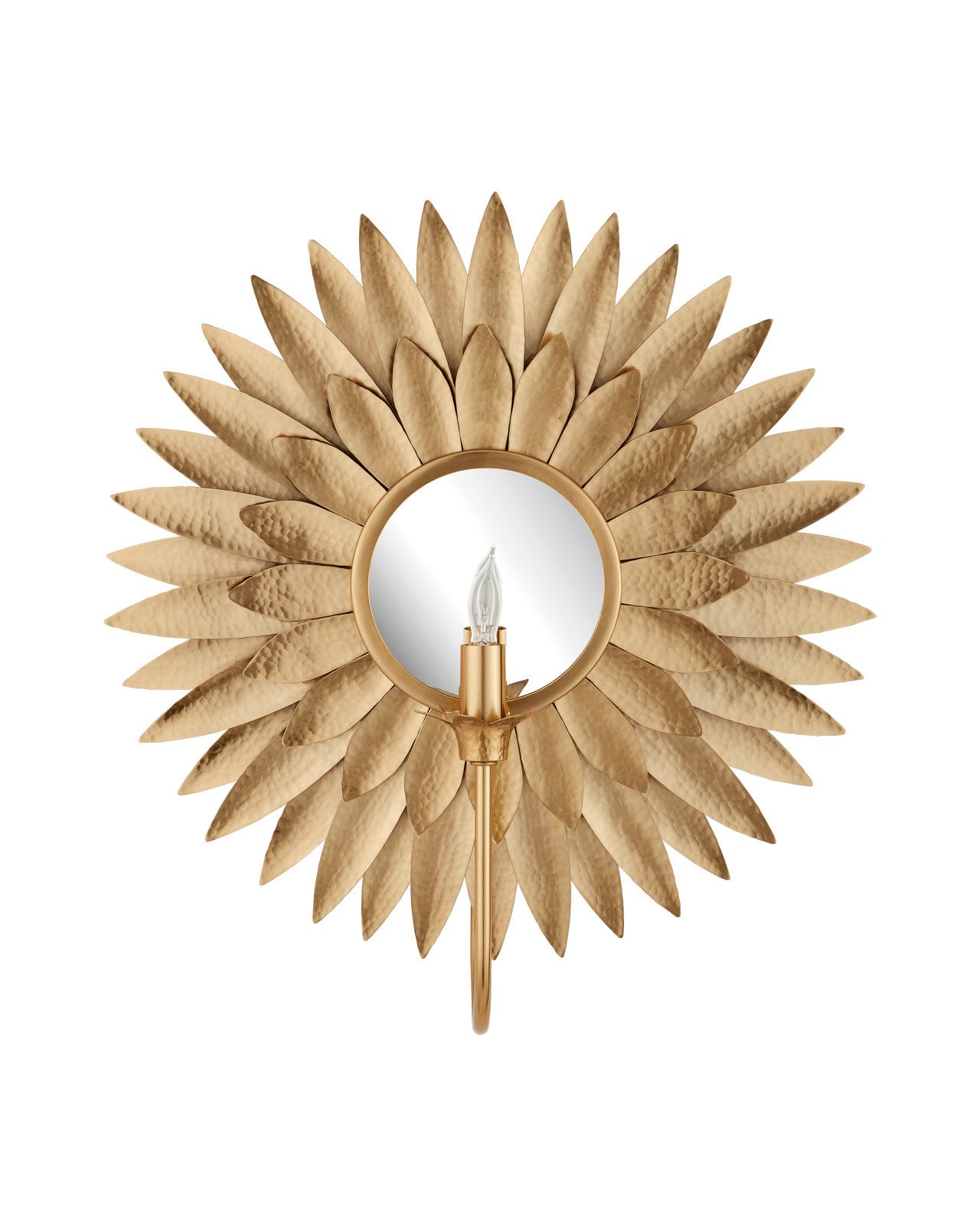The Plumage Wall Sconce features two even rows of hammered brass leaves in an antique brass finish that flow around its circular frame, while smaller leaves serve as a bobeche. The overlapping leaves fan out around a disc of mirrored glass to bring the design texture and contrast. The one-light fixture is dimmable for creating ambience in the evenings and the hammering on the surface of the metal may create subtle differences from sconce to sconce.