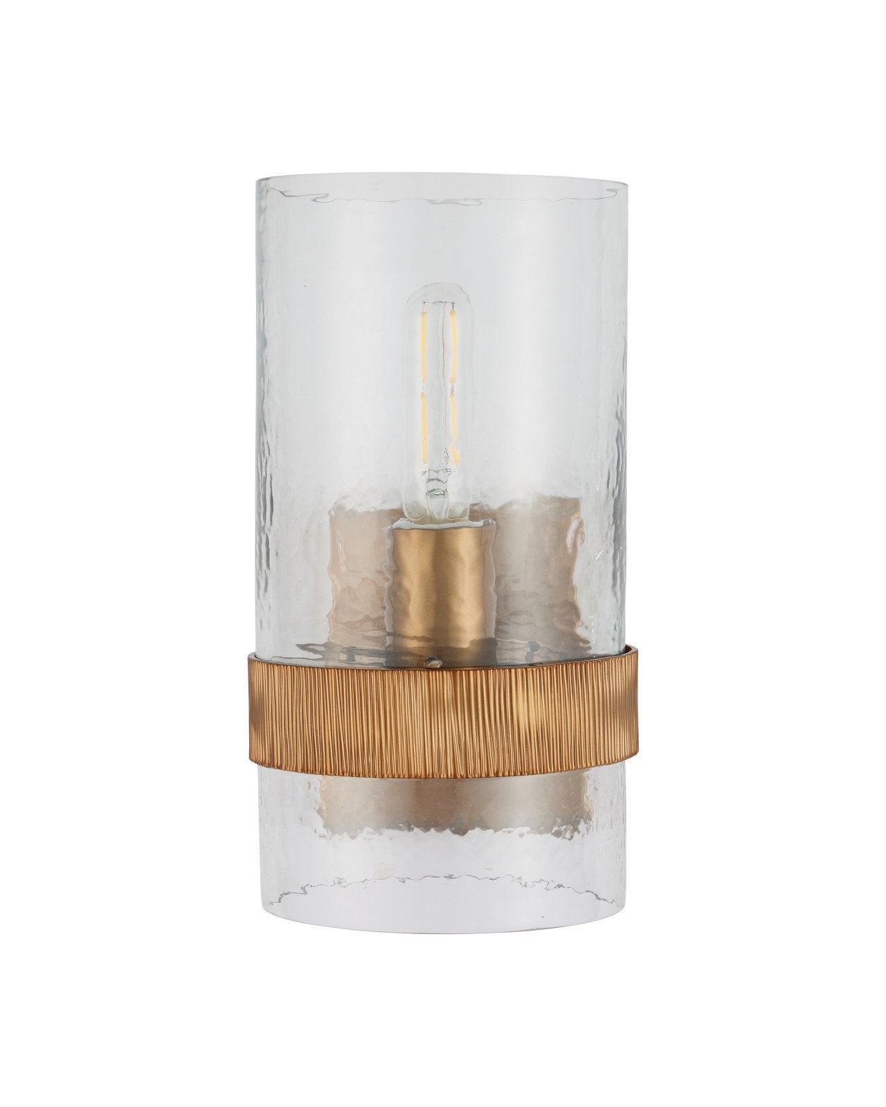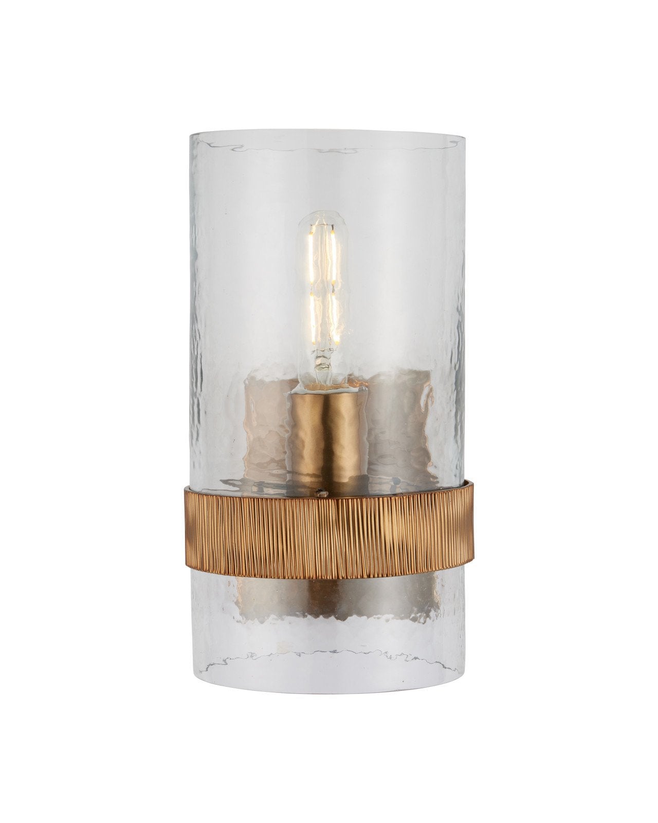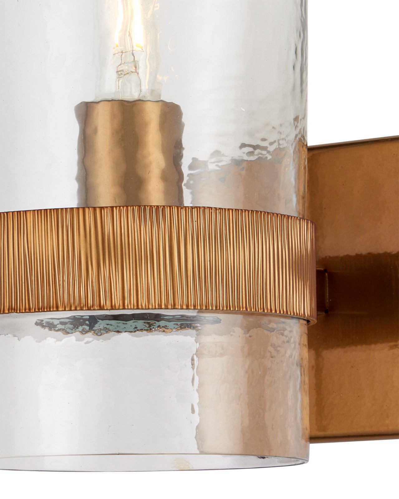 The Sudeley Wall Sconce features a cylindrical canister shade made of thick hammered glass that gives the piece both weight and texture. The glass is secured by a reeded iron band in a satin brass finish, adding a refined accent. Its wallplate has square edges that emphasize a modern profile, while the substantial glass shade diffuses the light with a soft, dappled glow. The one-light sconce is dimmable, and there will be subtle variations in the hammered glass from fixture to fixture.