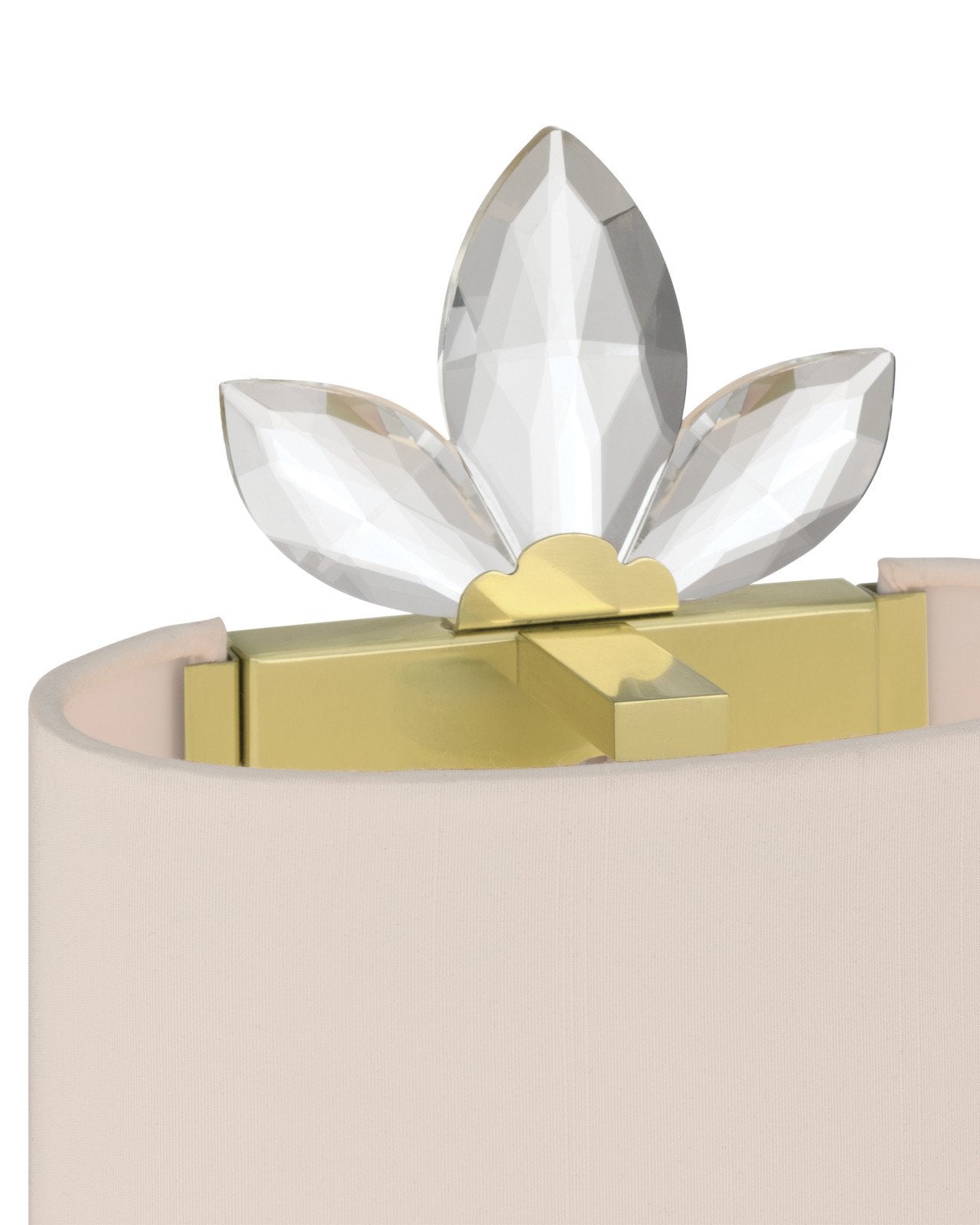 The Trillium Wall Sconce is made of brass in a gold finish and accented with three optic crystals that extend above the shade like a blooming flower. Its narrow profile means the design is ADA compliant, while a simple stem extends below the shade for a clean, understated detail. The Trillium is dimmable to create softer moods after sunset when a muted ambience is desired.