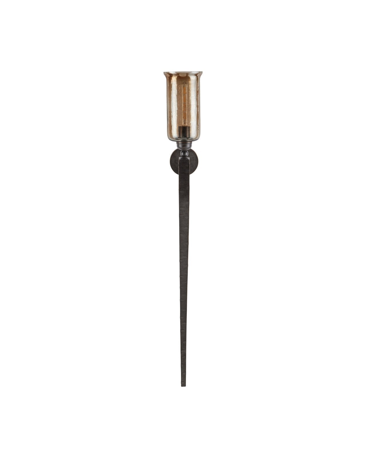 The Wemyss Wall Sconce is a large-scale design with a curling ribbon of iron that folds beneath the bobeche, the black metal in a gilded oak wood finish. Above the bobeche, a smoke hammered-glass canister encloses an elongated bulb, its textured surface dappling the glow. The bold form and warm finish give the sconce a distinctive Americana character. The one-light sconce is dimmable, and there will be subtle variations in the hammered glass from fixture to fixture.